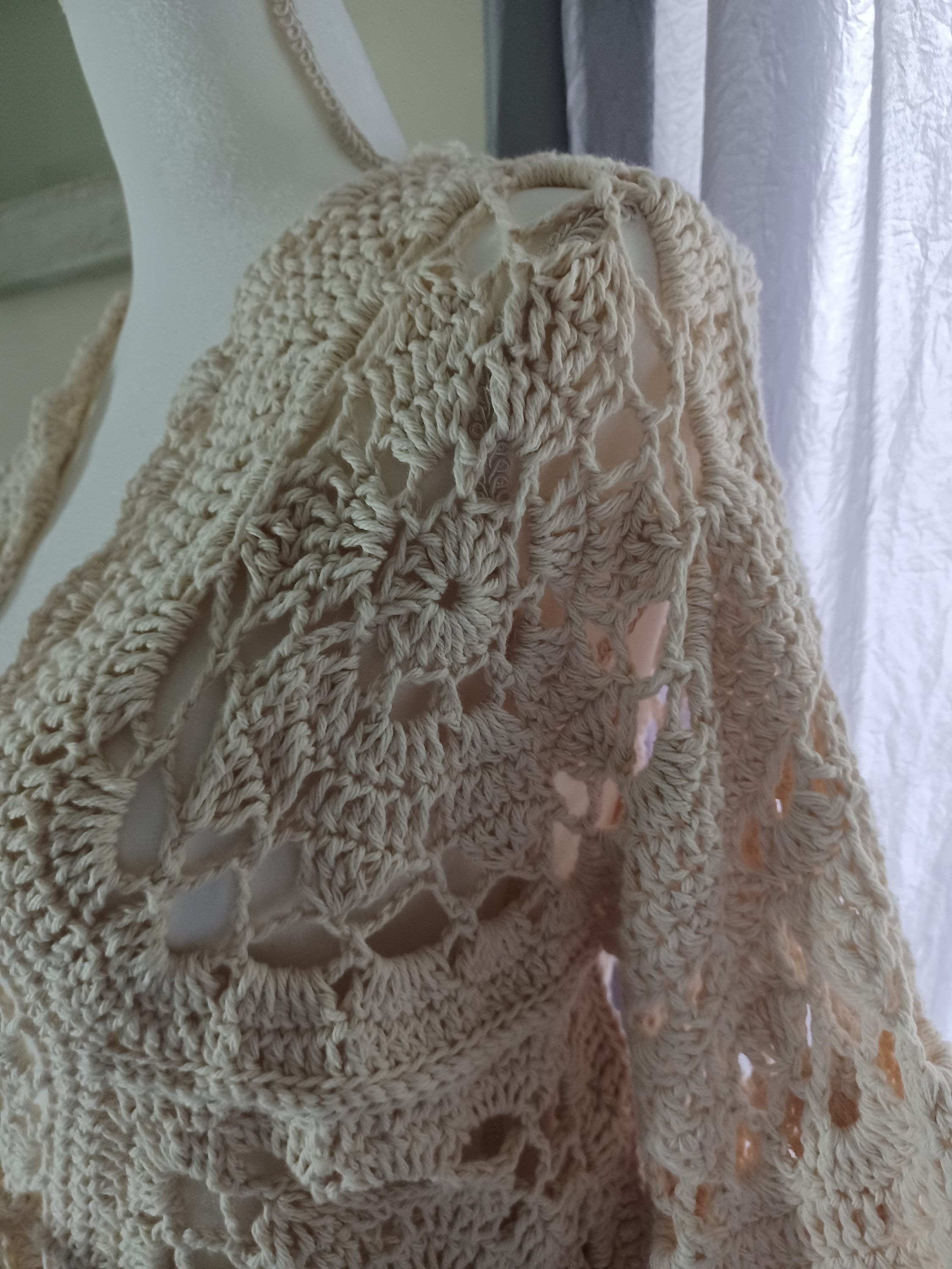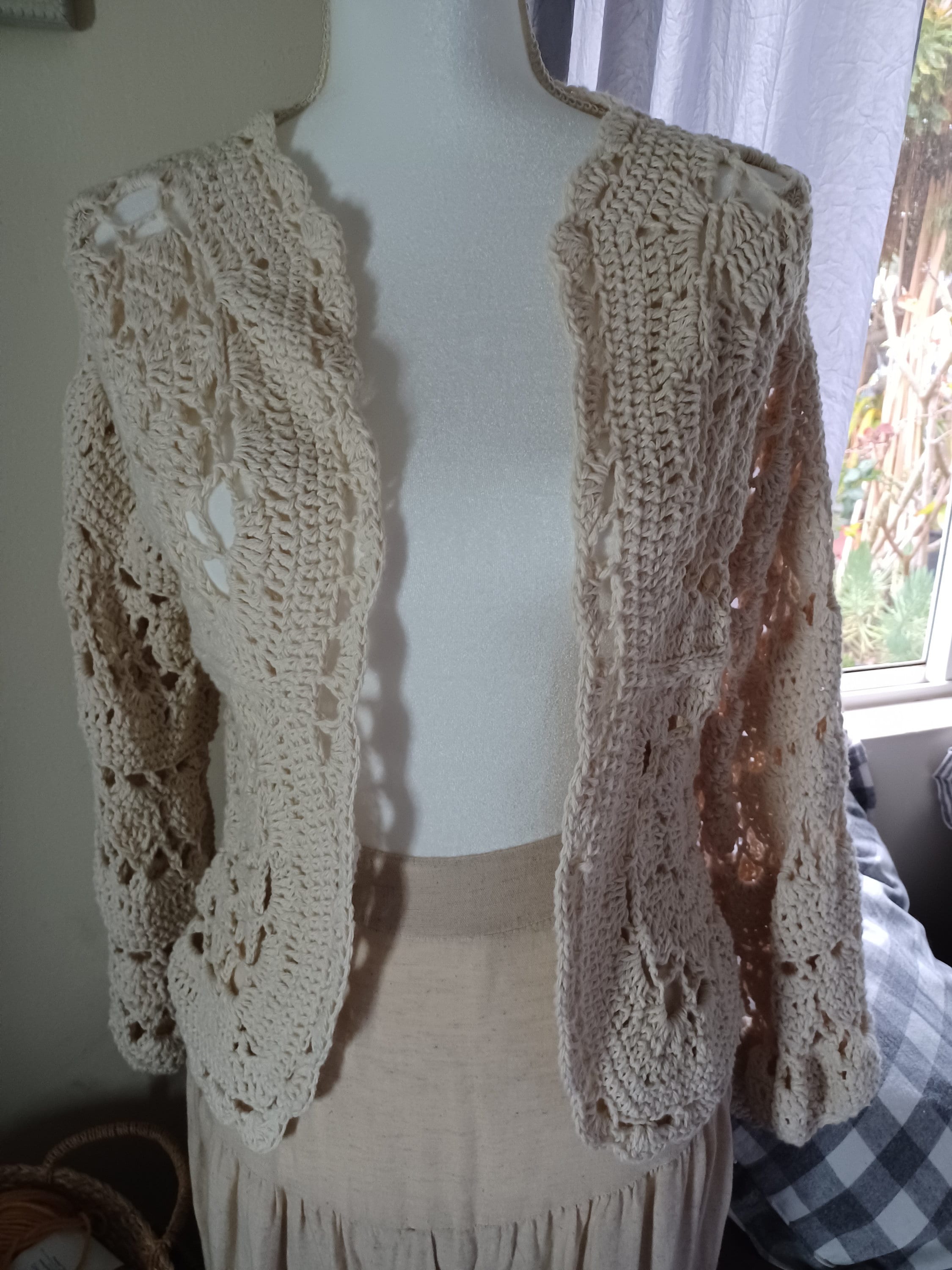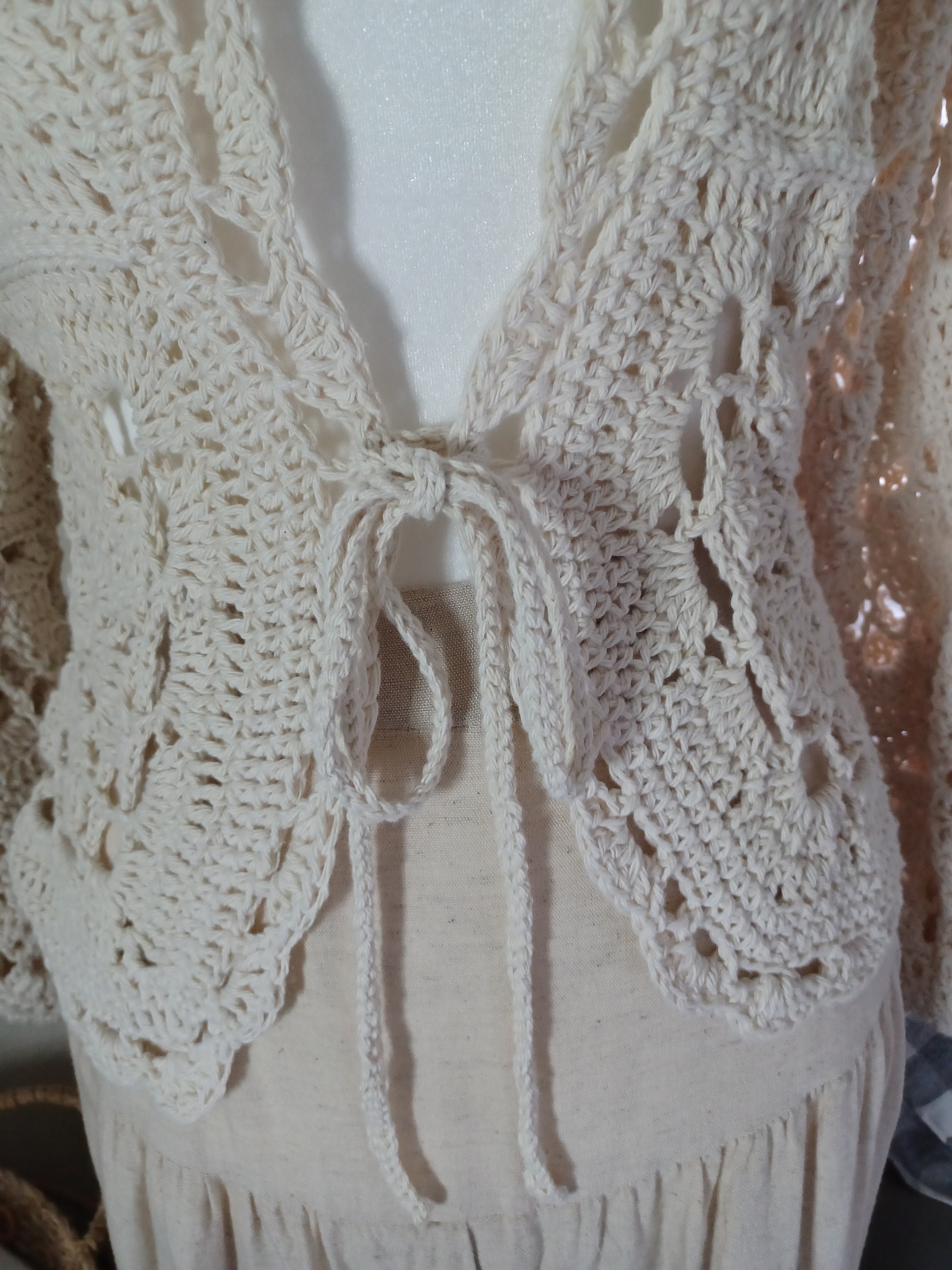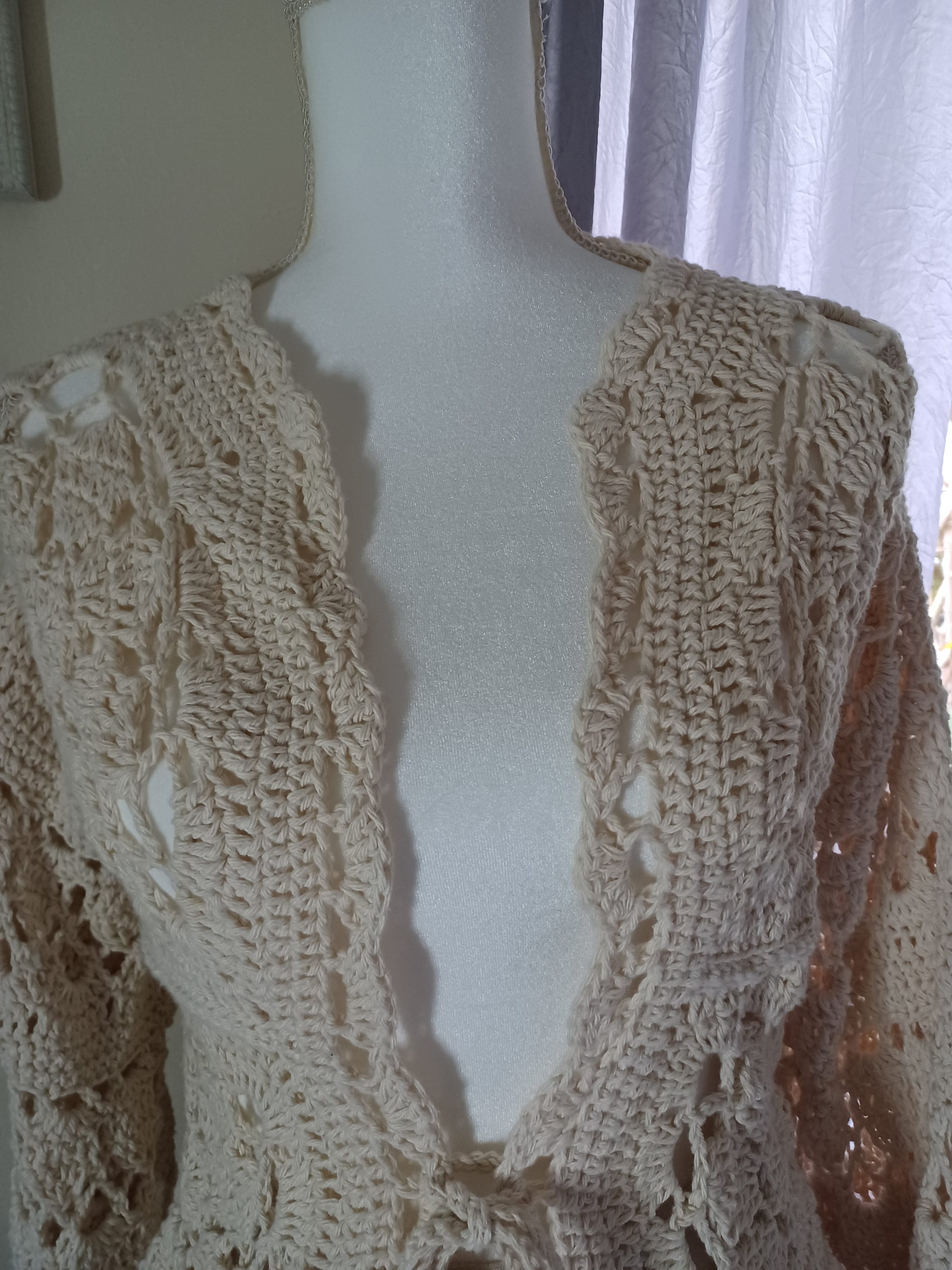 Immerse yourself in timeless charm with this crochet beige floral lace cardigan, meticulously crafted from luxurious 100% cotton yarn. The vintage-inspired square floral lace design on its long, lacy puffy sleeves receives a contemporary twist, making this piece a unique and easy-to-wear cardigan. Its versatility knows no bounds, effortlessly transitioning from polished elegance when layered over a dress to casual chic when paired with jeans or a skirt and tank top ensemble. From day wear to evening affairs, this beautiful cardigan effortlessly adapts to any occasion, promising sophistication and style with every wear.