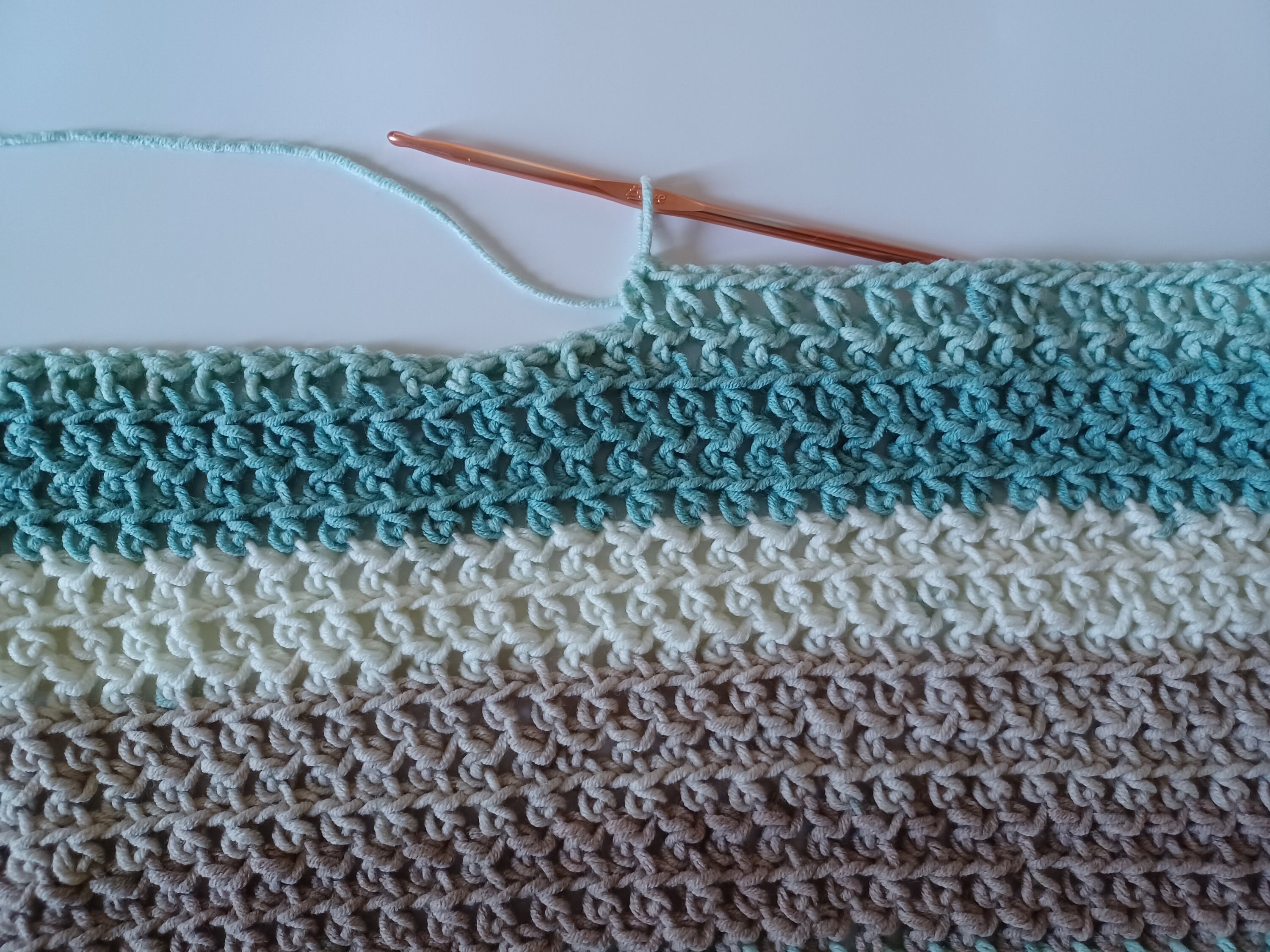 The solid and stripe shades in Caron Cotton Cakes coordinate perfectly for your Spring/Summer. This soft, versatile yarn with its unique cotton blend and larger ball size is ideal for this light blanket. The blanket is a simple rectangle worked from bottom to top, in rows of half double crochet stitch in back loop only. Simple construction makes this a very meditative stitching project. To finish, do not fasten off, work a SC border around the perimeter of the blanket. Cut yarn and fasten off.