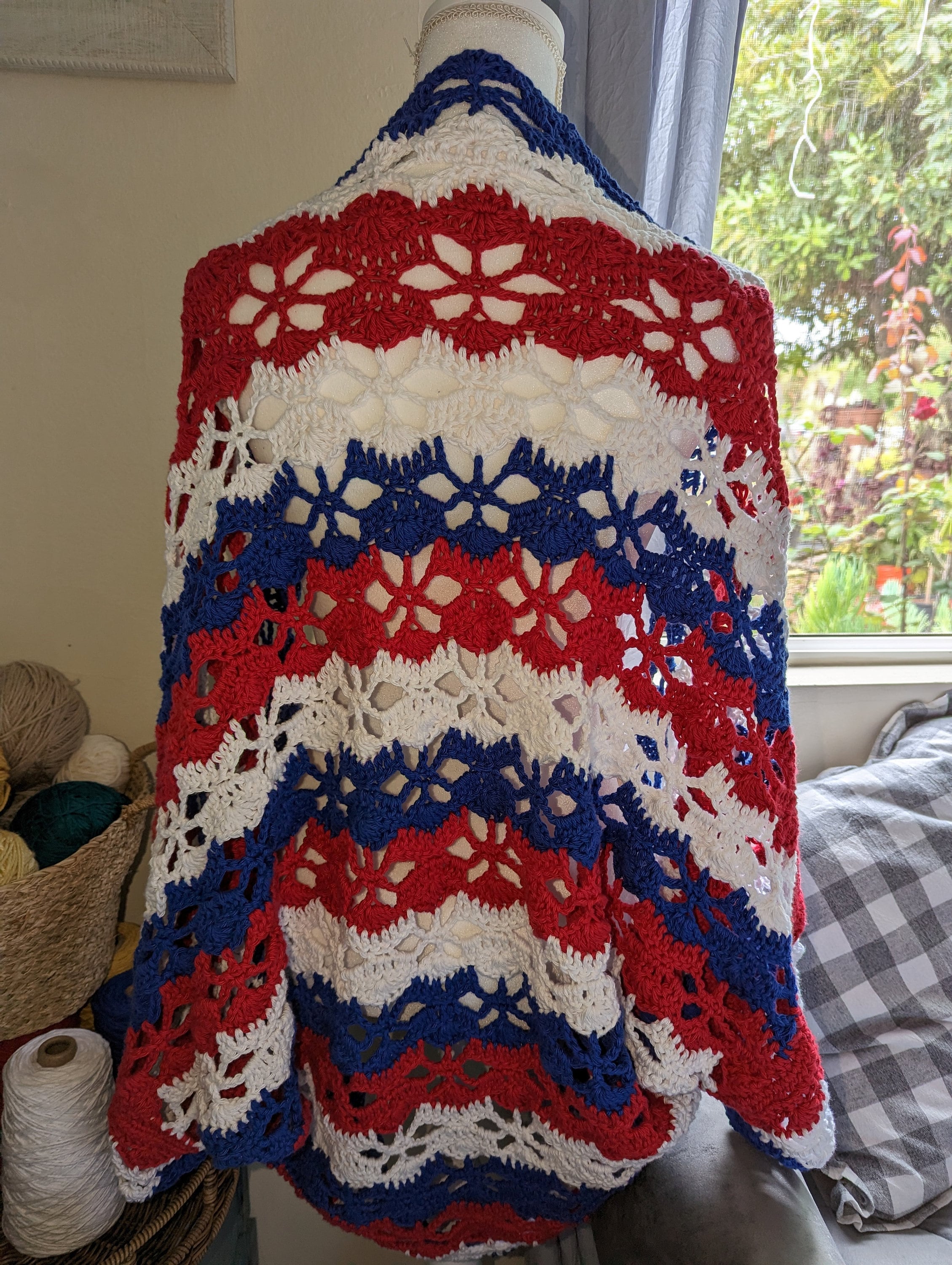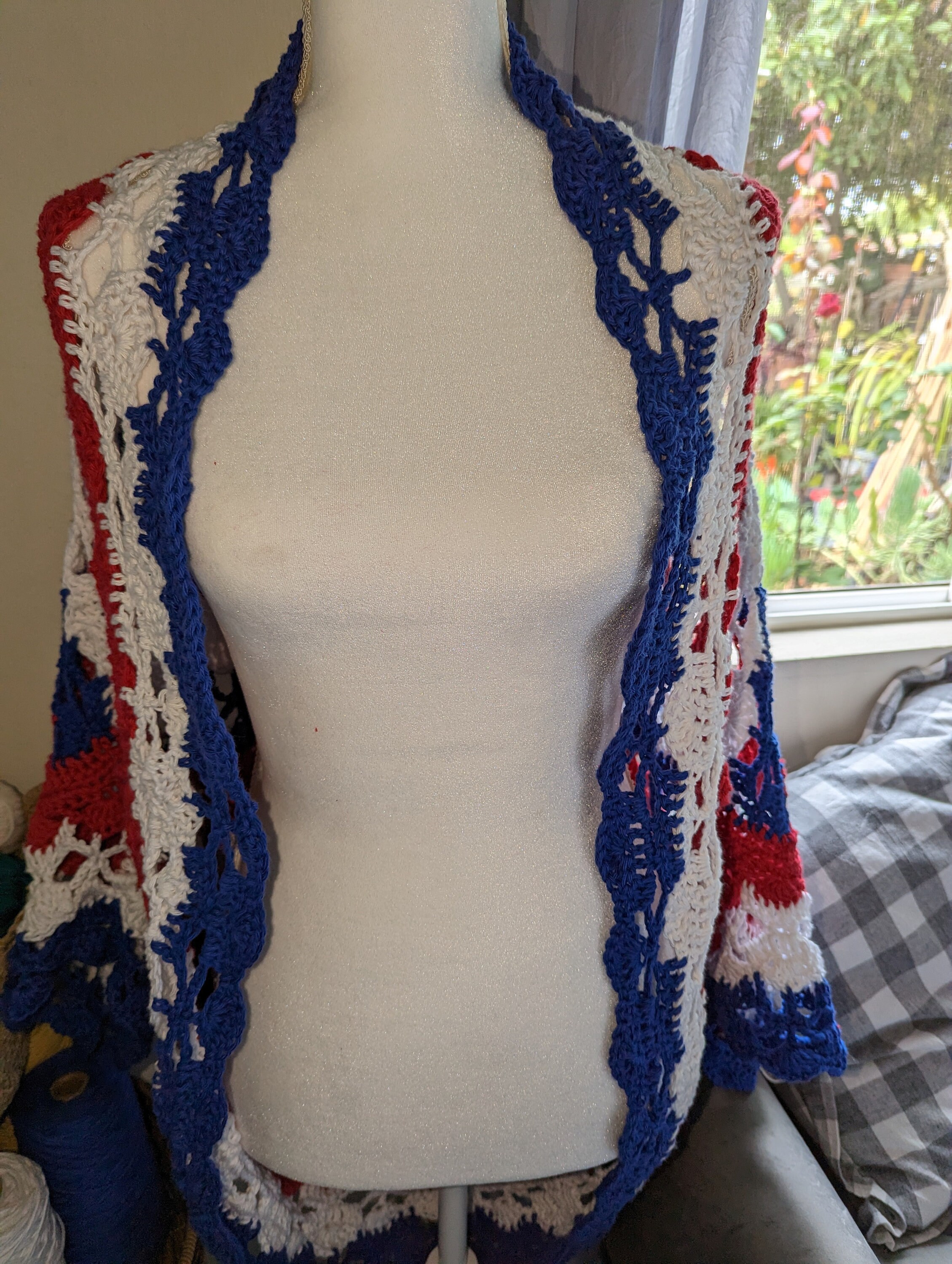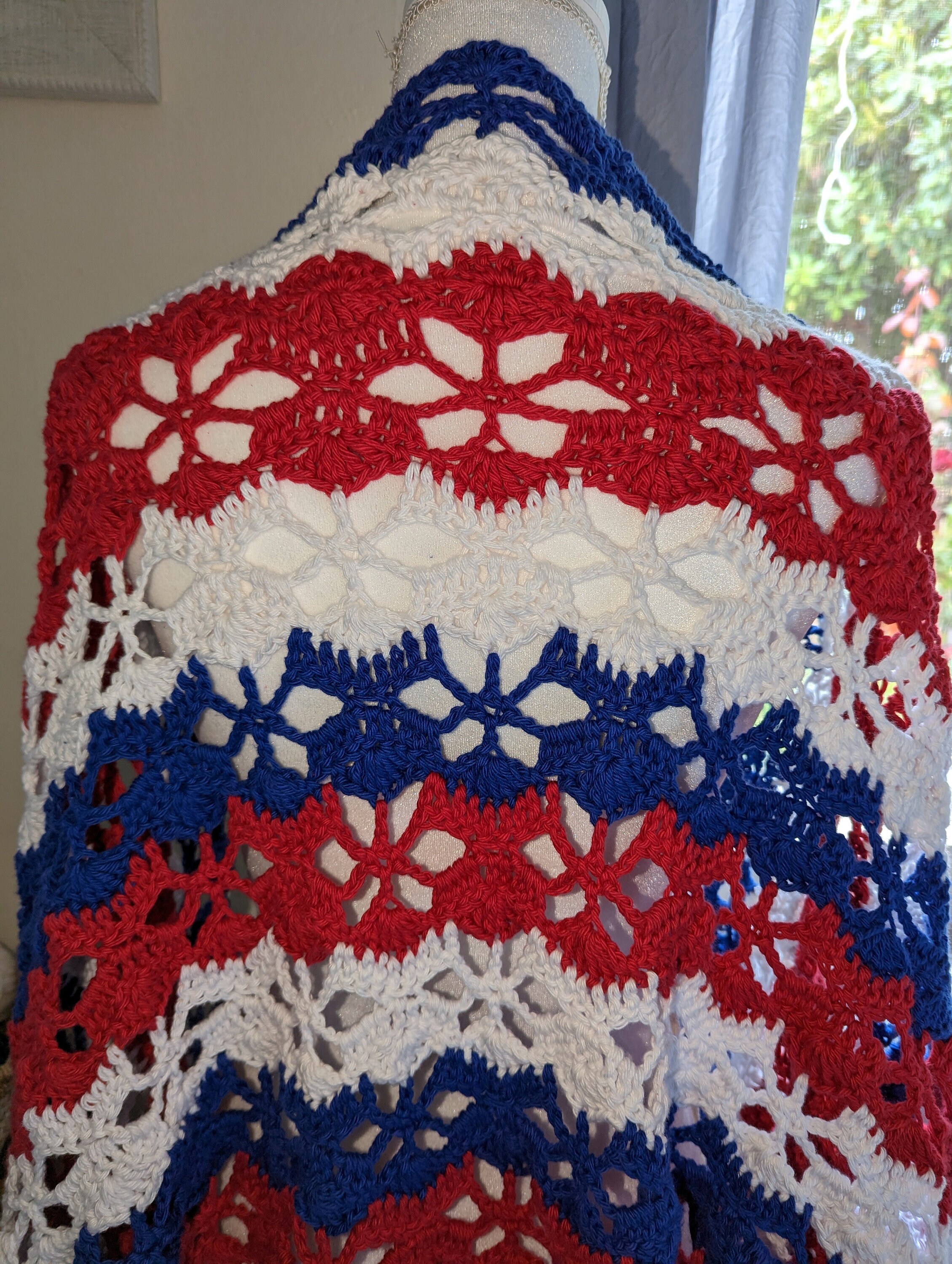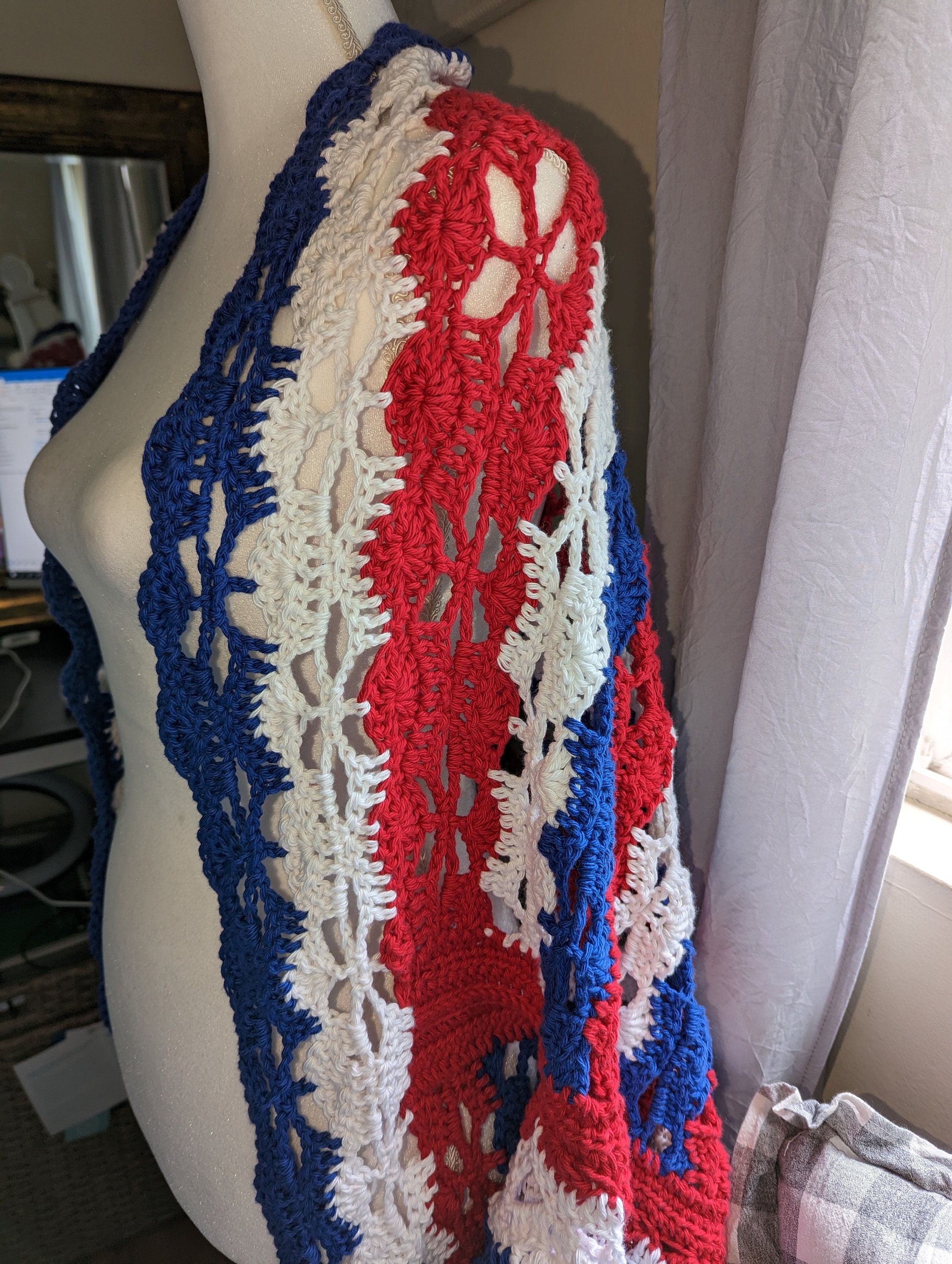 The American Star Lace Crochet Shrug pattern is light and breezy. This shrug will keep you warm during chilly spring and summer evenings on the porch or out for the evening! The look of this crochet shrug would complement a dress or a cute tank with a pair of jeans. This statement piece will make you stand out from the most fashionable crowd and perfect for a holiday.
