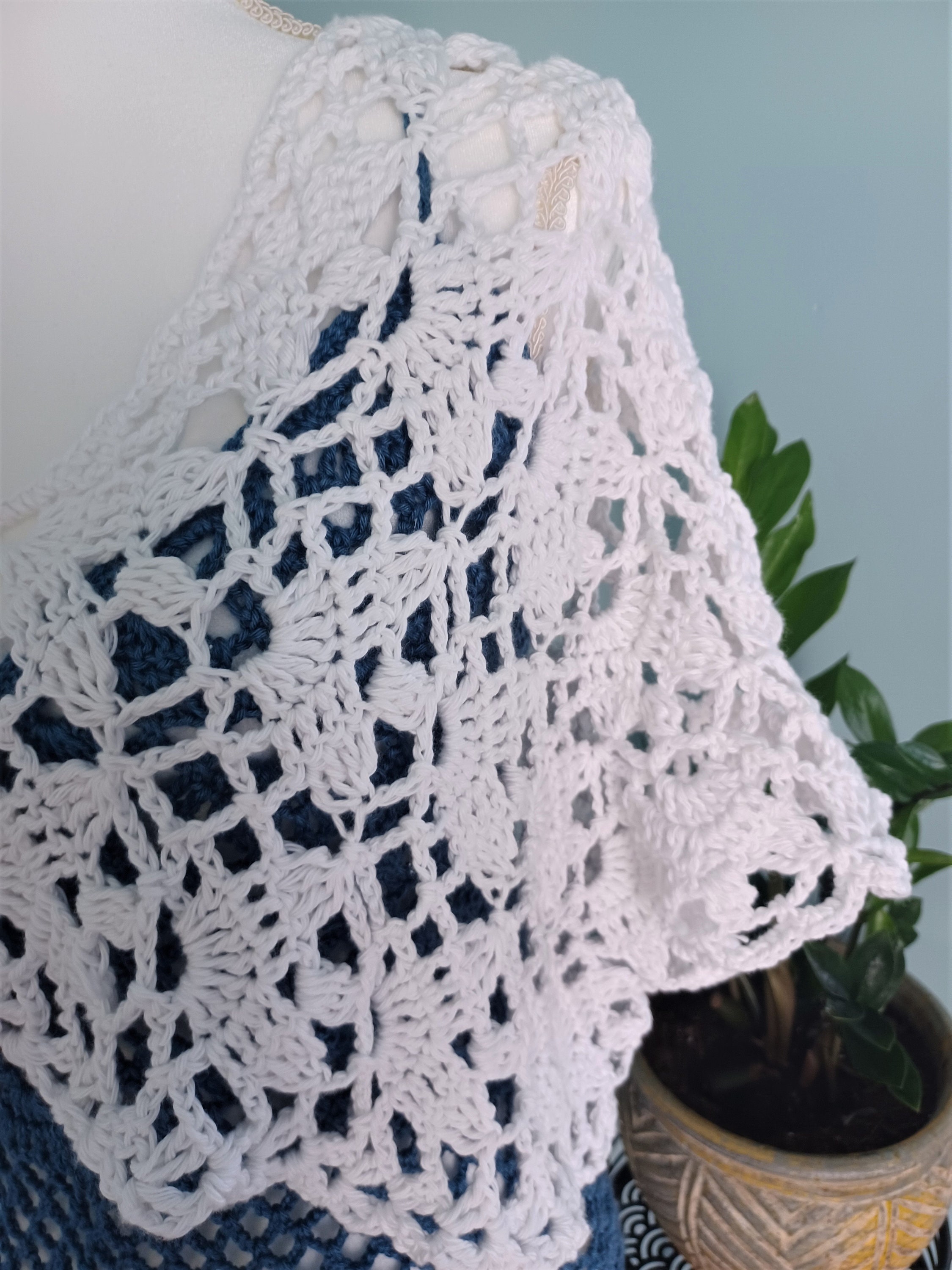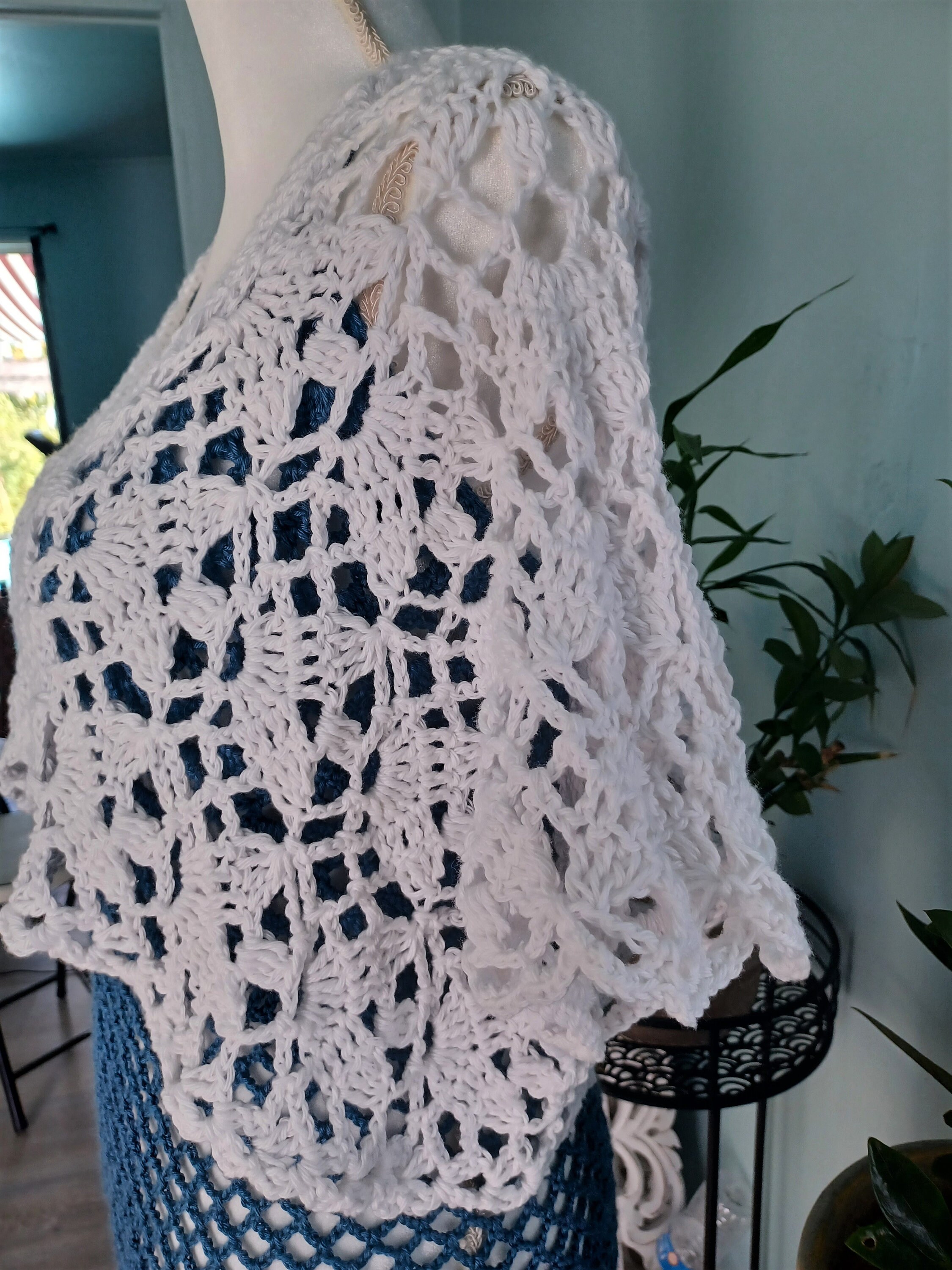This beautiful crochet cropped top is perfect for spring/summer and goes perfectly over a sundress in the spring and summer or to add some flare to an otherwise basic outfit. This beautiful lace top can be worn as a wrap or a beach cover-up. The white crochet lace top is made with 100% cotton yarn. You can make this top with any yarn materials or weight and color of choice