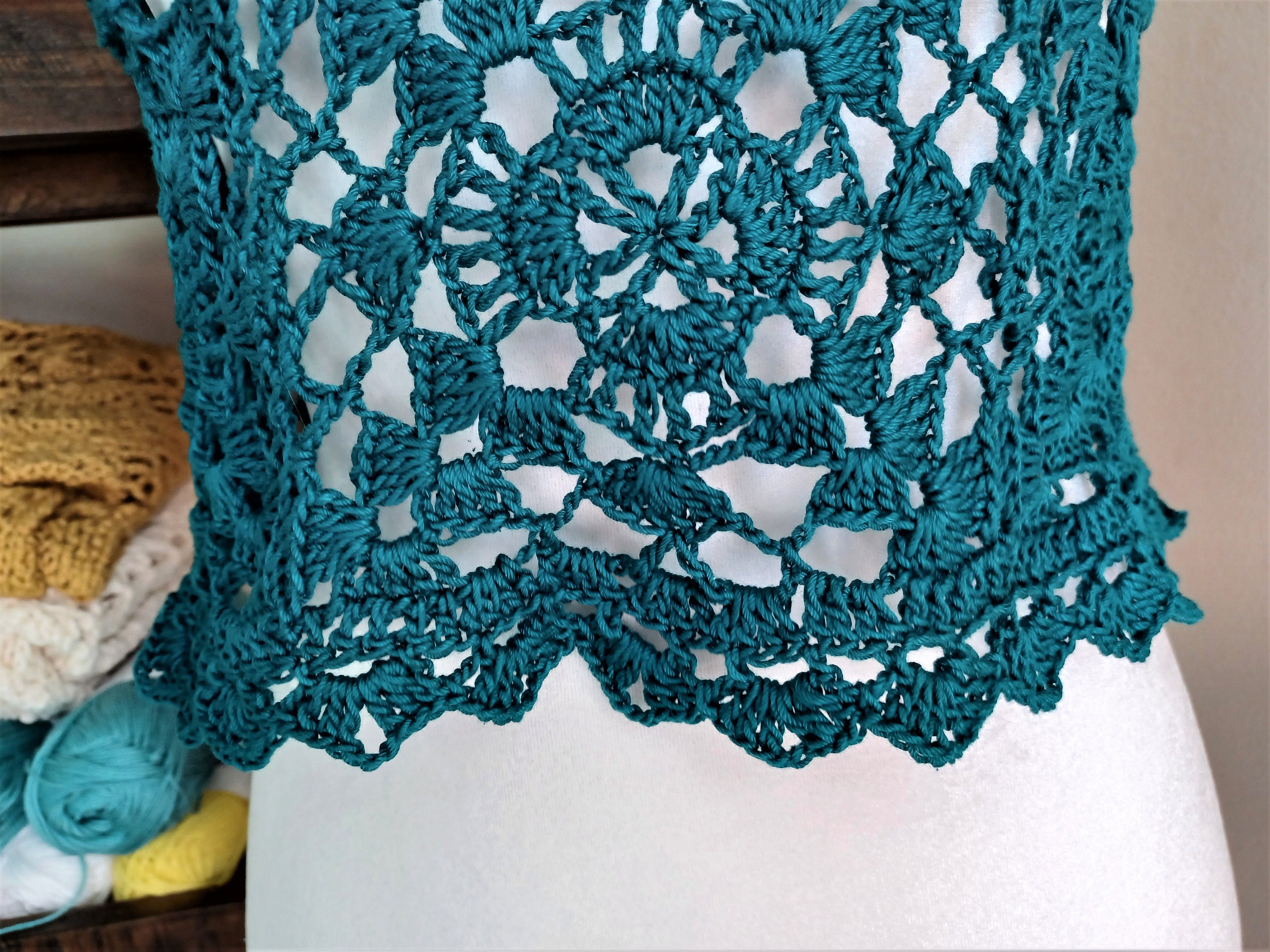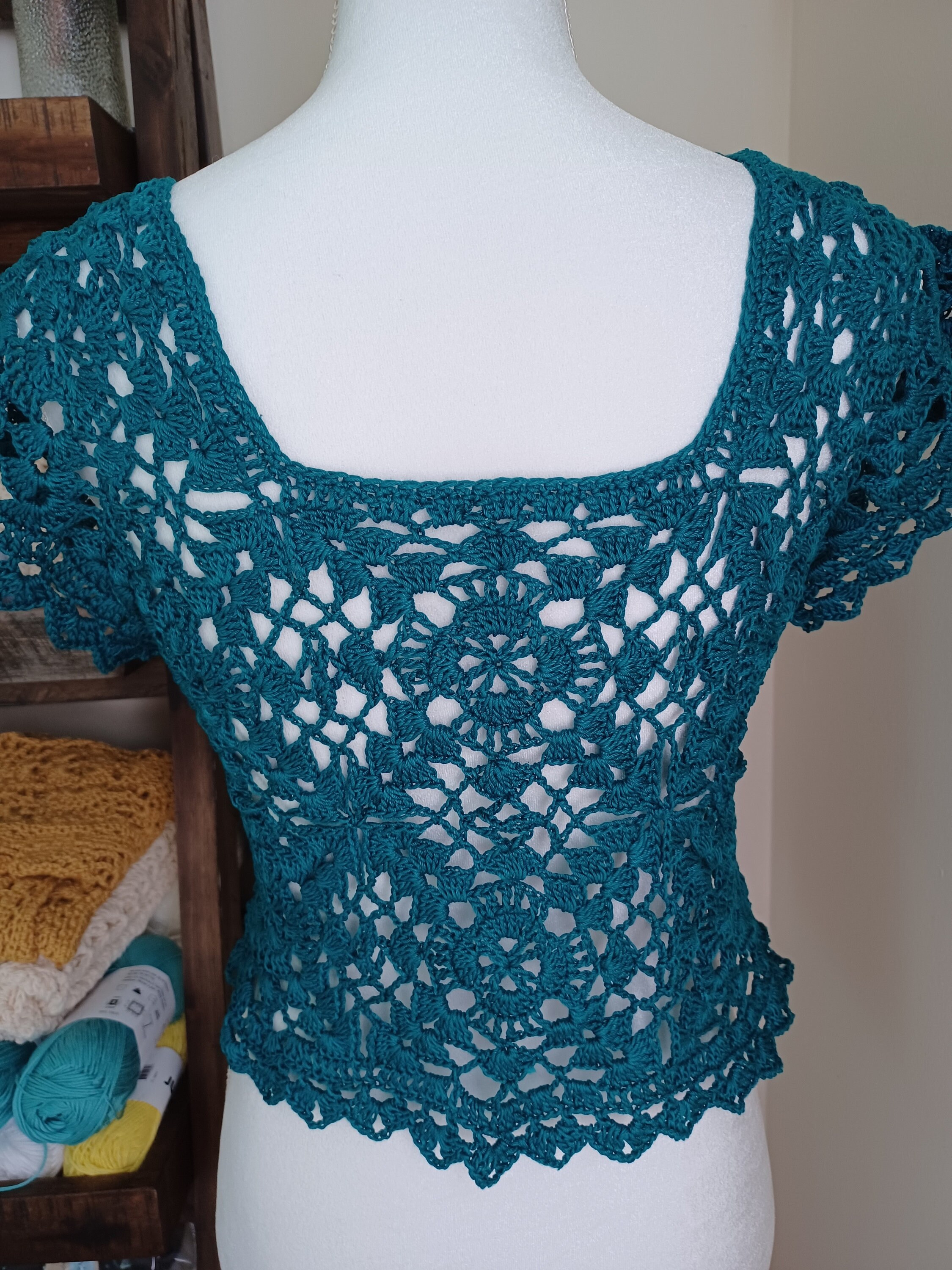 This Midnight Bloom Crochet Top is a delicate handmade piece crafted from 100% mercerized cotton, giving it a soft sheen and luxurious feel. Featuring an intricate floral lace design, it is airy and lightweight, perfect for layering over camisoles or bralettes. The square neckline and scalloped edges add a feminine touch, while the short flutter sleeves provide elegance and movement, making it a versatile statement top for both casual and dressy occasions.