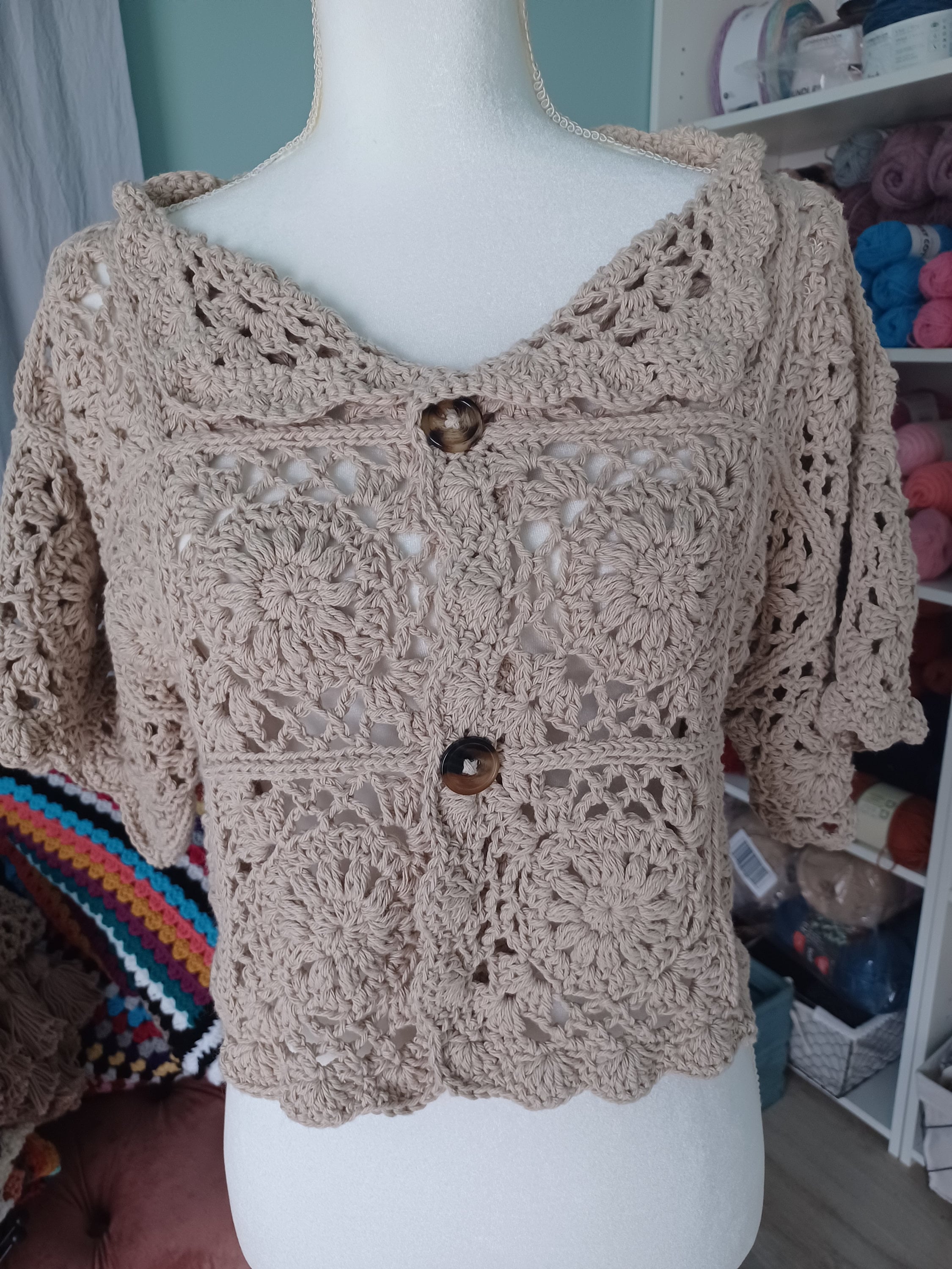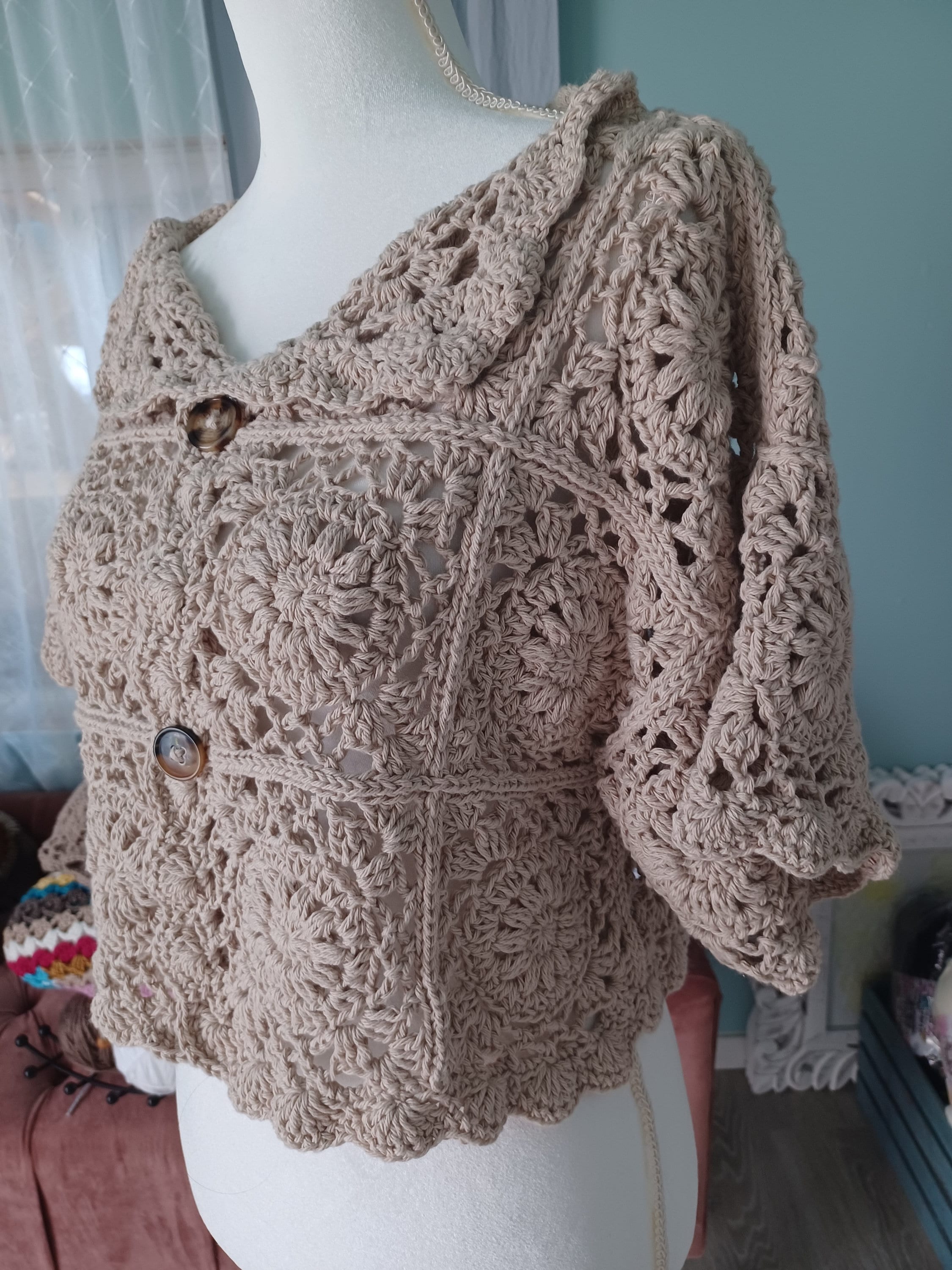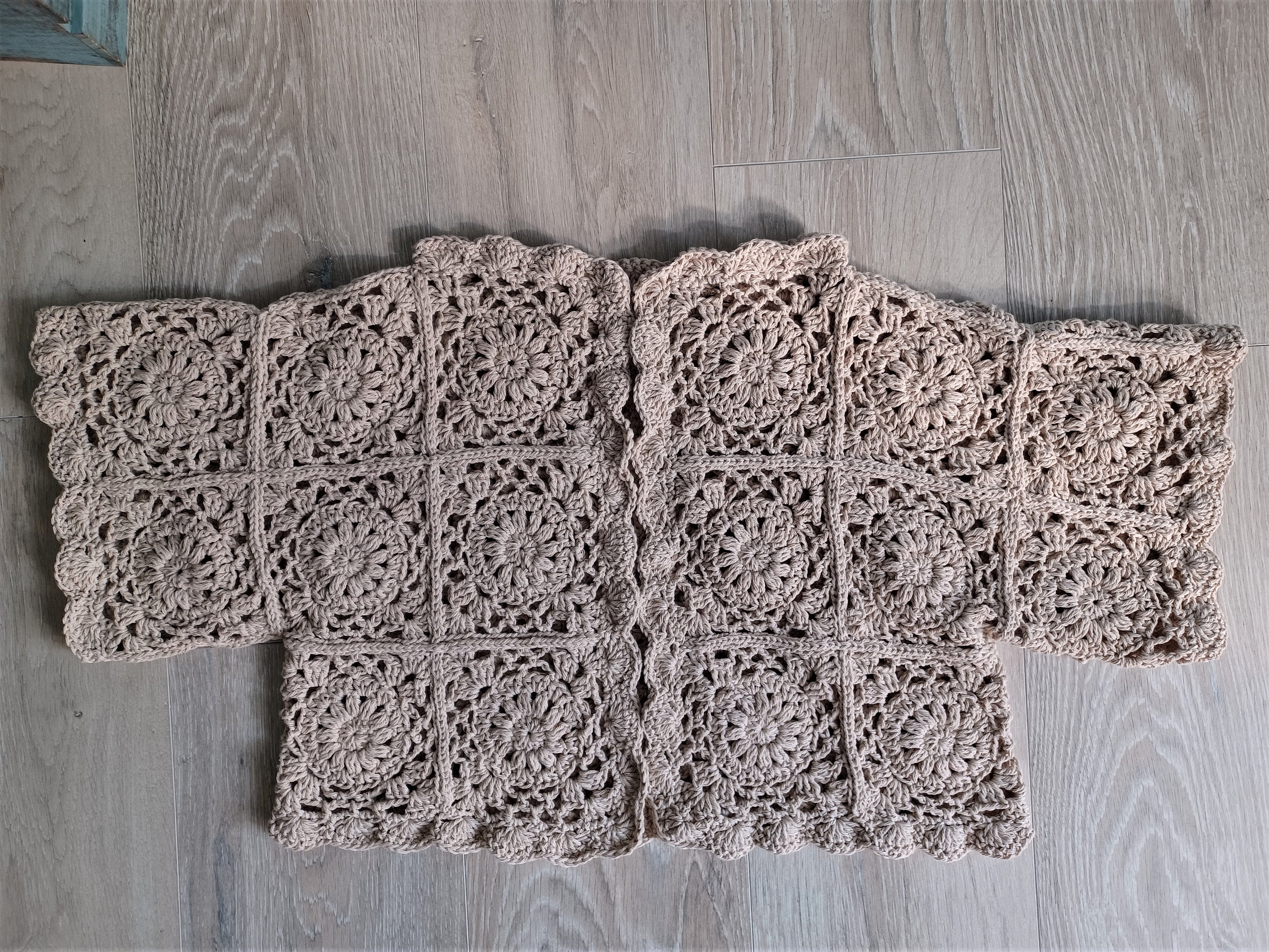 This exquisite handmade crochet floral mid sleeve cardigan boasts timeless elegance and delicate craftsmanship. Crafted from 85% cotton & 15% polyester yarn, its soft and breathable fabric promises comfort while embracing a natural and eco-friendly touch.