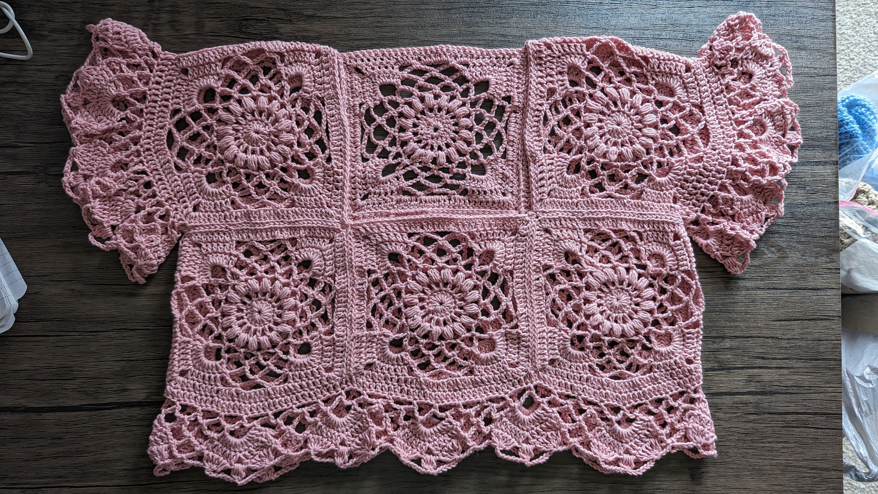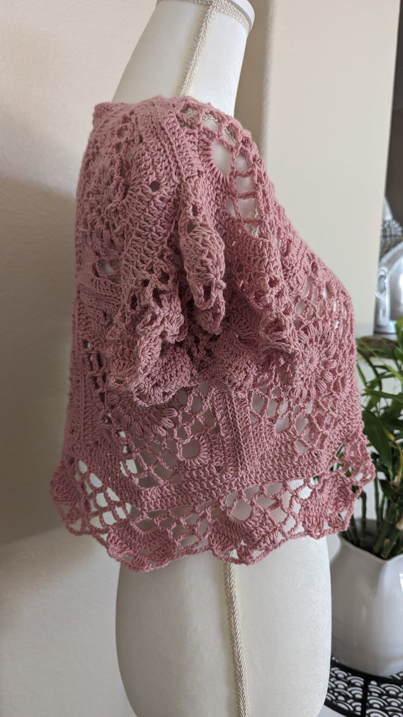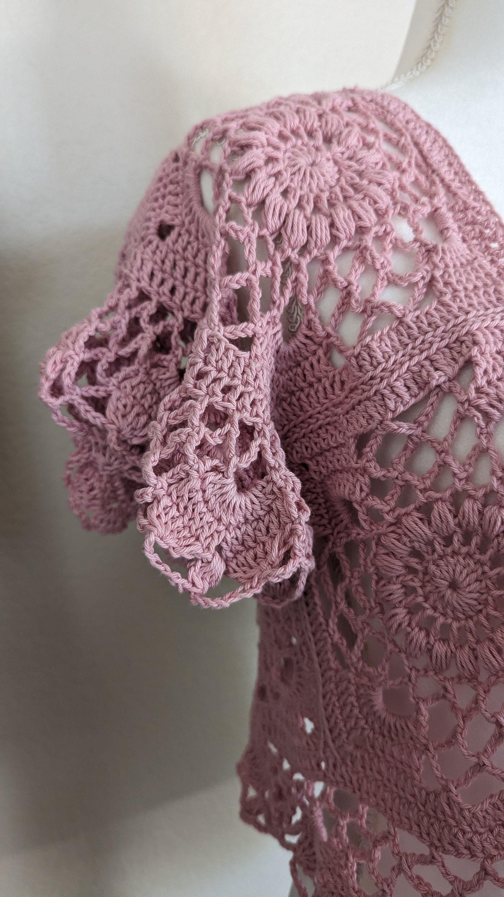 garment. The intricate crochet work showcases a beautiful design, from delicate lace details