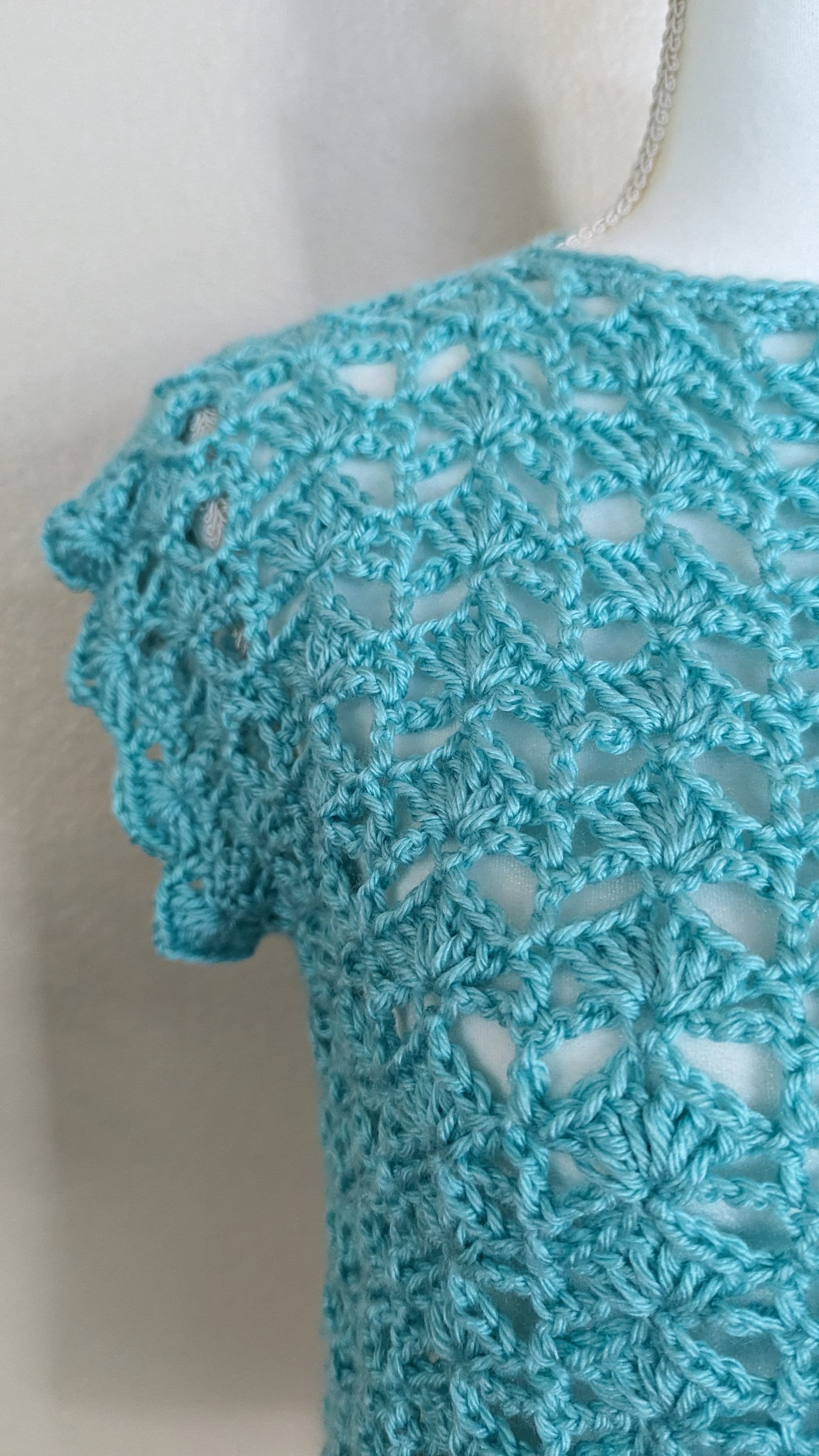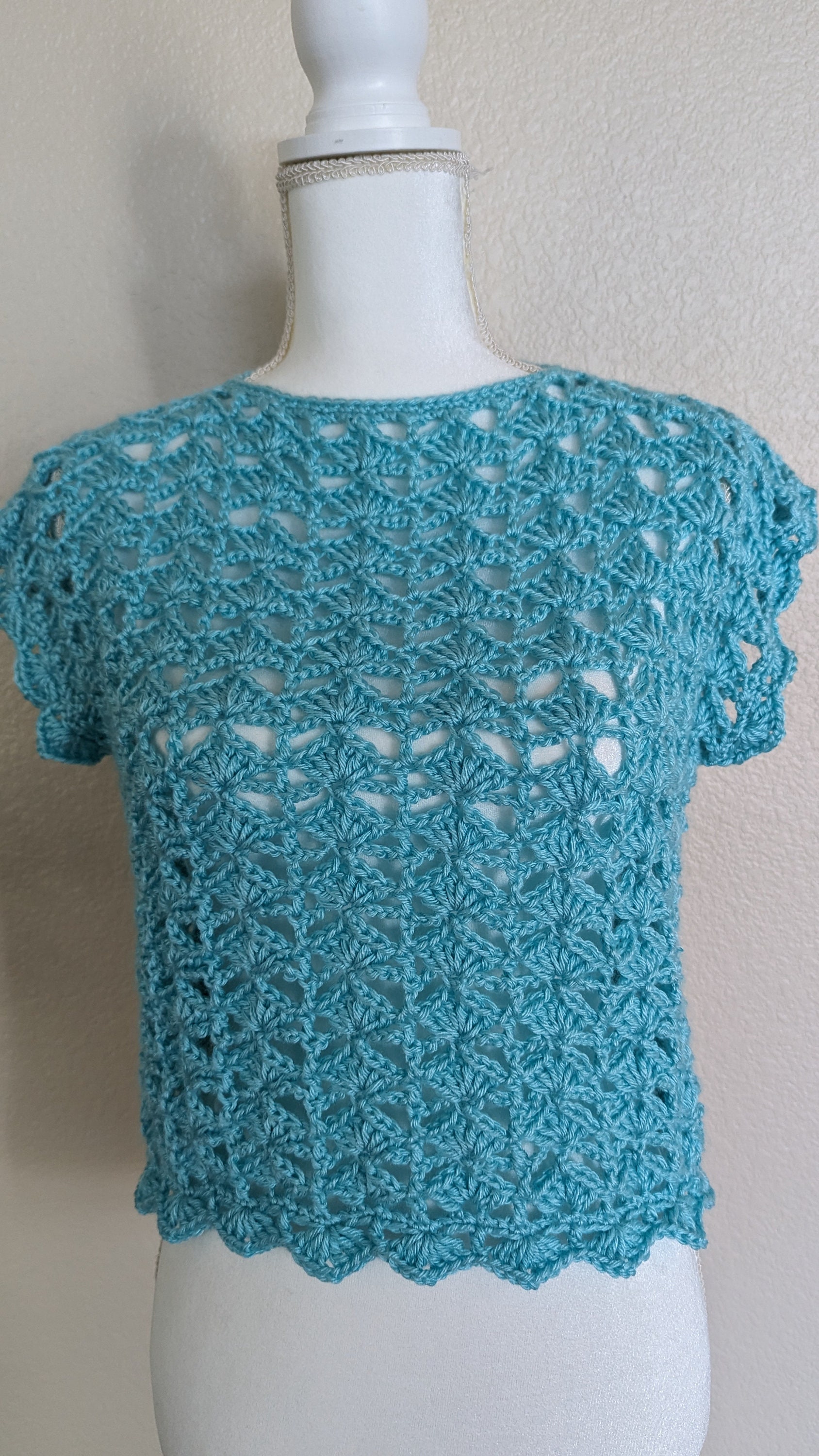 Picture a breezy summer day by the ocean, complemented by the gentle hue of light aqua green in a handmade crochet shell stitch top. Delicate stitches create a textured surface reminiscent of seafoam kissed by sunlight, while the airy design ensures comfort and style in equal measure. This piece exudes a laid-back elegance, perfect for seaside strolls or relaxed gatherings under the sun.