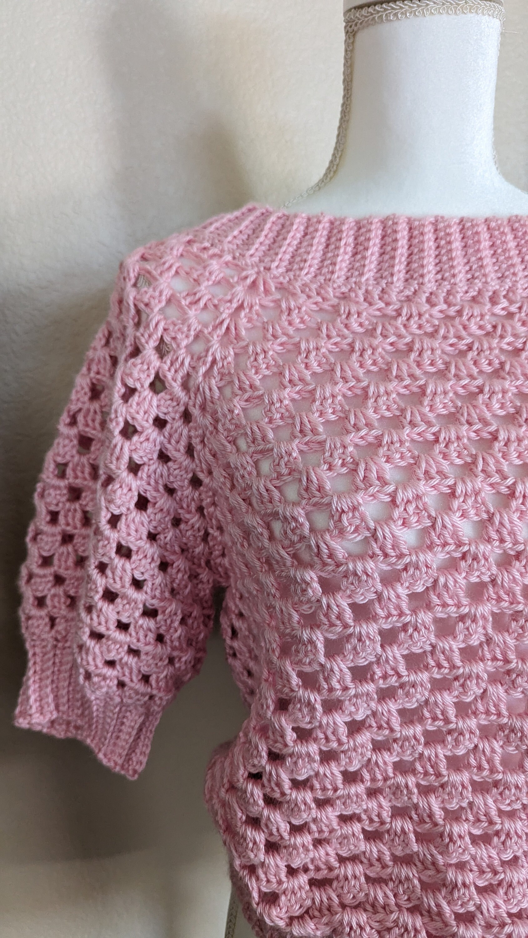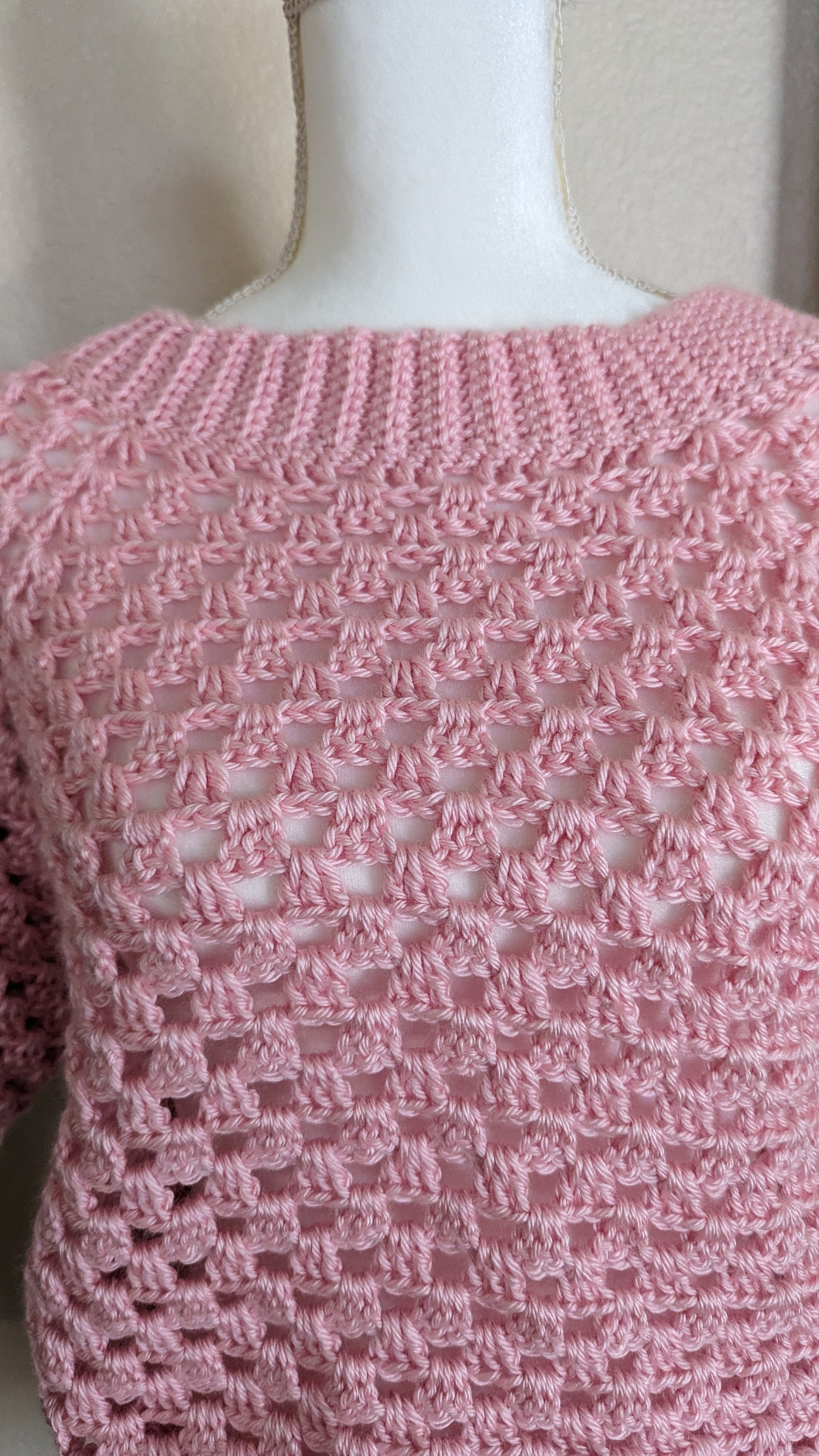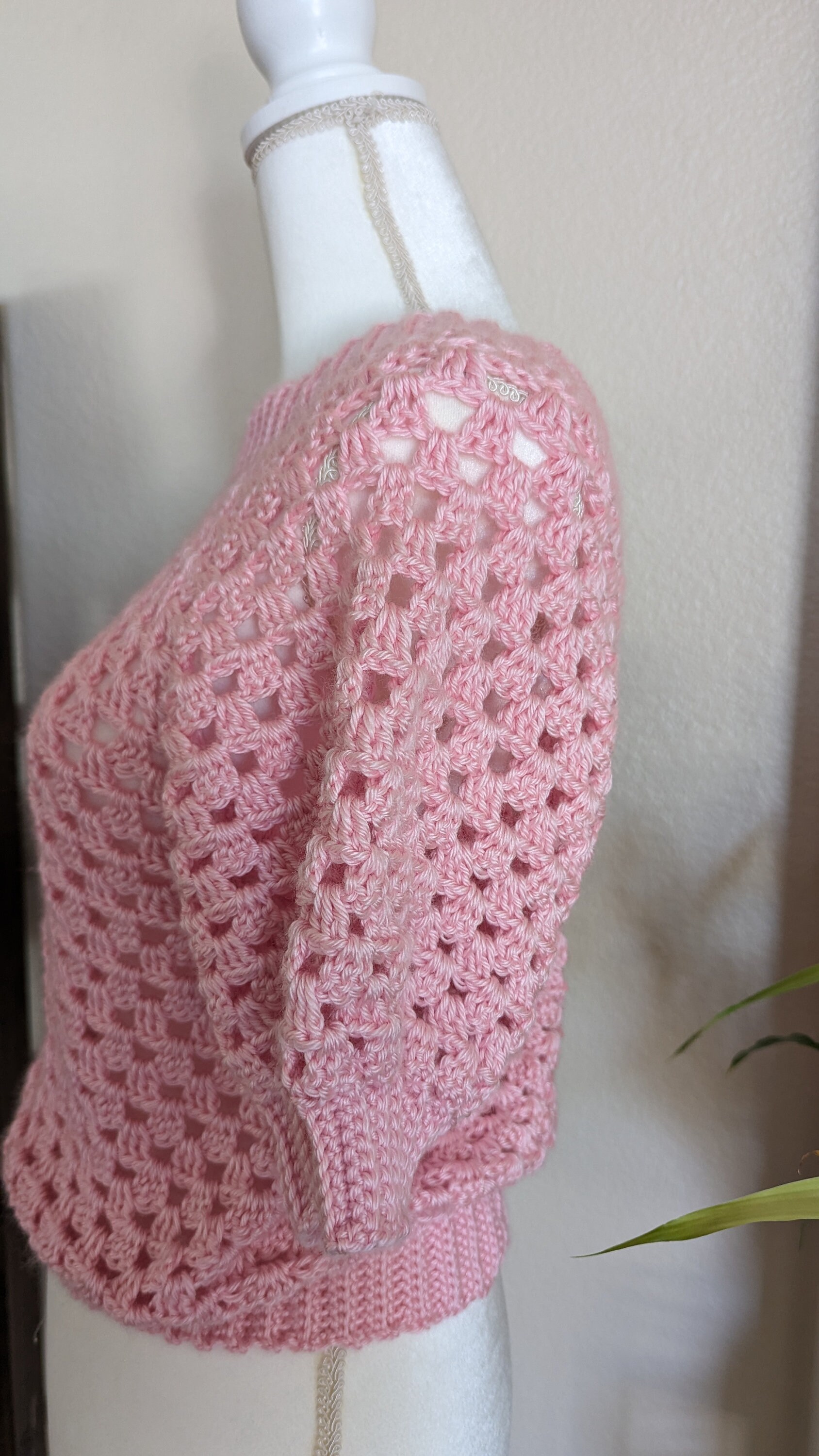 Imagine a cozy, pink handmade crochet pullover adorned with classic granny stitch details, exuding warmth and charm. Its intricate craftsmanship and nostalgic design evoke a sense of comfort and homeliness. Perfect for chilly evenings or casual outings, this pullover adds a touch of vintage-inspired style to any outfit, making it a timeless wardrobe staple.