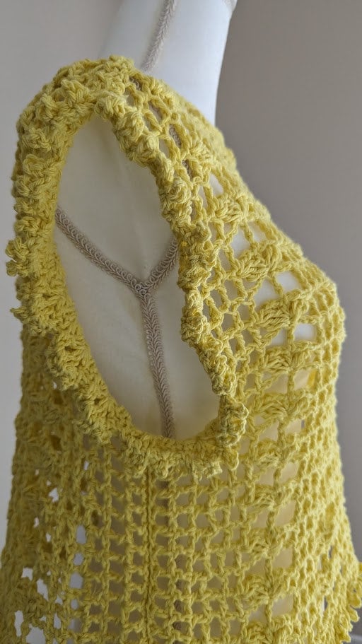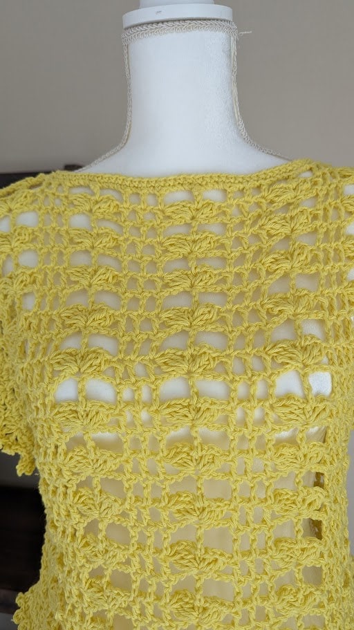 This canary yellow crochet pattern exudes vibrancy and charm, evoking feelings of warmth and joy. With its intricate stitch work and delicate design, it captures the essence of summer in every stitch. The cheerful hue of canary yellow adds a playful and lively touch to any wardrobe, making it the perfect choice for brightening up sunny days. Whether worn as a statement piece or layered with other garments, this crochet pattern radiates elegance and style, making it a delightful project for any crochet enthusiast.