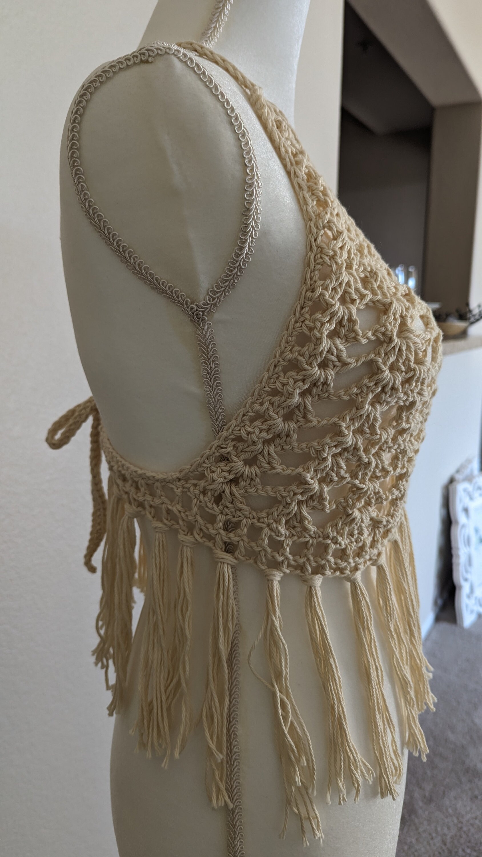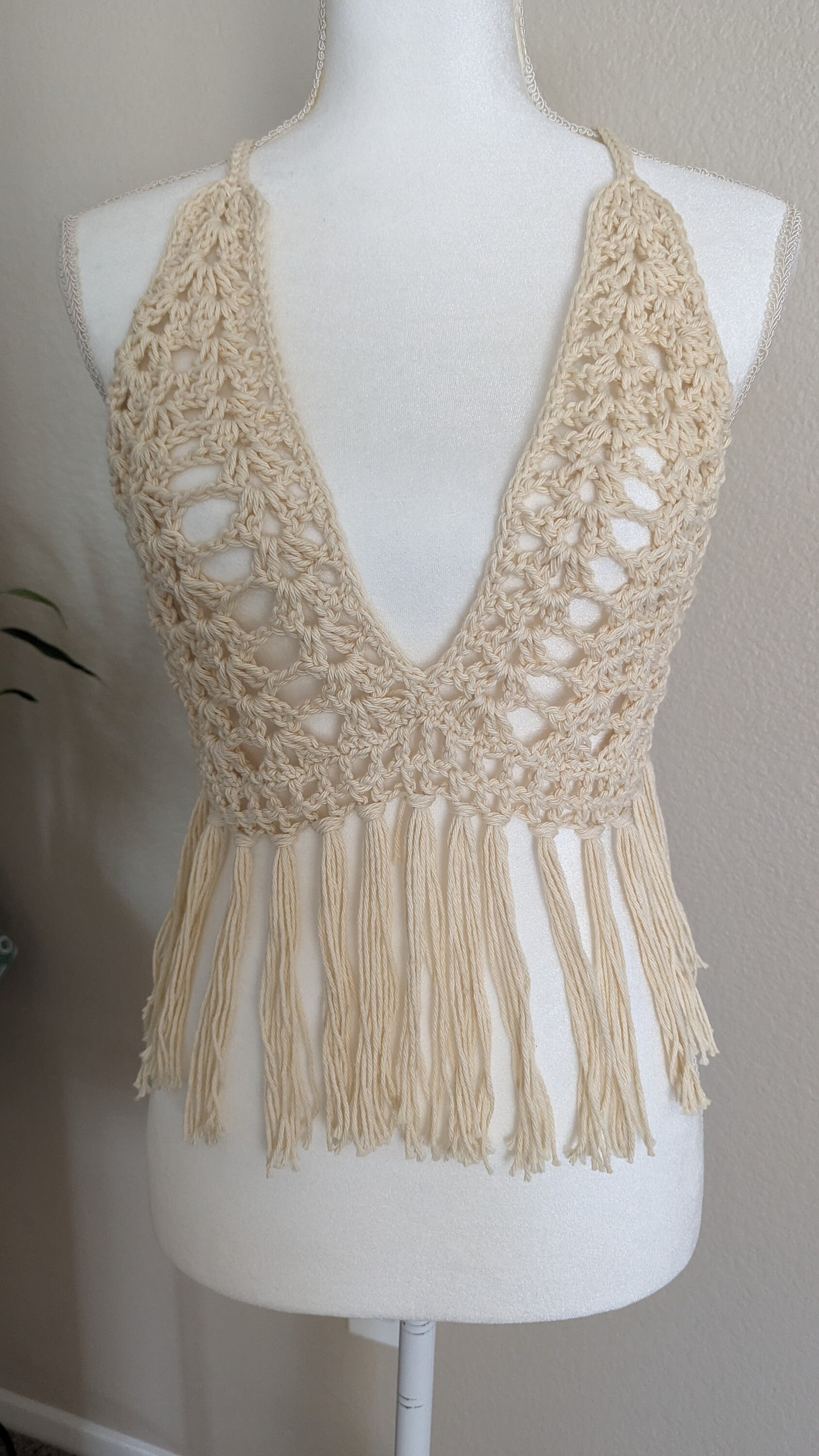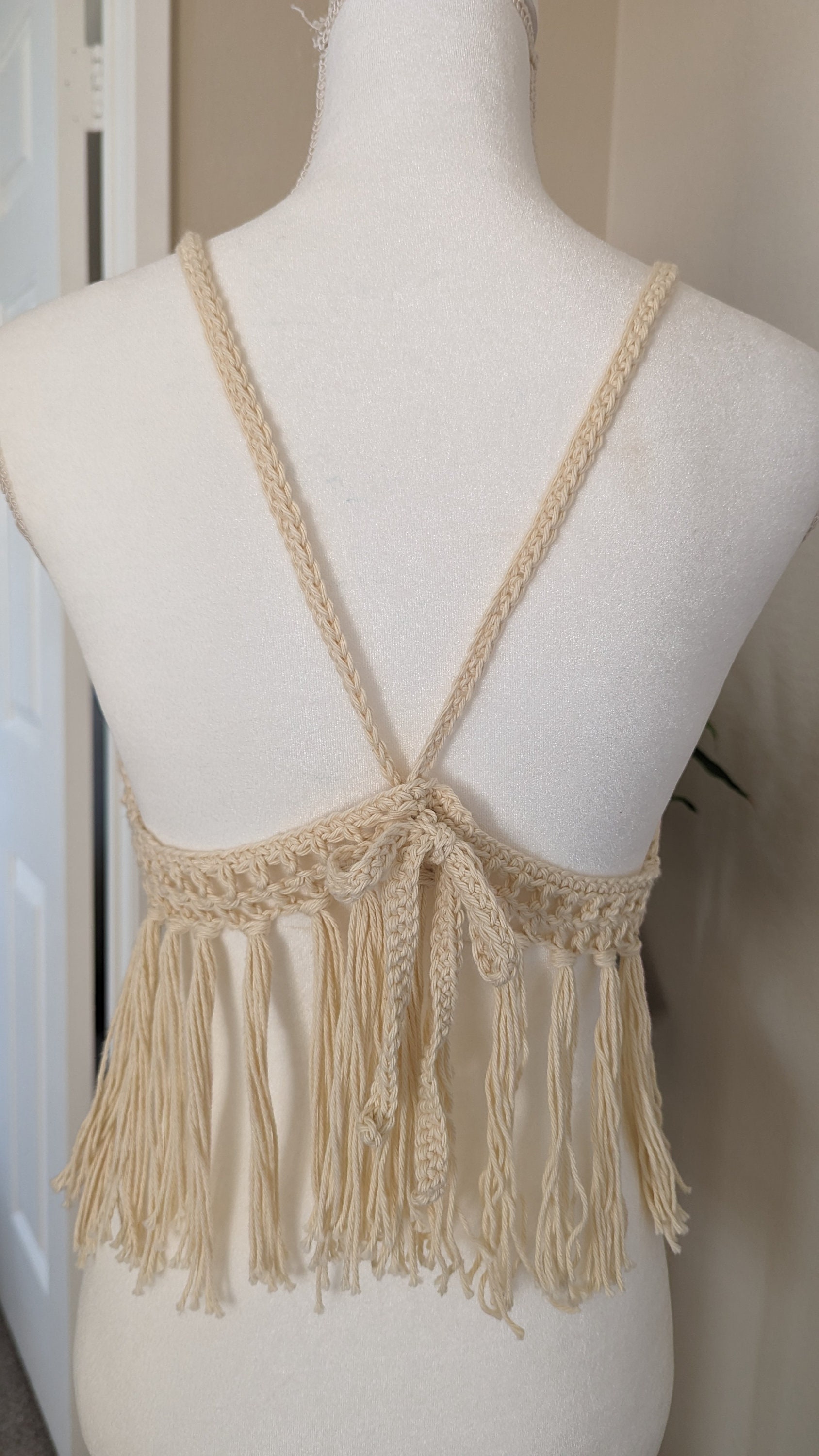 This beige handmade crochet halter top would likely feature intricately woven patterns and textures, crafted with soft, natural-toned yarn. Its halter style would have straps that tie around the neck, showcasing a flattering neckline. The crochet work would give it a unique, bohemian vibe, perfect for casual or beachwear.