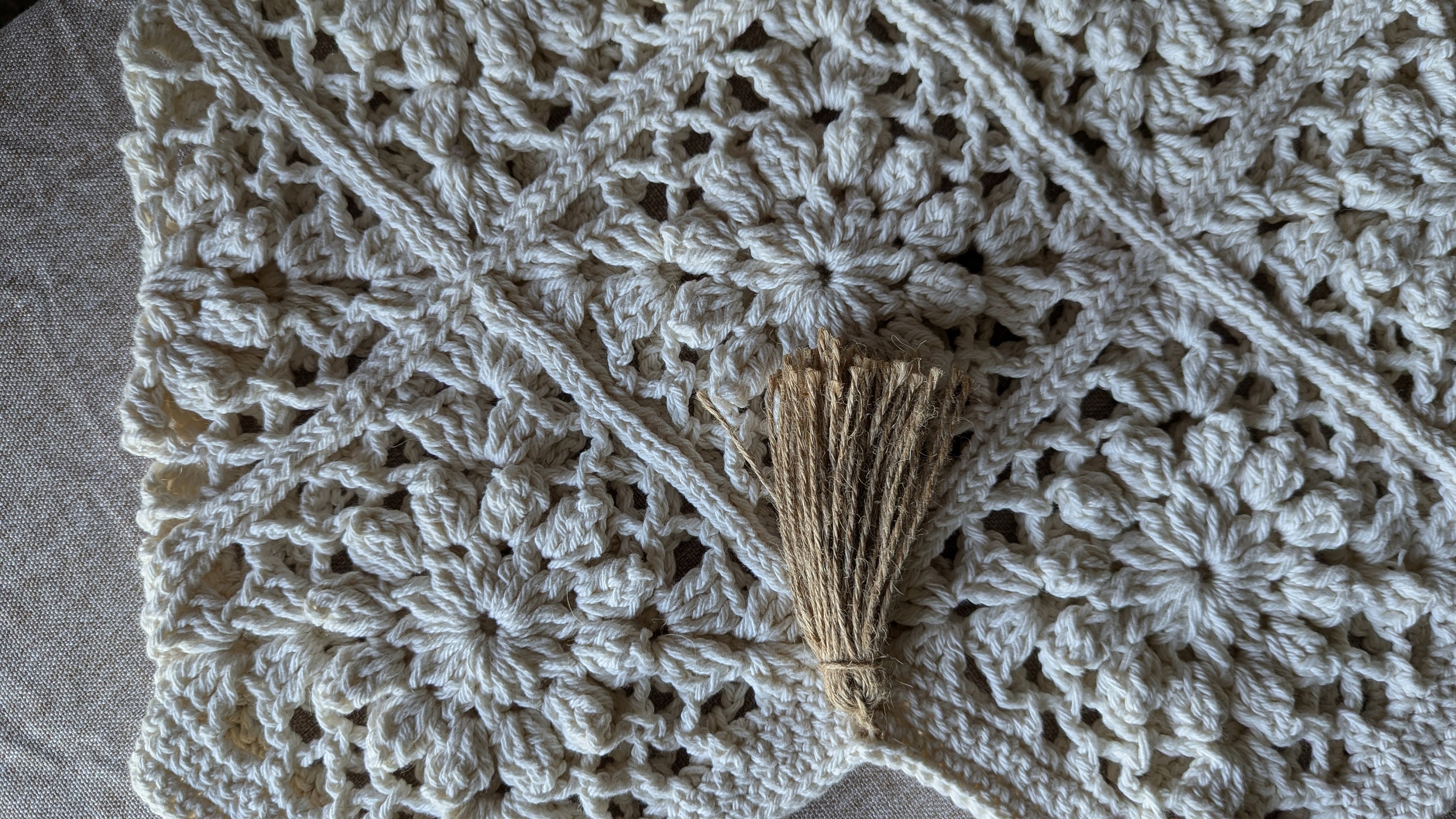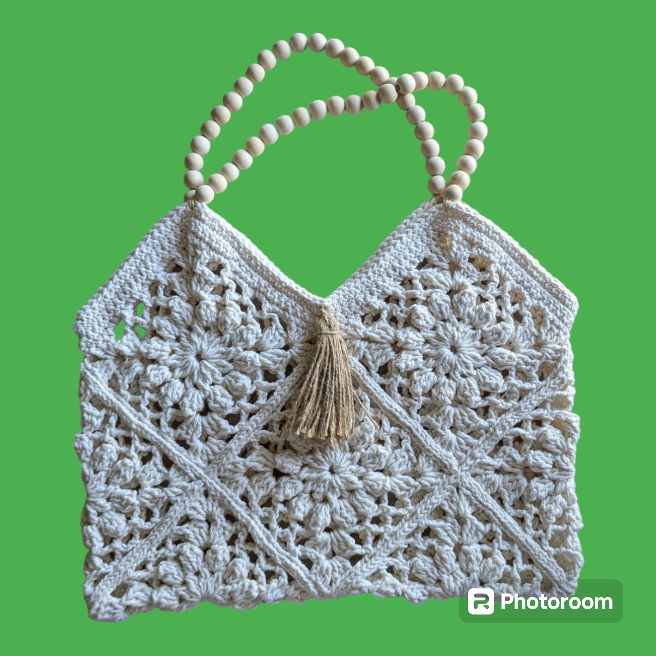Color:The yarn used is a natural, off-white or cream color, which complements the handcrafted, bohemian aesthetic of the bag.Design and Pattern:The bag's body is composed of several intricately crocheted squares.