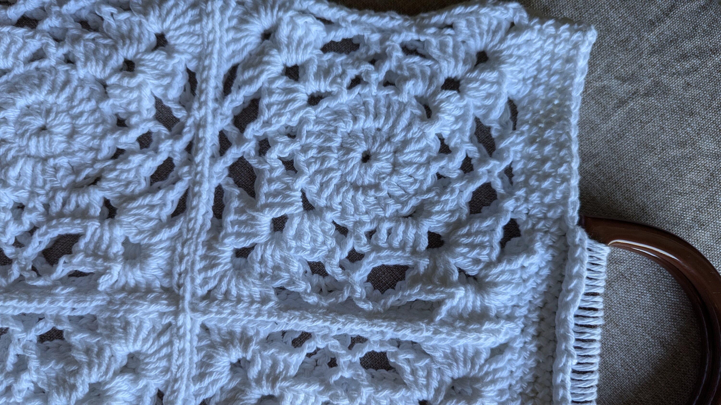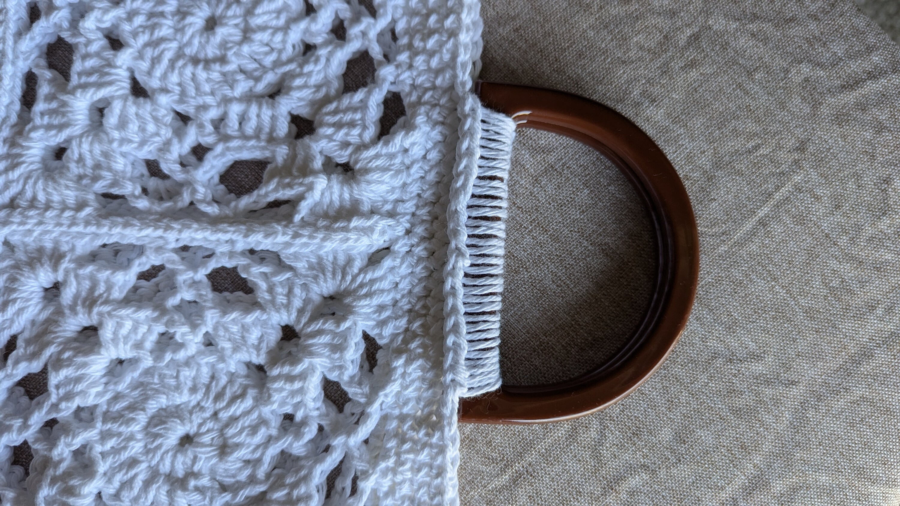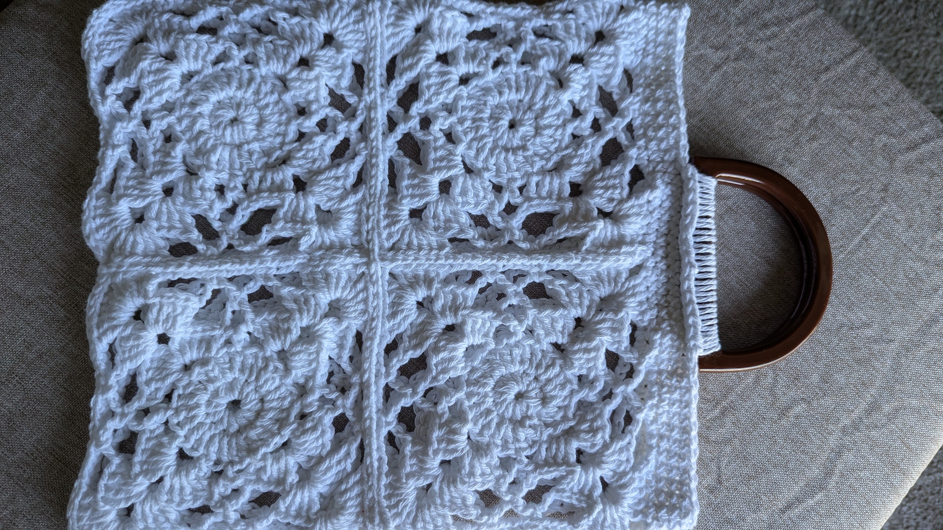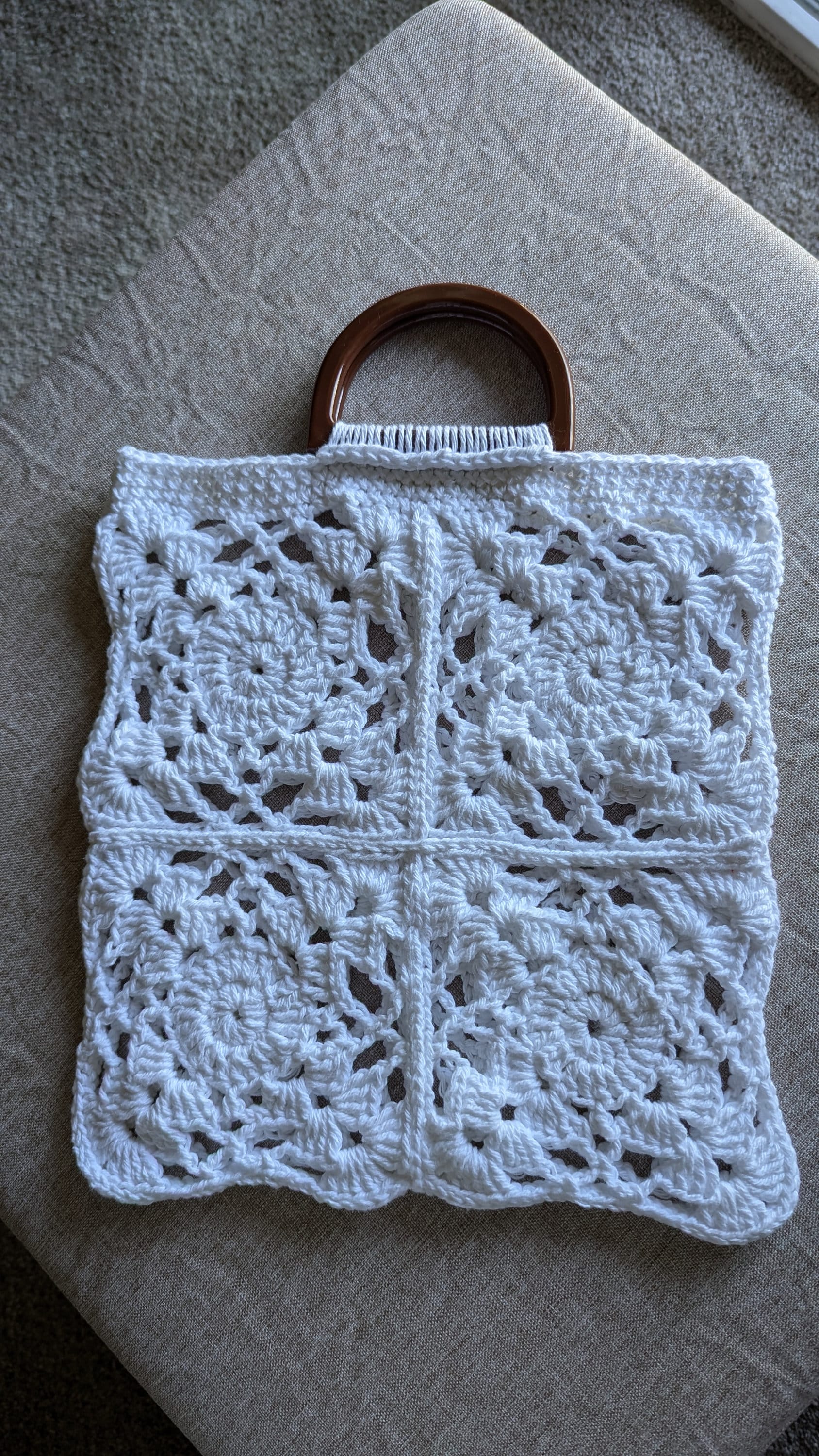 This handmade crochet bag, crafted from 100% cotton yarn, features a bright white color and an intricate floral pattern formed by four large crocheted squares. The bag is medium-sized, ideal for carrying daily essentials, and is equipped with smooth, circular wooden handles that provide a comfortable grip. The scalloped edge at the bottom adds a decorative touch, enhancing its elegant and timeless design. Perfect for various occasions, this bag showcases meticulous craftsmanship and a natural, eco-friendly aesthetic.