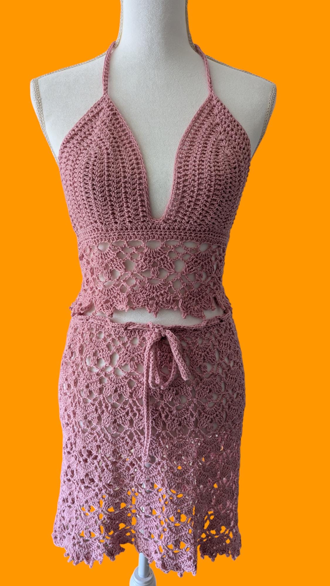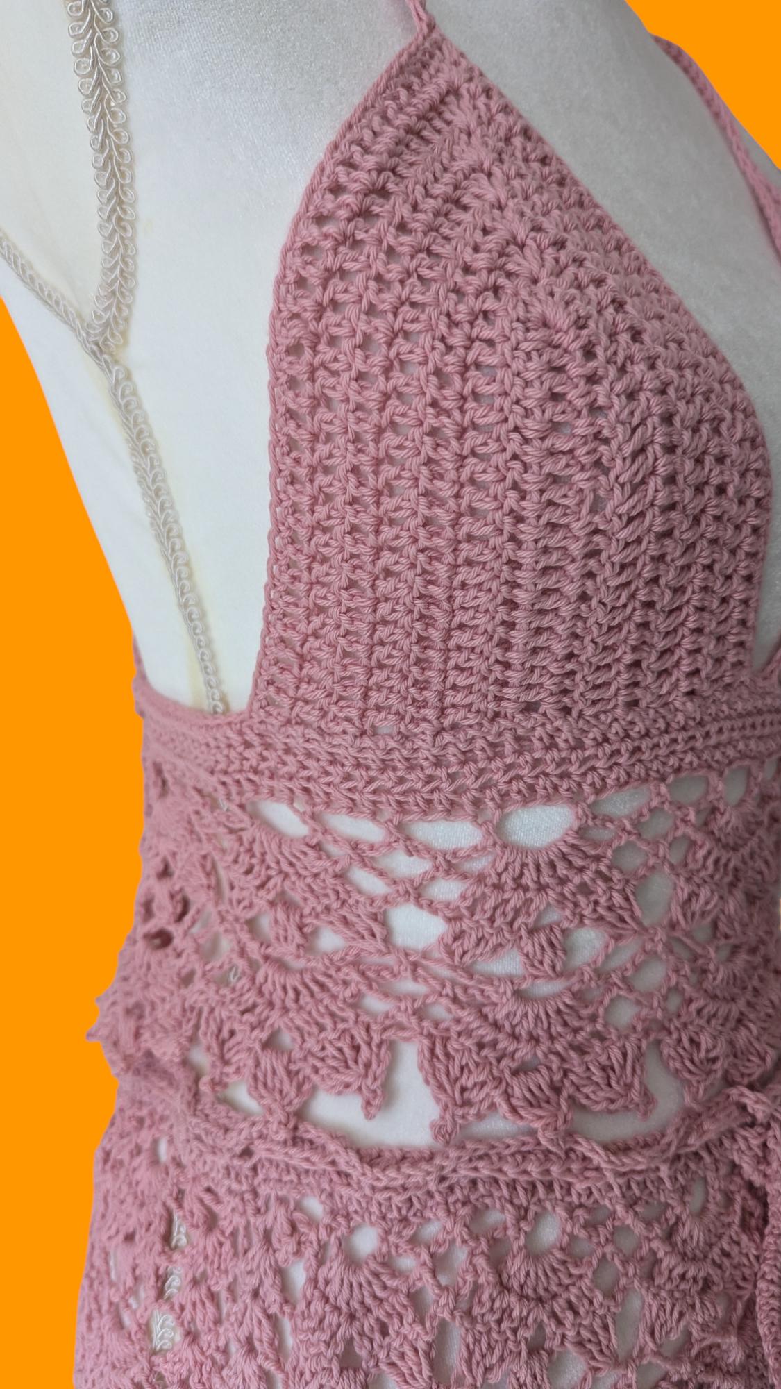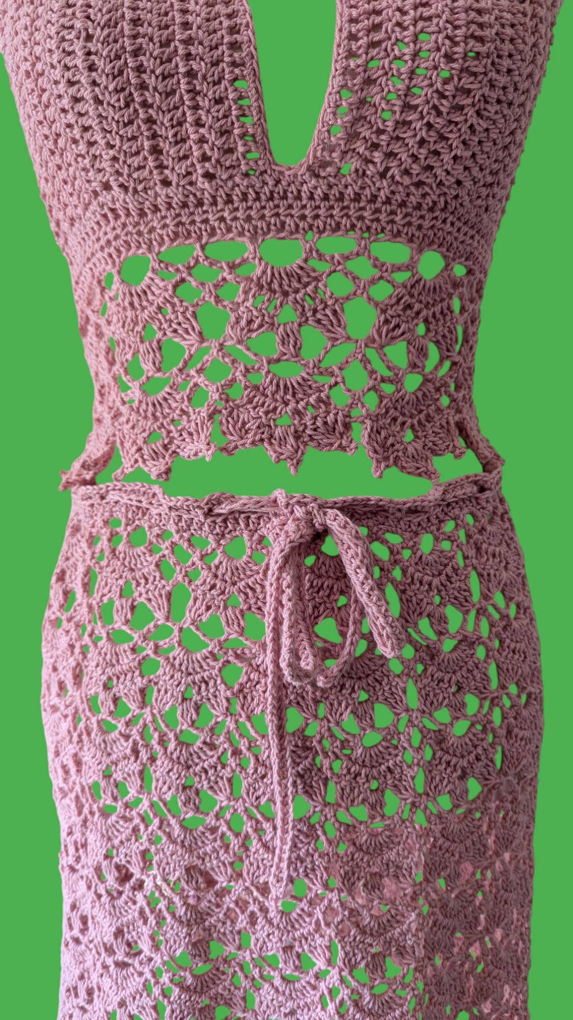 The "Rose Lace Ensemble" features a handmade crochet halter top paired with a matching skirt. The halter top boasts a plunging neckline with thin straps and a delicate scalloped edge, exuding elegance. The skirt, designed with an intricate lace-like pattern, has a waist measurement of 32 inches but is customizable to fit your waist with its adjustable drawstring. Both pieces, crafted in a soft rose color, make this ensemble perfect for a bohemian summer look or a chic beach cover-up. The attention to detail and expert craftsmanship highlight the unique artistry of this handcrafted outfit.