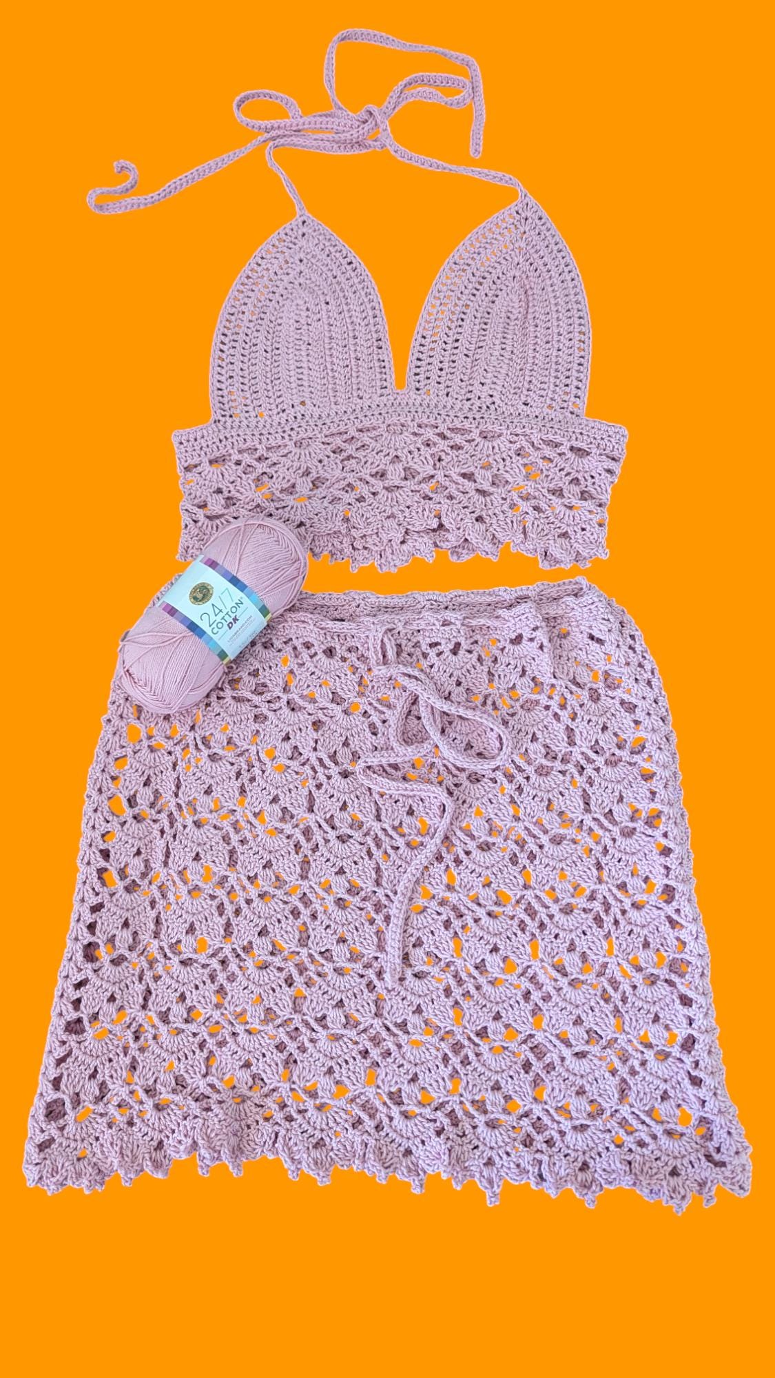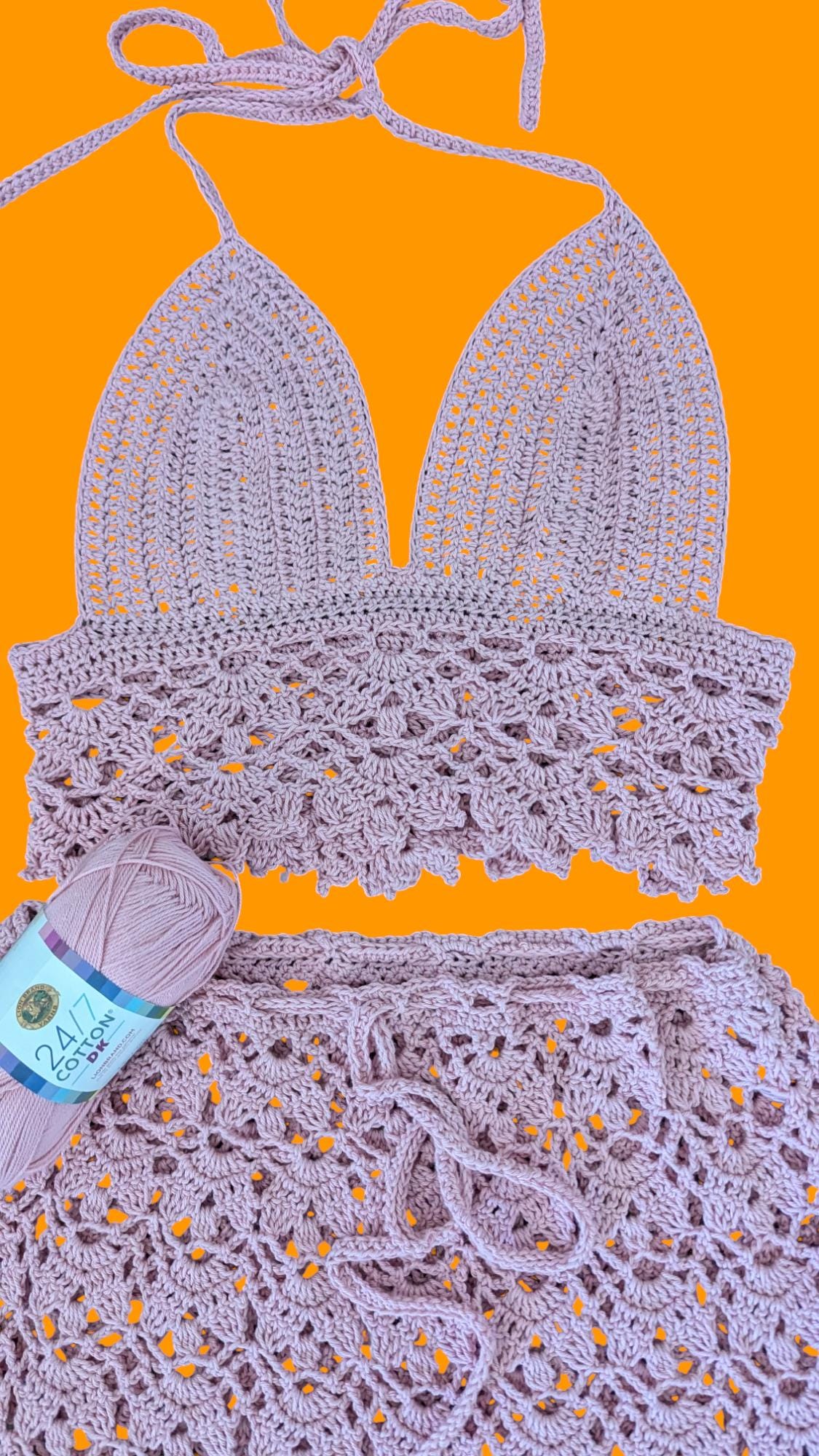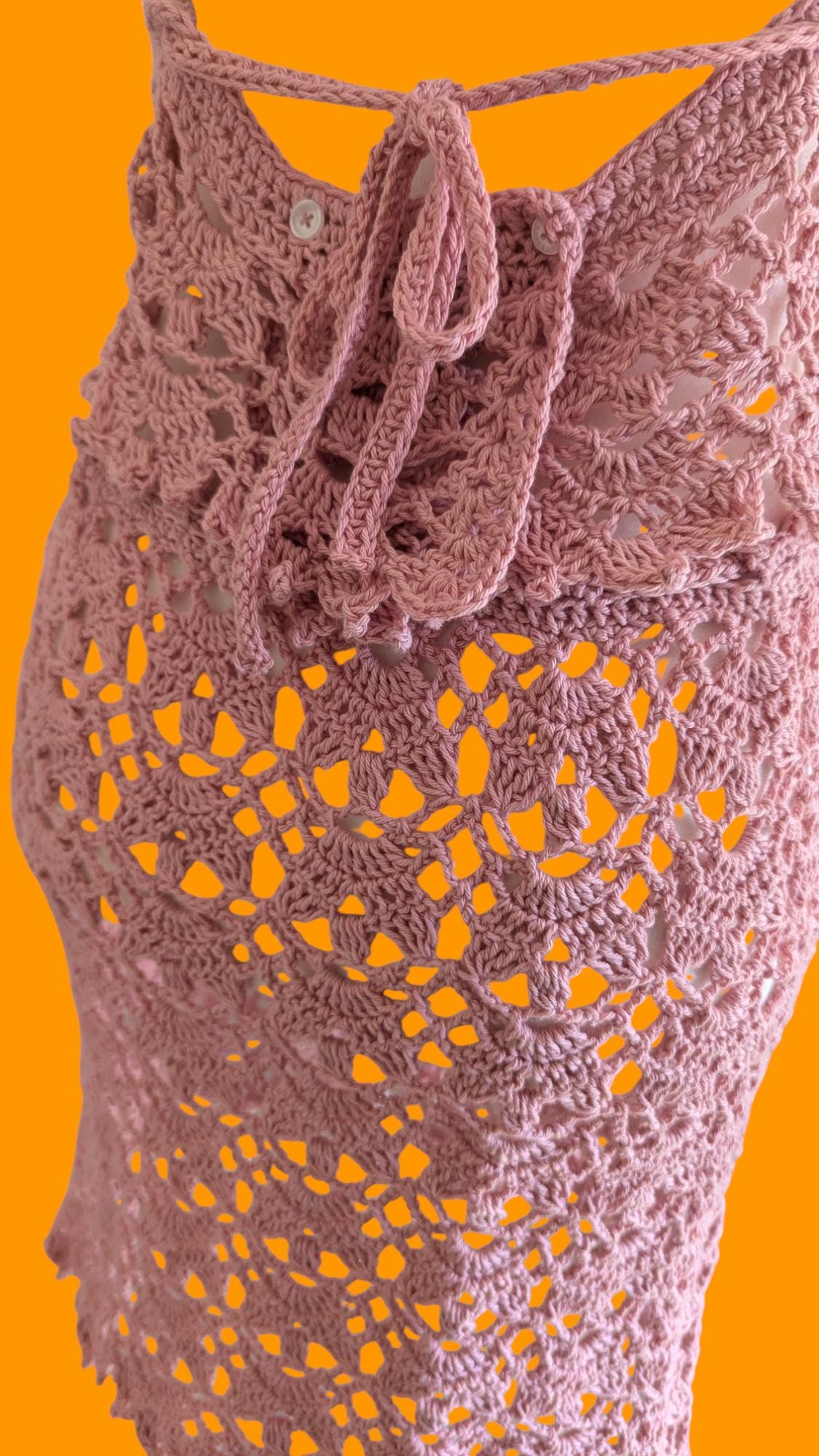 The "Rose Lace Ensemble" features a handmade crochet halter top paired with a matching skirt. The halter top boasts a plunging neckline with thin straps and a delicate scalloped edge, exuding elegance. The skirt, designed with an intricate lace-like pattern, has a waist measurement of 32 inches but is customizable to fit your waist with its adjustable drawstring. Both pieces, crafted in a soft rose color, make this ensemble perfect for a bohemian summer look or a chic beach cover-up. The attention to detail and expert craftsmanship highlight the unique artistry of this handcrafted outfit.