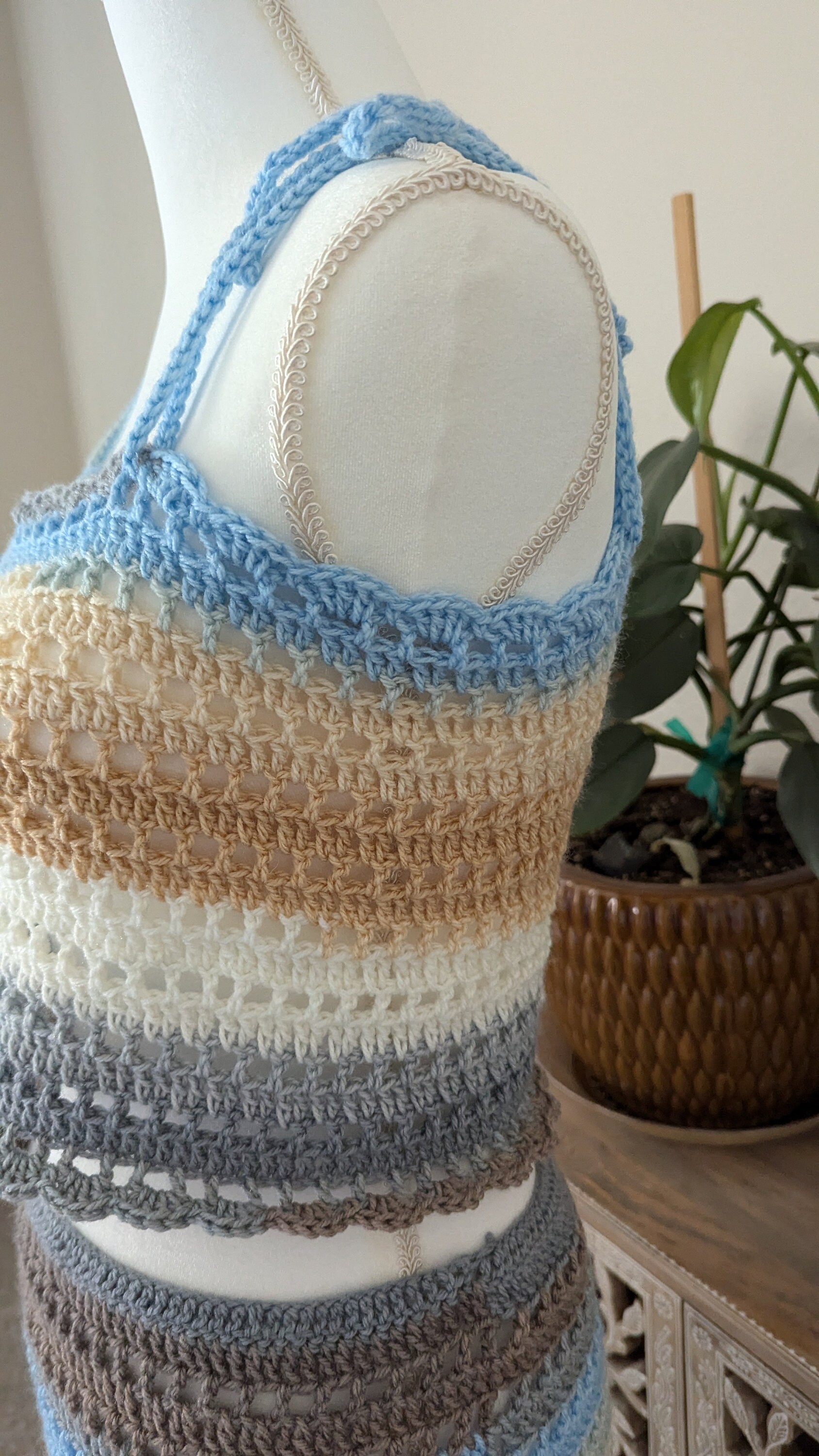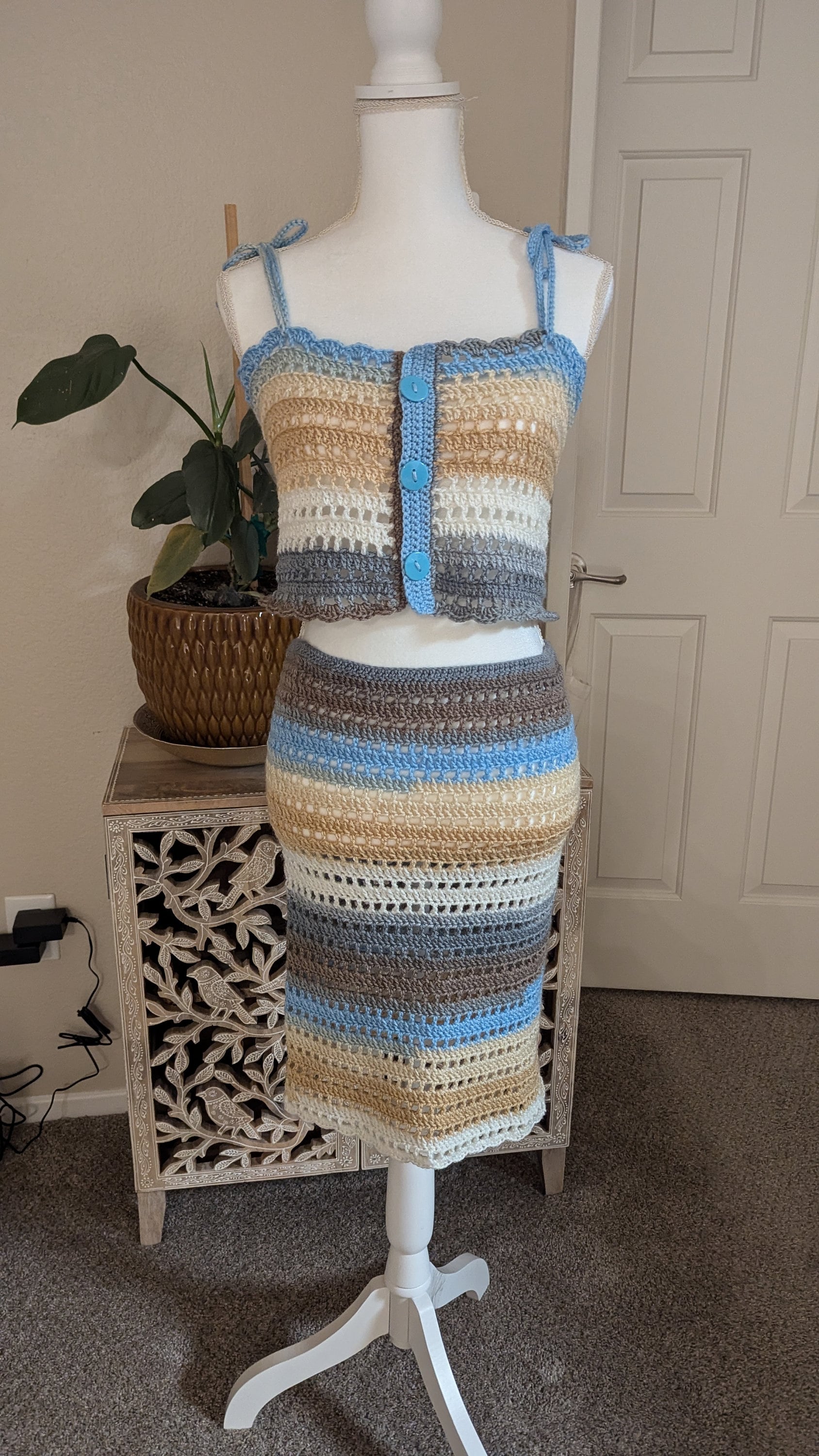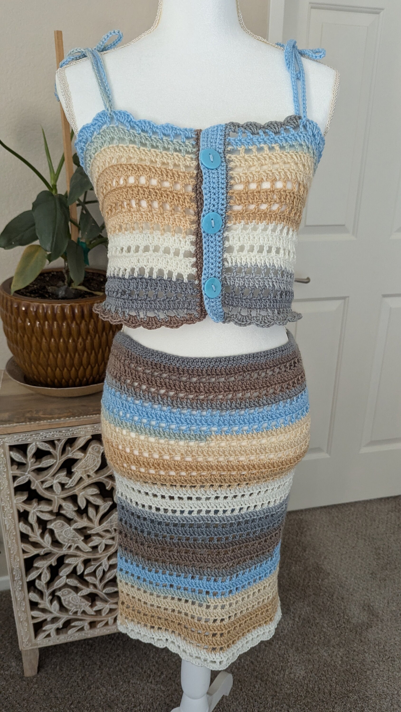 The Sandy Shores Crochet Set features a beautifully handmade top and skirt ensemble, inspired by the tranquil colors of the beach. The set combines shades of blue, beige, brown, and cream in a striped pattern, evoking the serene hues of sand, sea, and sky. The cropped top, adorned with delicate blue buttons and adjustable shoulder straps, pairs perfectly with the high-waisted skirt, offering a comfortable yet stylish fit. This lightweight and breathable set is ideal for warm weather, making it a perfect choice for a day at the beach or a casual summer outing.