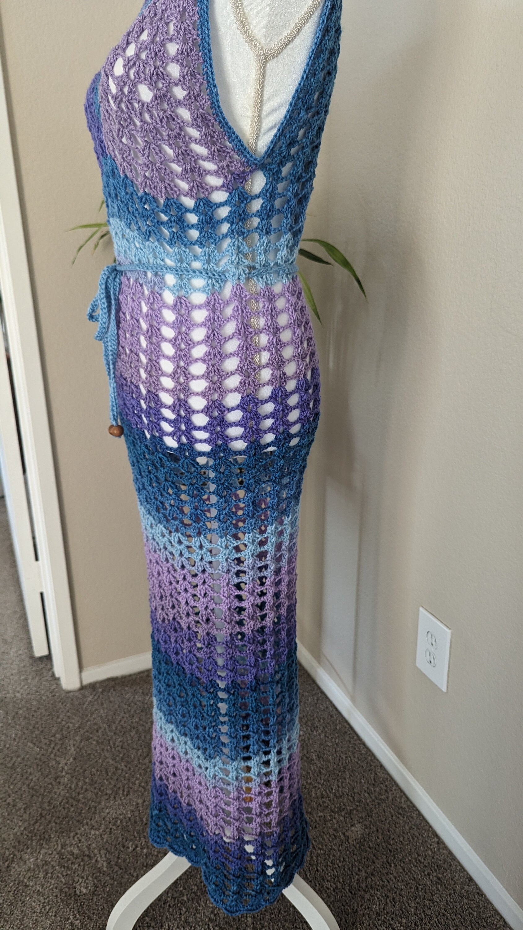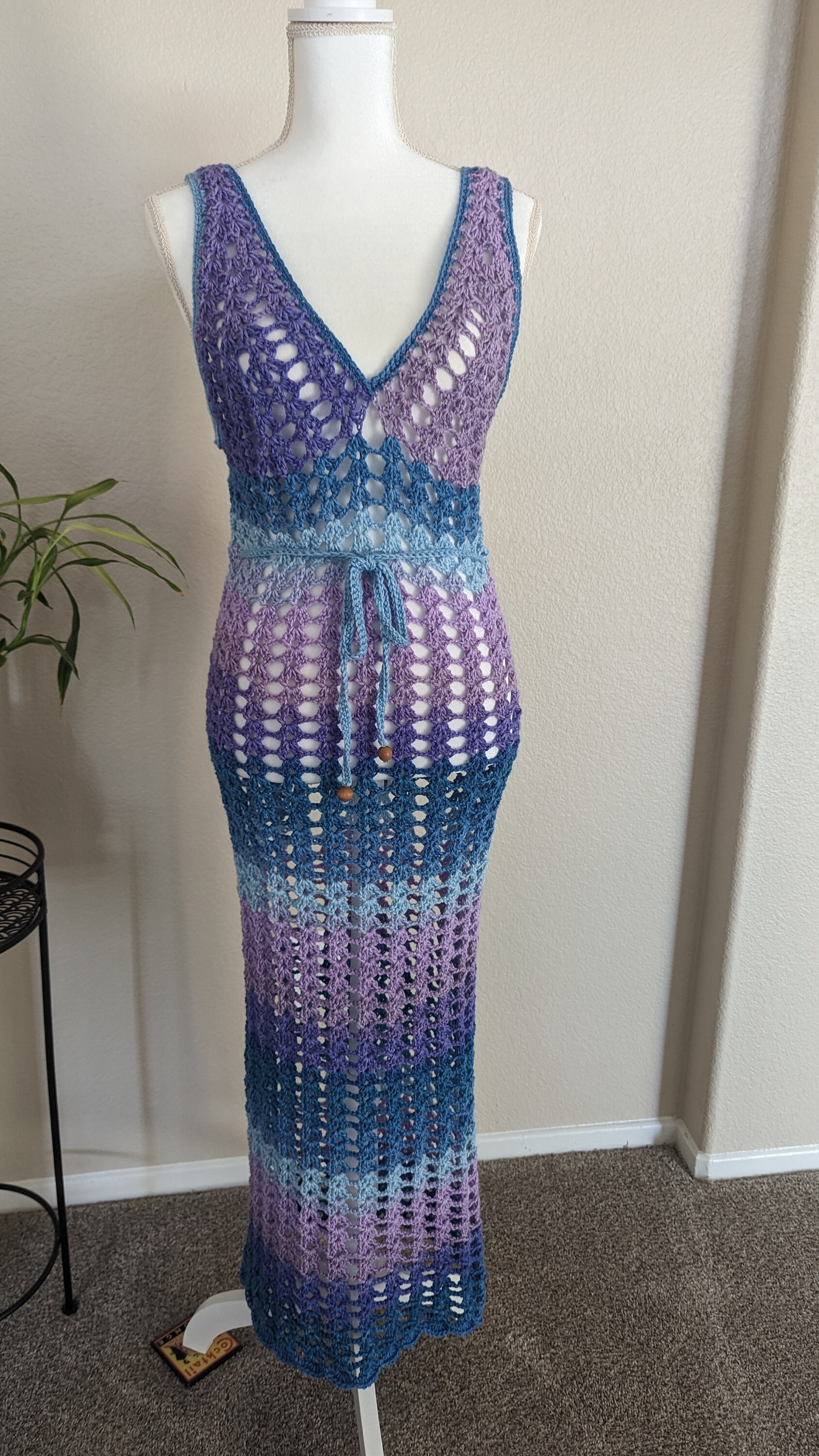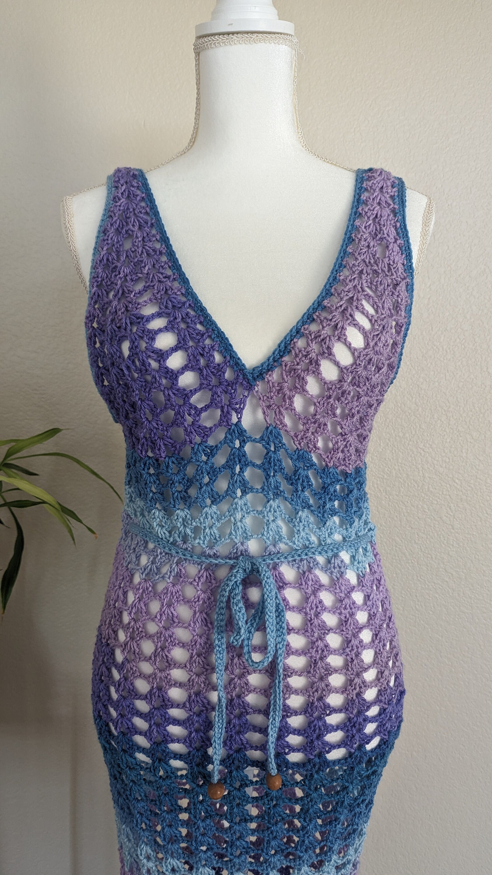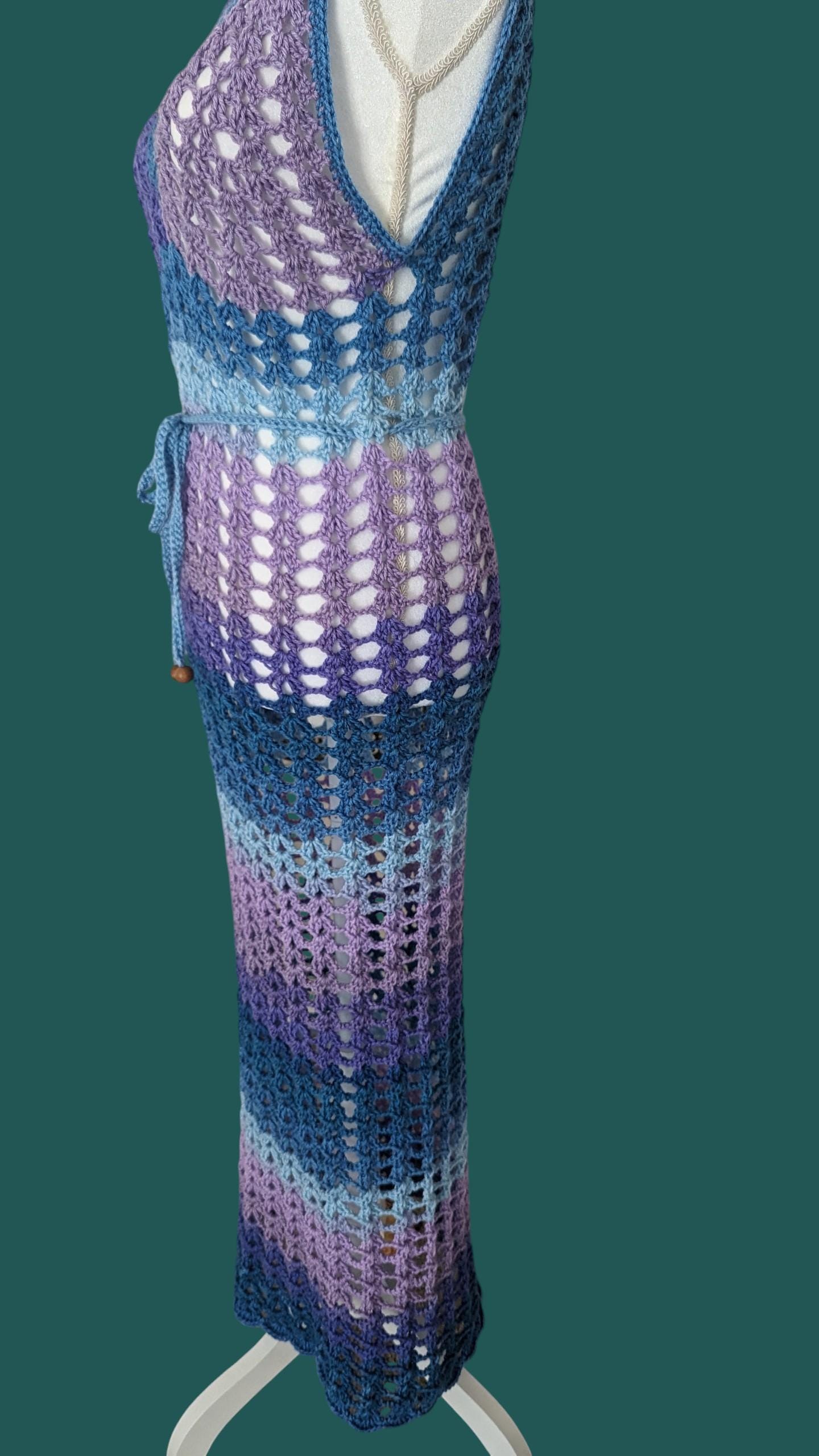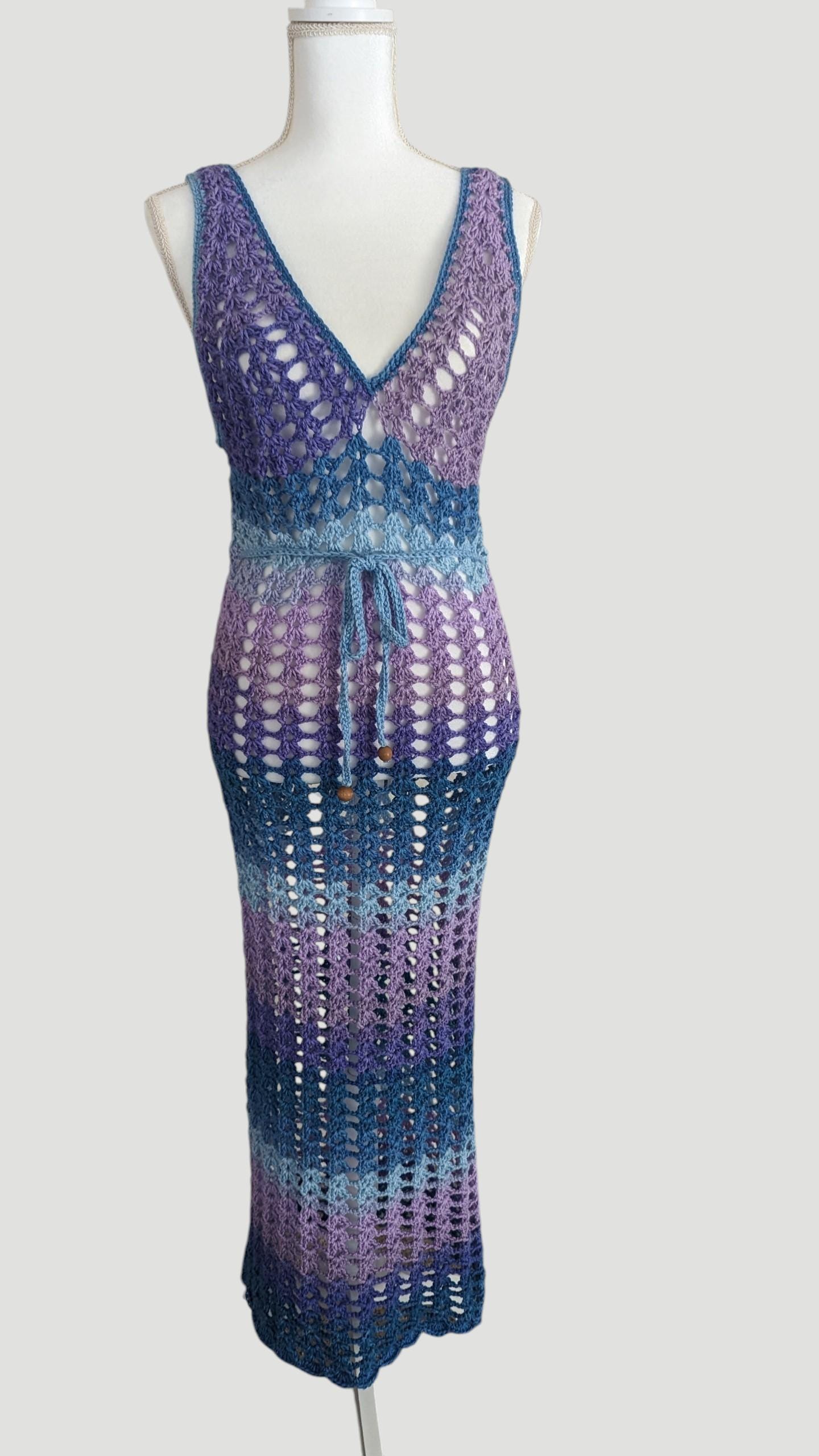 The "Ocean Twilight Dress" is a stunning handmade crochet piece that features a delicate mesh pattern, perfect for beachwear or summer outings. Its variegated hues transition smoothly from deep purples to serene blues, creating a captivating ombré effect reminiscent of a twilight sky over the ocean. The dress boasts a flattering V-neckline and adjustable tie at the waist, accentuating the figure while maintaining an airy, bohemian charm. This versatile and elegant dress is a unique blend of artistry and comfort, ideal for those seeking a stylish yet relaxed look.