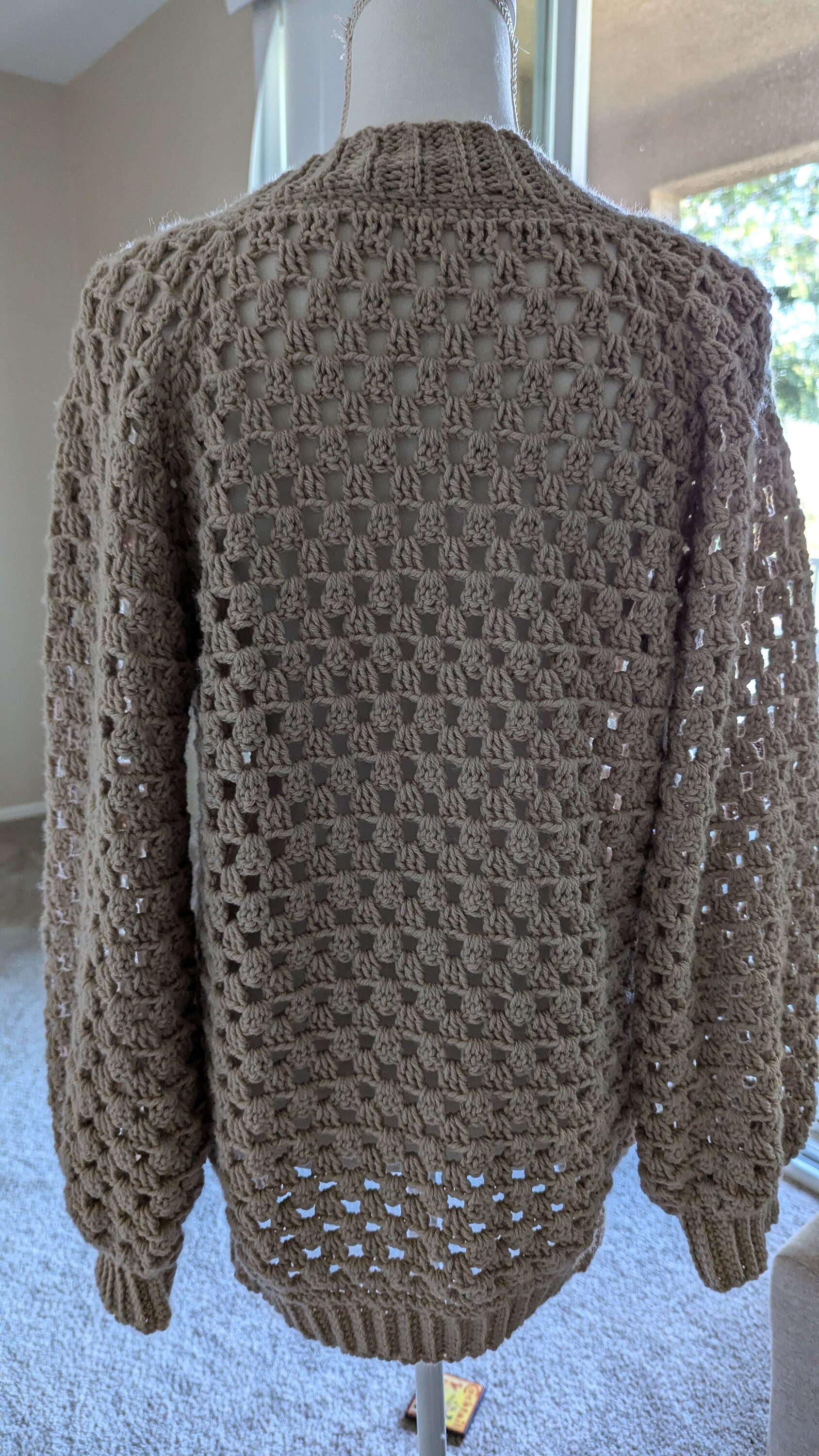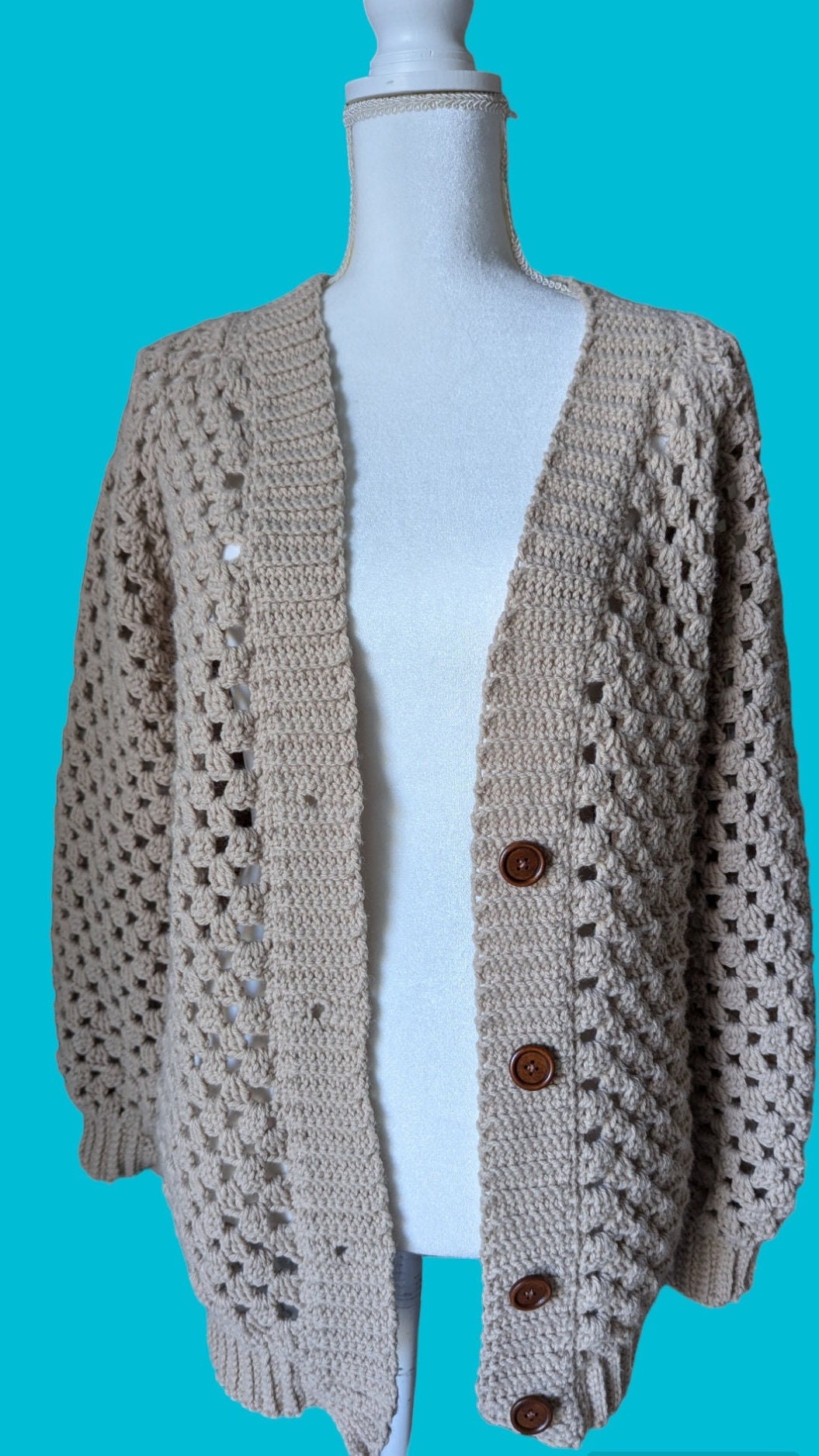 This handmade crochet cardigan features a cozy, open-knit pattern that creates a textured and airy design. It is crafted in a neutral beige yarn, making it versatile and easy to pair with various outfits. The cardigan includes a ribbed collar and cuffs for a snug fit, and it is secured with three wooden buttons down the front. The sleeves and body have a lacy, openwork pattern that adds both visual interest and breathability. This piece is perfect for layering in cooler weather, providing both warmth and style.