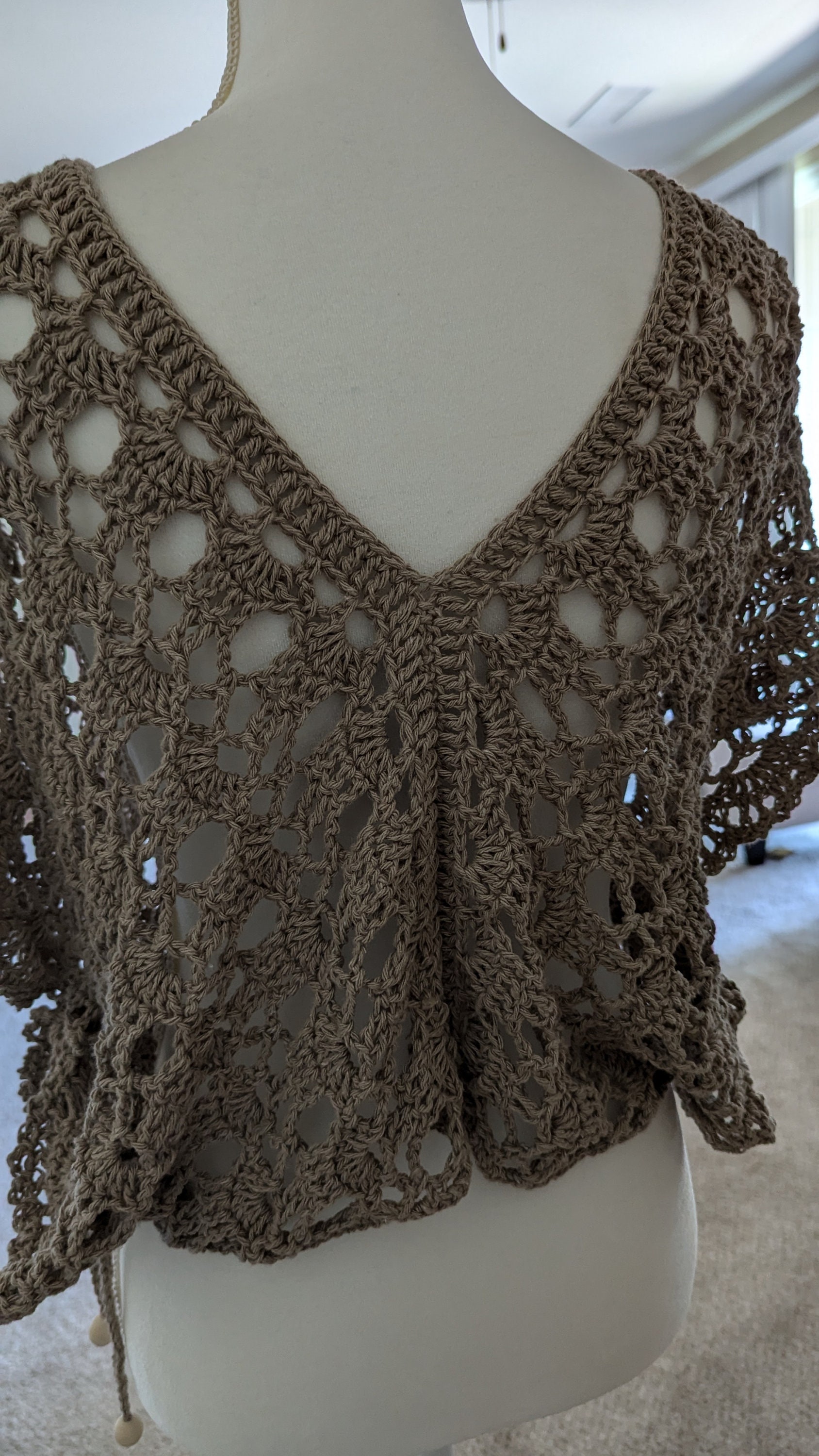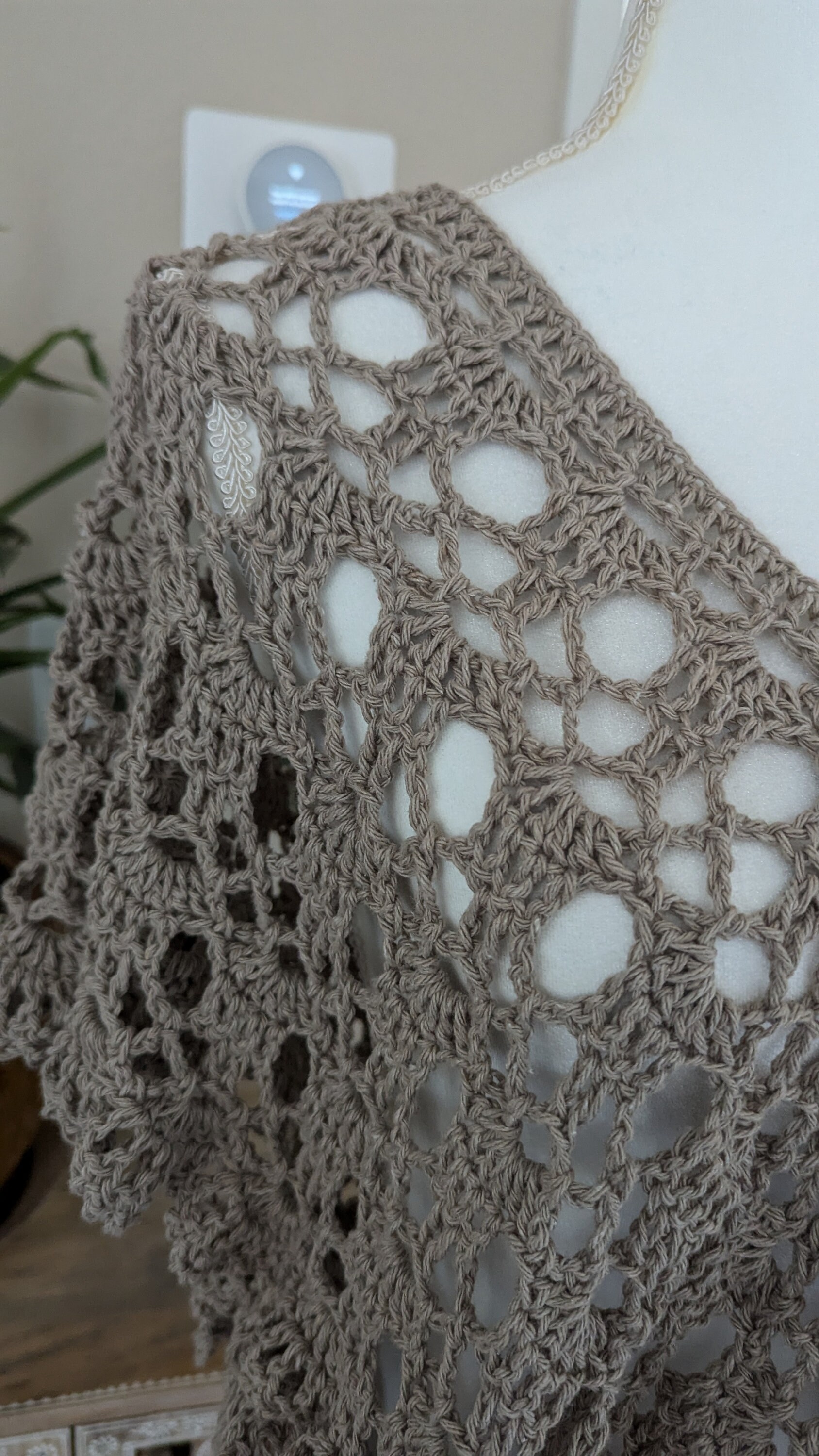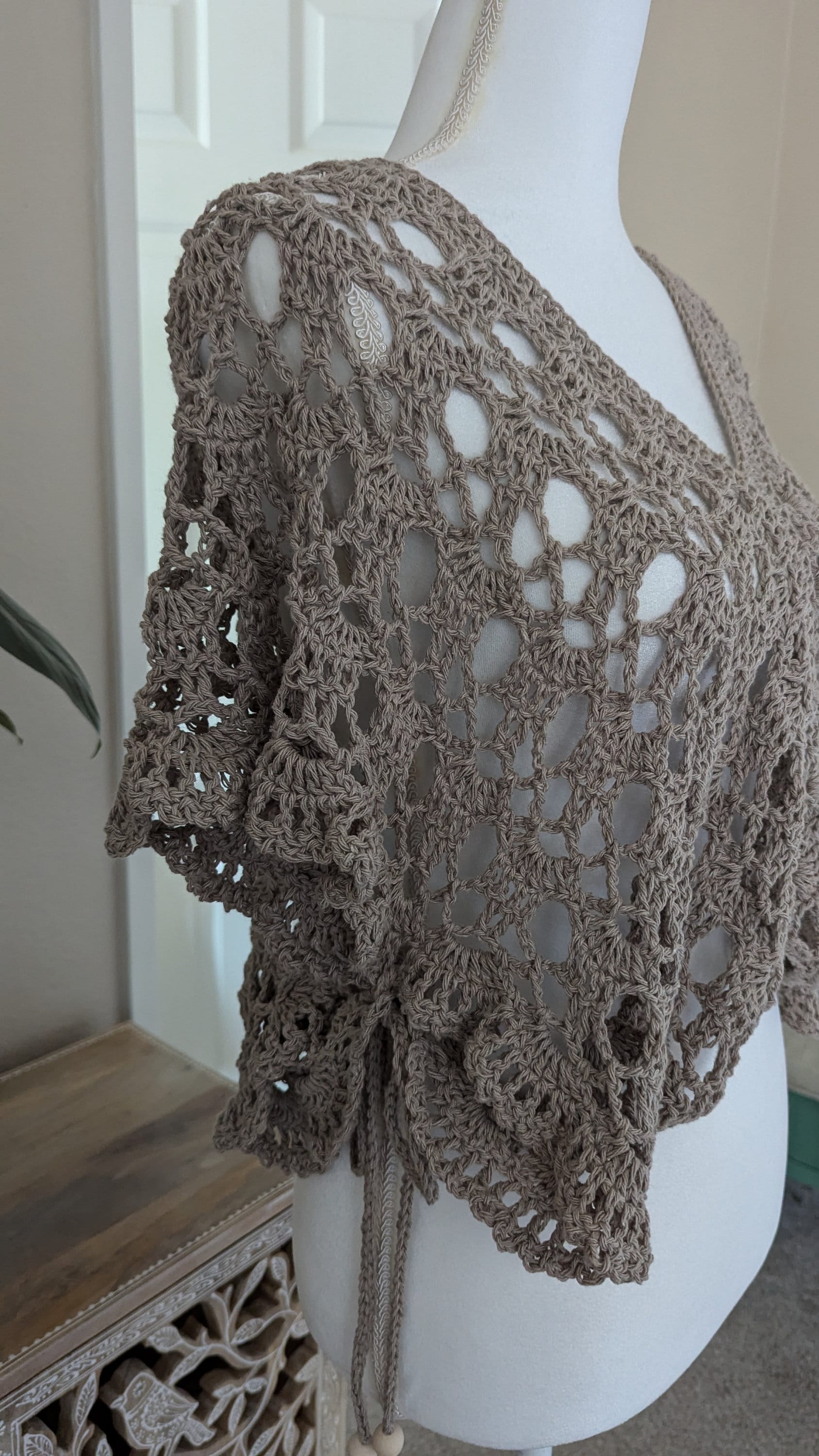 This handmade crochet bolero features a delicate taupe butterfly lace design, offering an elegant and airy look. The intricate pattern adds a touch of sophistication, making it a versatile piece for layering over dresses or tops. The bolero is enhanced with adjustable tie strings on the sides, allowing for a customizable fit to suit various body shapes and sizes. This stylish and unique piece combines both functionality and beauty, perfect for adding a bohemian flair to any outfit.
