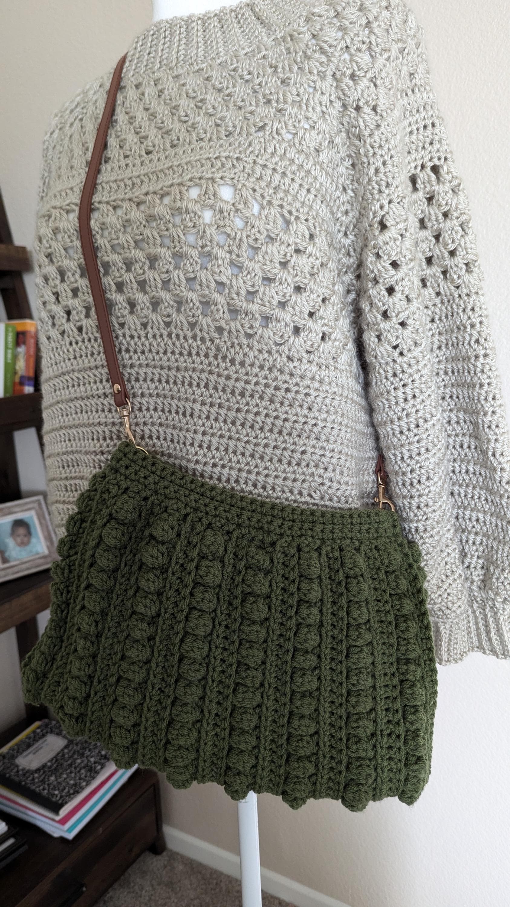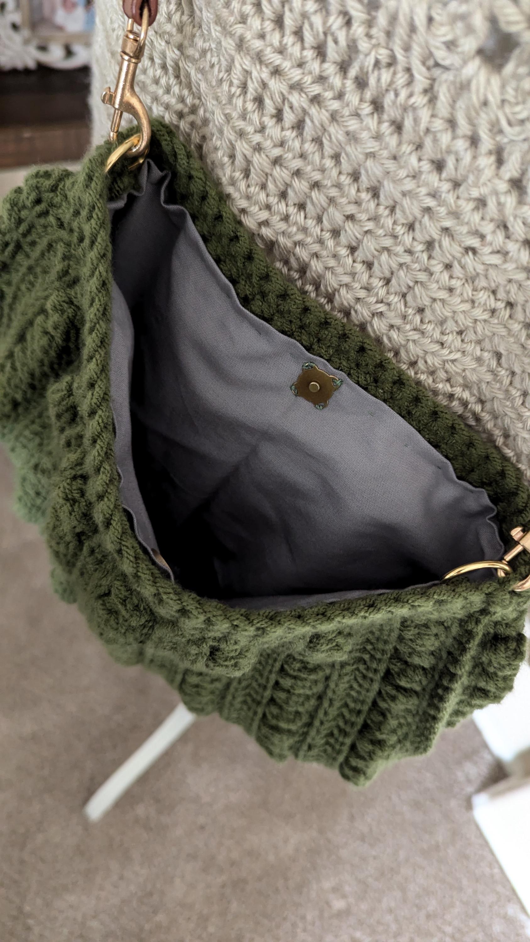 The "Forest Ridge" crochet bag is a beautifully handcrafted piece, featuring rich, forest-green yarn and a striking texture created by bobble stitches. Its ribbed design adds depth and a tactile quality, while the neutral leather strap complements the earthy tones. Perfect for both casual and semi-formal outings, this bag offers a harmonious blend of style and craftsmanship, making it an eye-catching accessory for nature lovers or anyone seeking a chic, handmade statement piece.