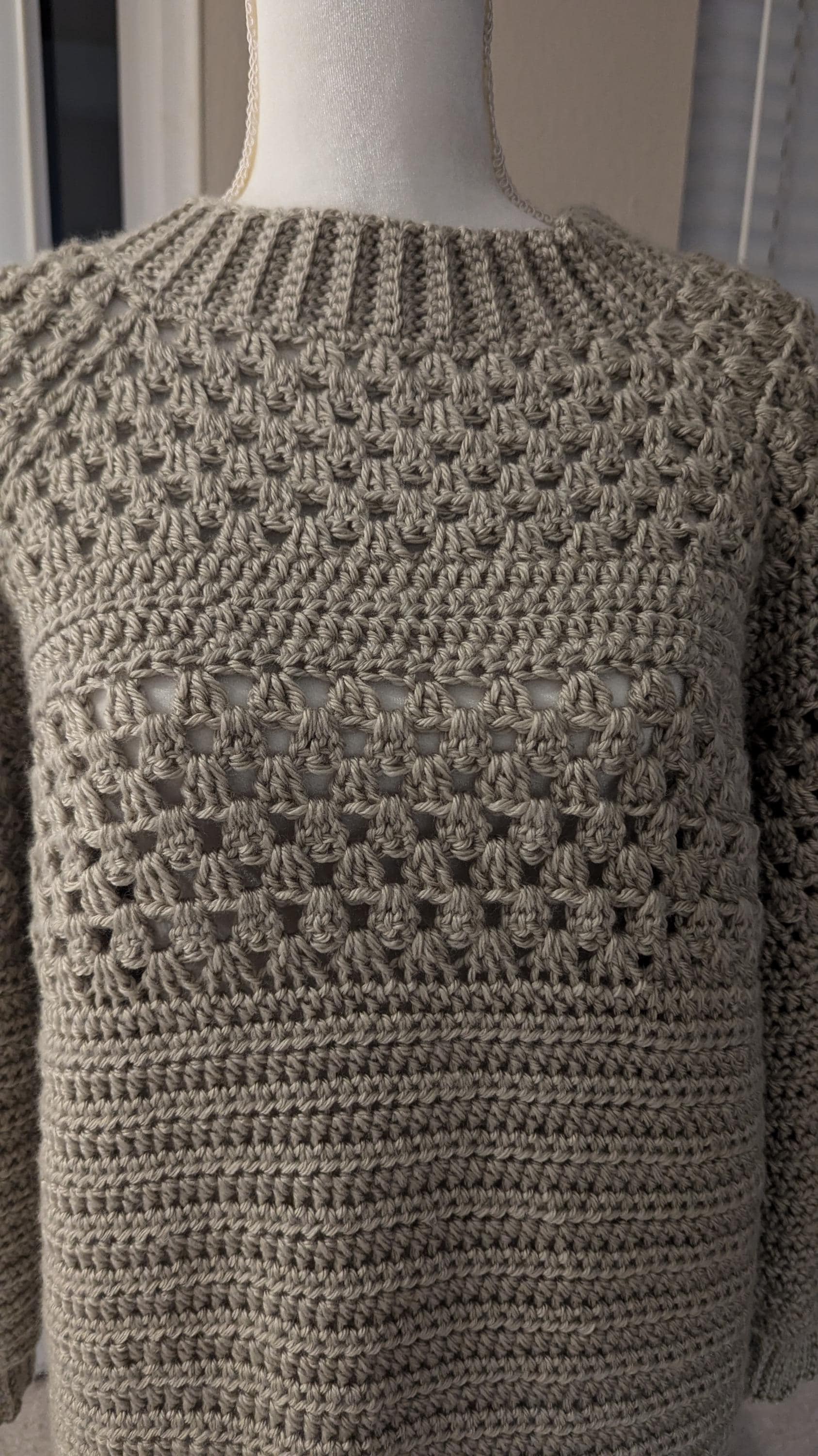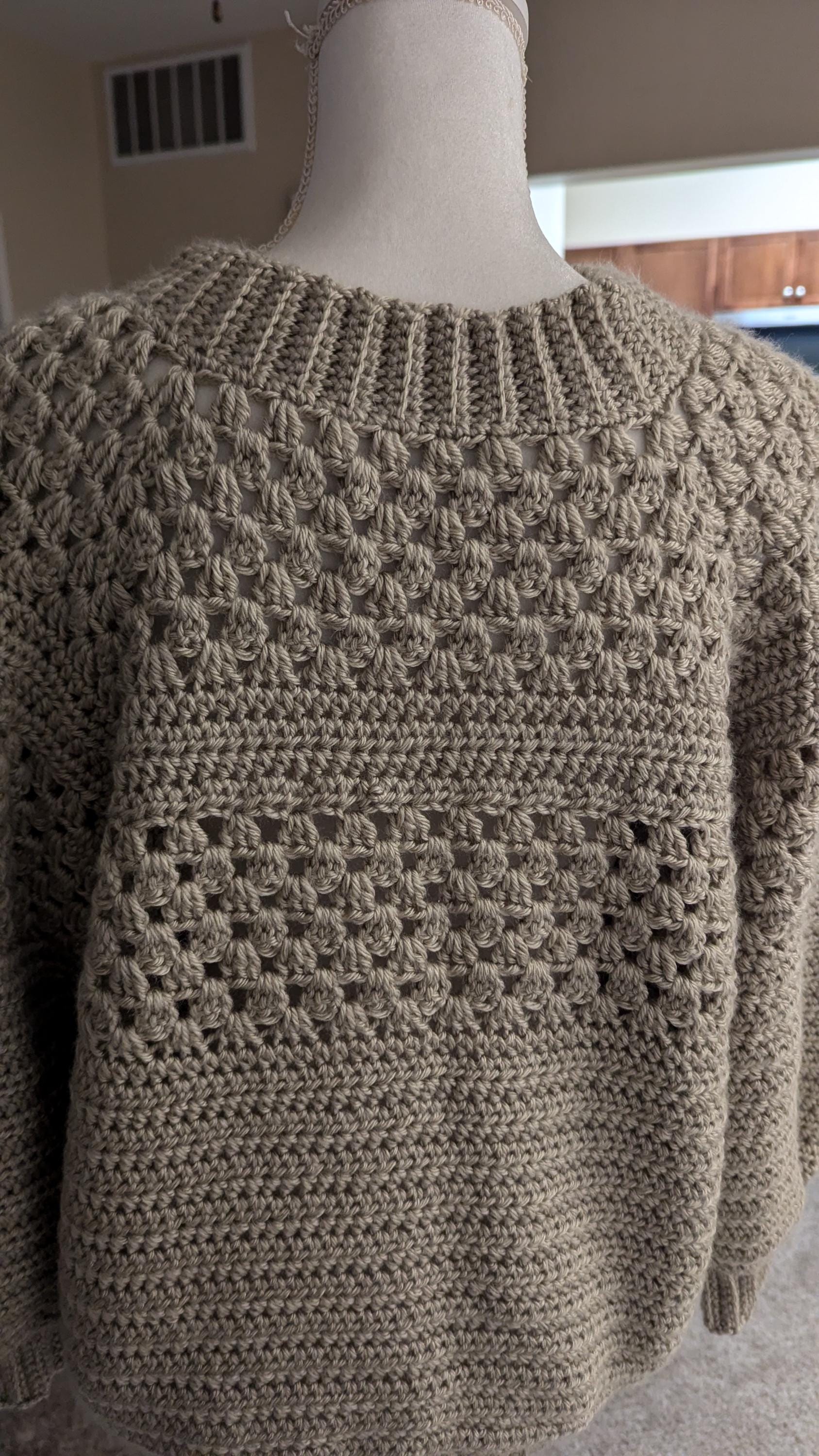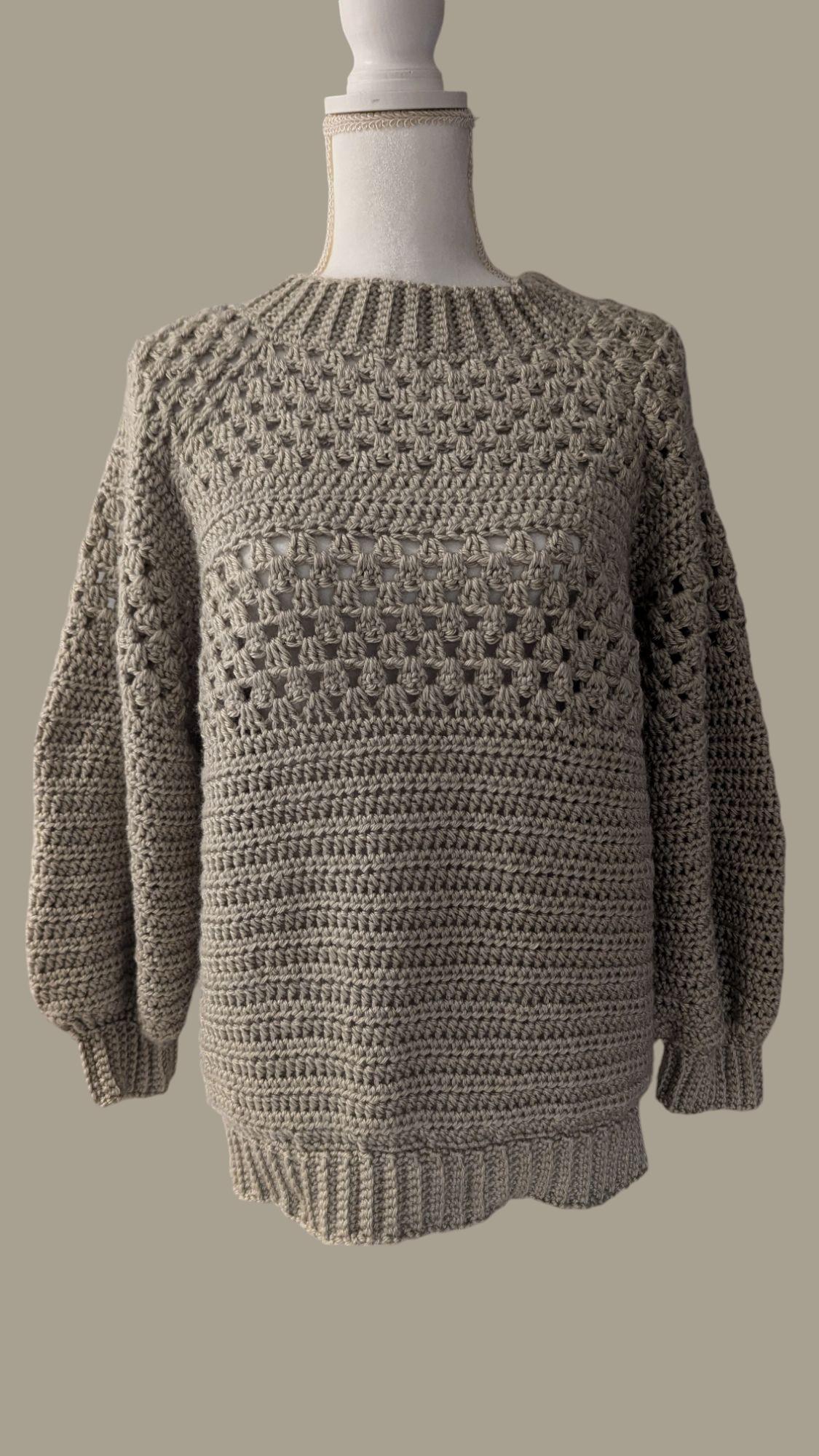 This handmade crochet sweater, crafted from premium acrylic yarn, offers a combination of comfort and durability. Featuring a beautiful mix of textured stitches, it includes detailed bobble-like patterns on the upper chest and arms, contrasted with solid crochet rows. With its relaxed fit and ribbed neckline, cuffs, and hem, this sweater is perfect for layering and everyday wear.