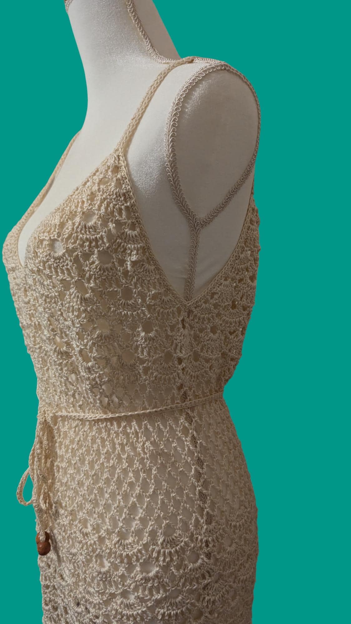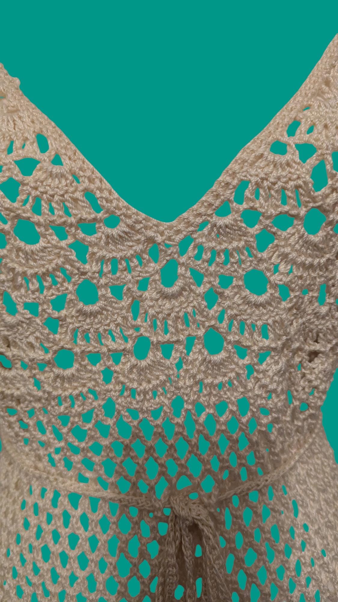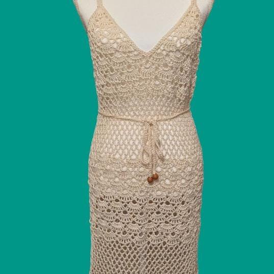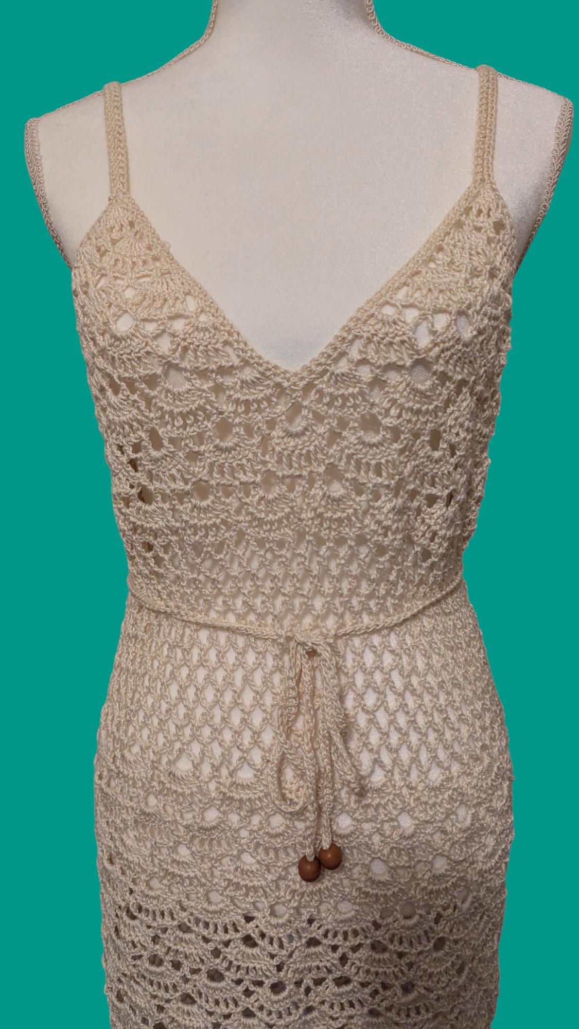 This handmade crochet dress, crafted with 100% cotton, exudes elegance and timeless charm. Its intricate lacework features delicate floral and scalloped patterns, creating a balance of texture and transparency. The adjustable waist tie with wooden bead accents adds a touch of rustic sophistication, ensuring a comfortable yet flattering fit. Perfect for summer occasions or beach-side strolls, this piece embodies the artistry and care of traditional crochet techniques.
