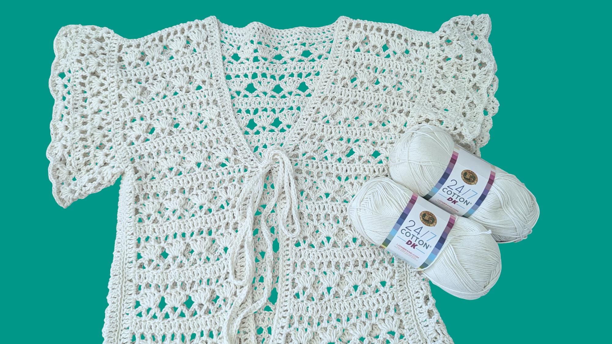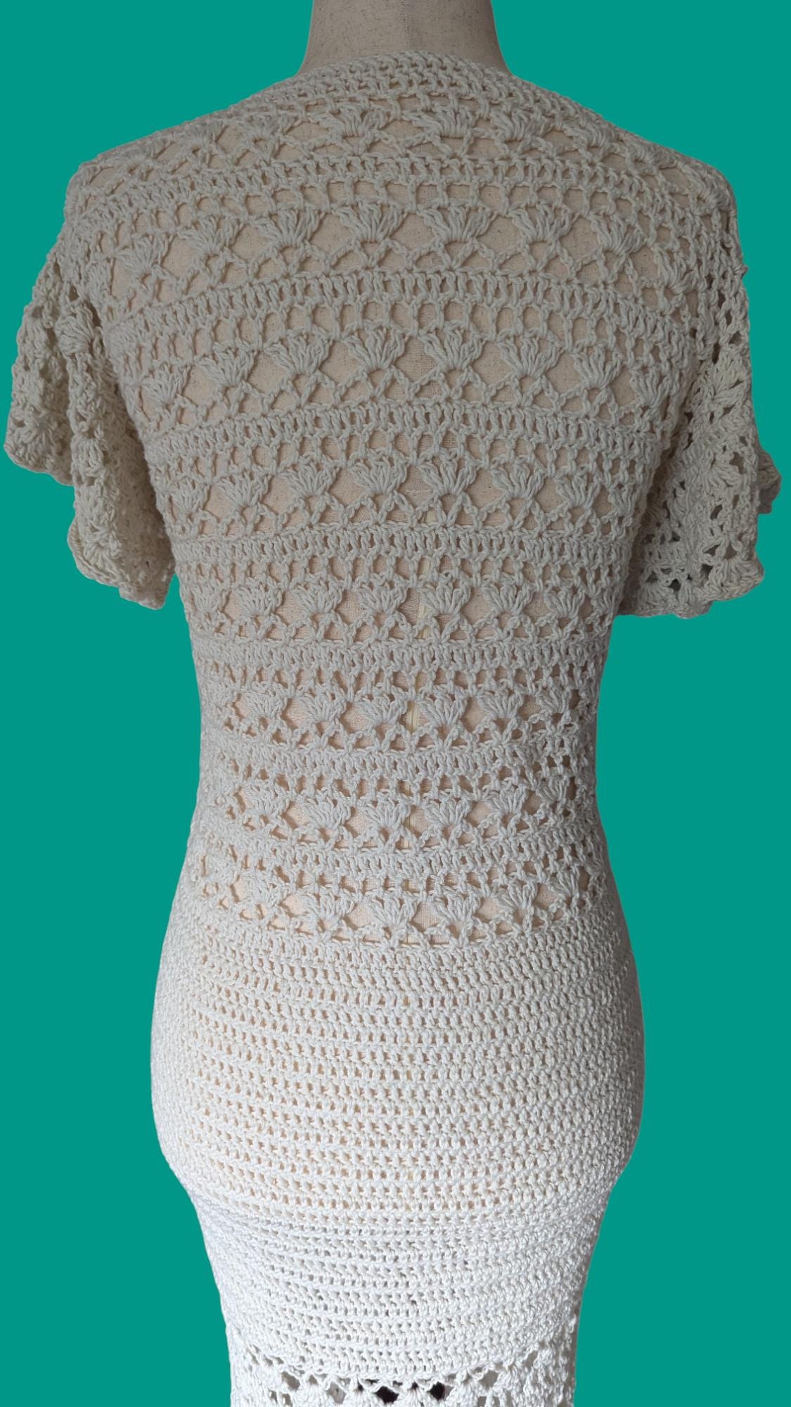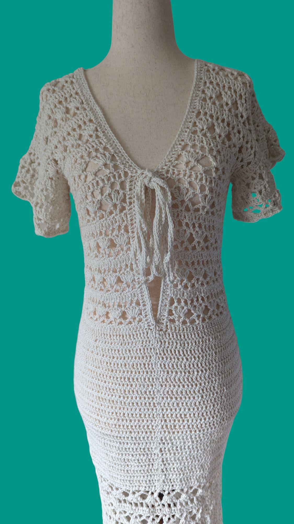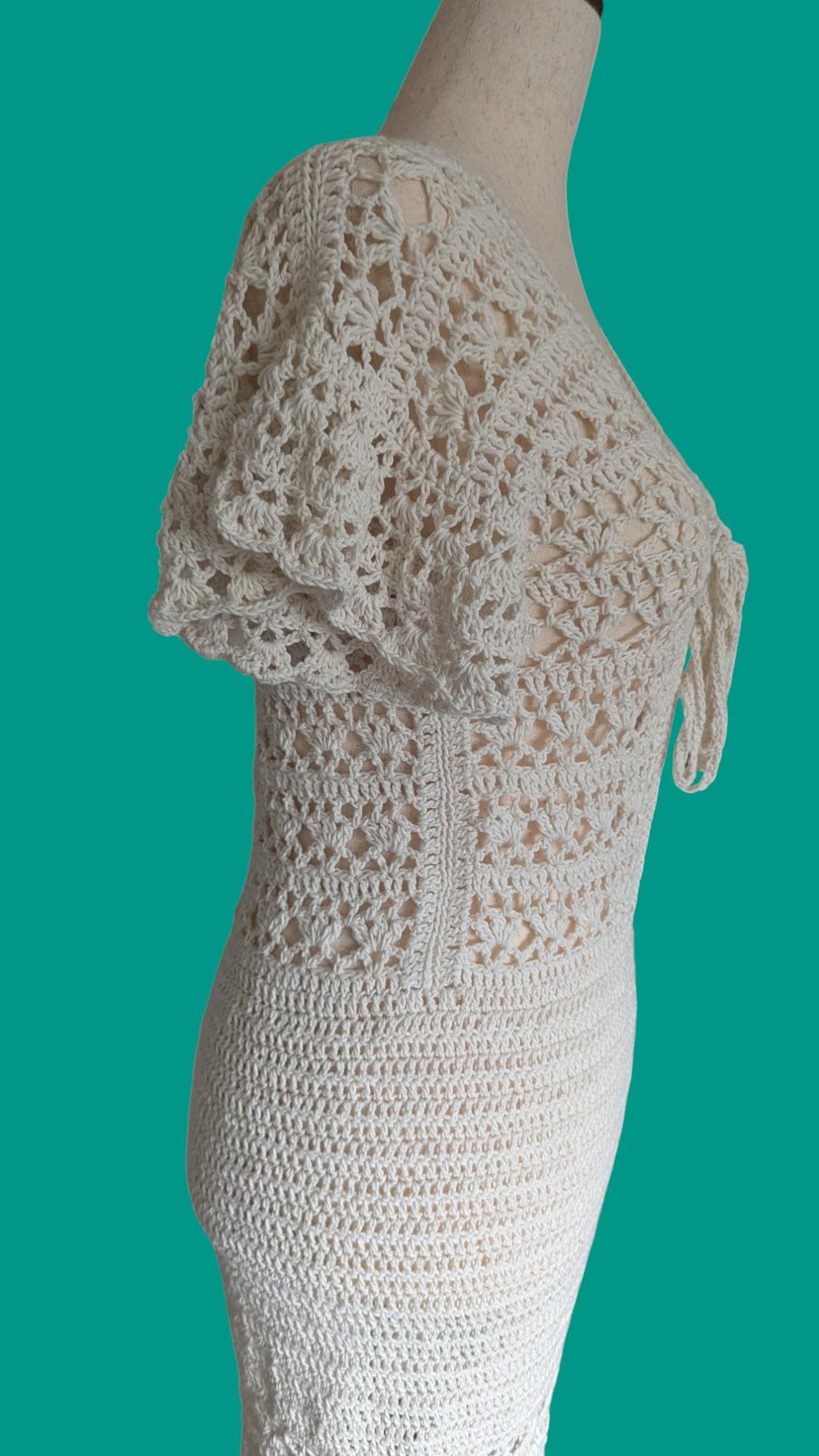 This exquisite handmade crochet dress showcases a vintage-inspired design crafted from 100% cotton yarn, ensuring a soft and breathable texture. The delicate lace patterns blend seamlessly with solid crochet sections, creating a balanced mix of charm and sophistication. Featuring flutter sleeves and a flattering tie detail at the neckline, this dress is perfect for summer outings or special occasions. The scalloped hem and intricate openwork at the skirt add an extra touch of elegance, making it a standout piece in any wardrobe.