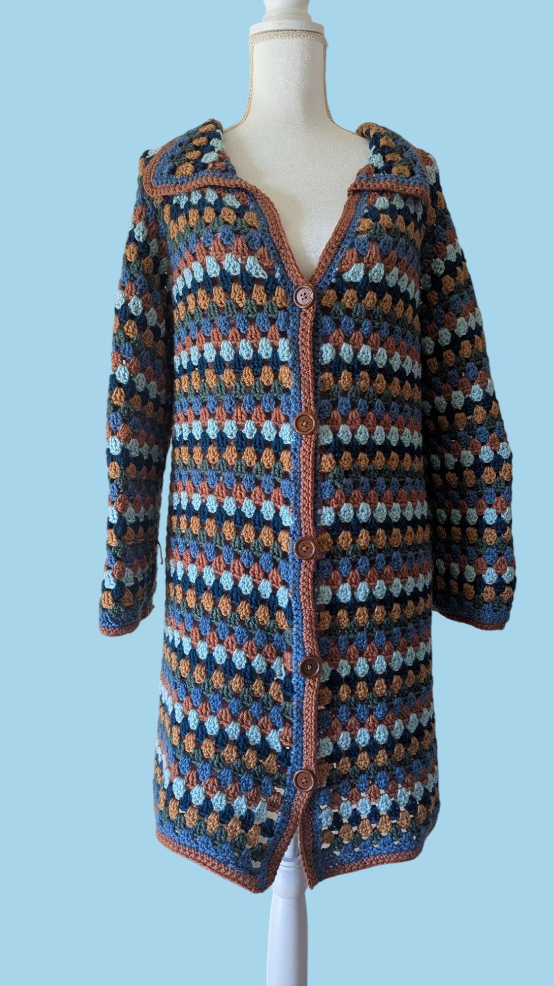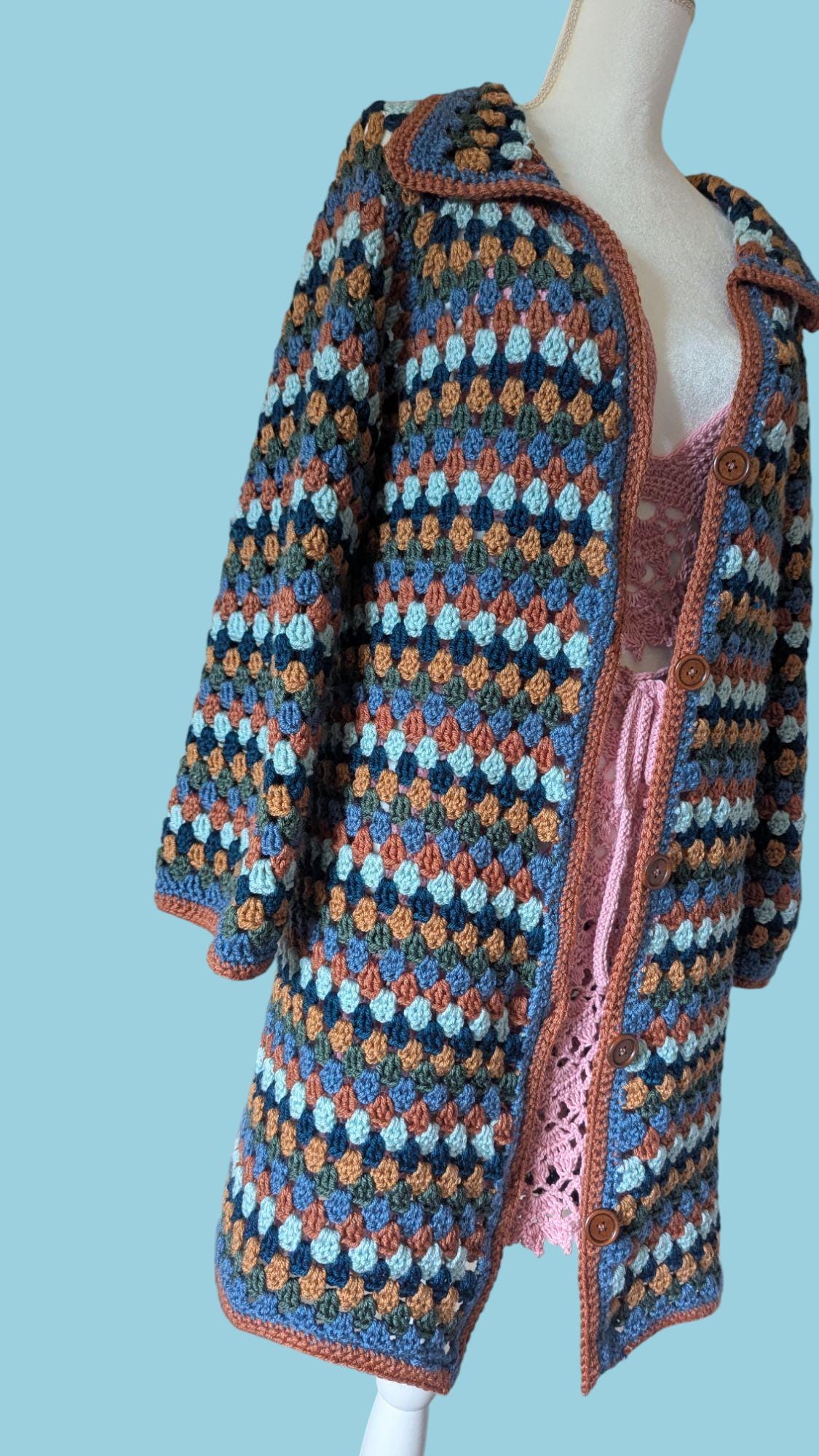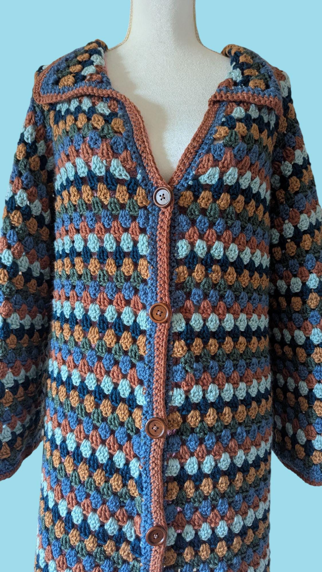 The Autumn Breeze Cardigan is a handcrafted crochet piece made from high-quality anti-pilling acrylic yarn, ensuring long-lasting softness and durability. Designed with a classic granny stitch pattern, it showcases a harmonious blend of earthy tones—deep blues, warm browns, and soft teals—perfect for adding a cozy touch to any wardrobe. The anti-pilling yarn helps maintain its smooth texture and vibrant colors, even after repeated wear and washing. Finished with a delicate contrasting border and wooden buttons, this cardigan is both stylish and practical, offering warmth and comfort for any season.