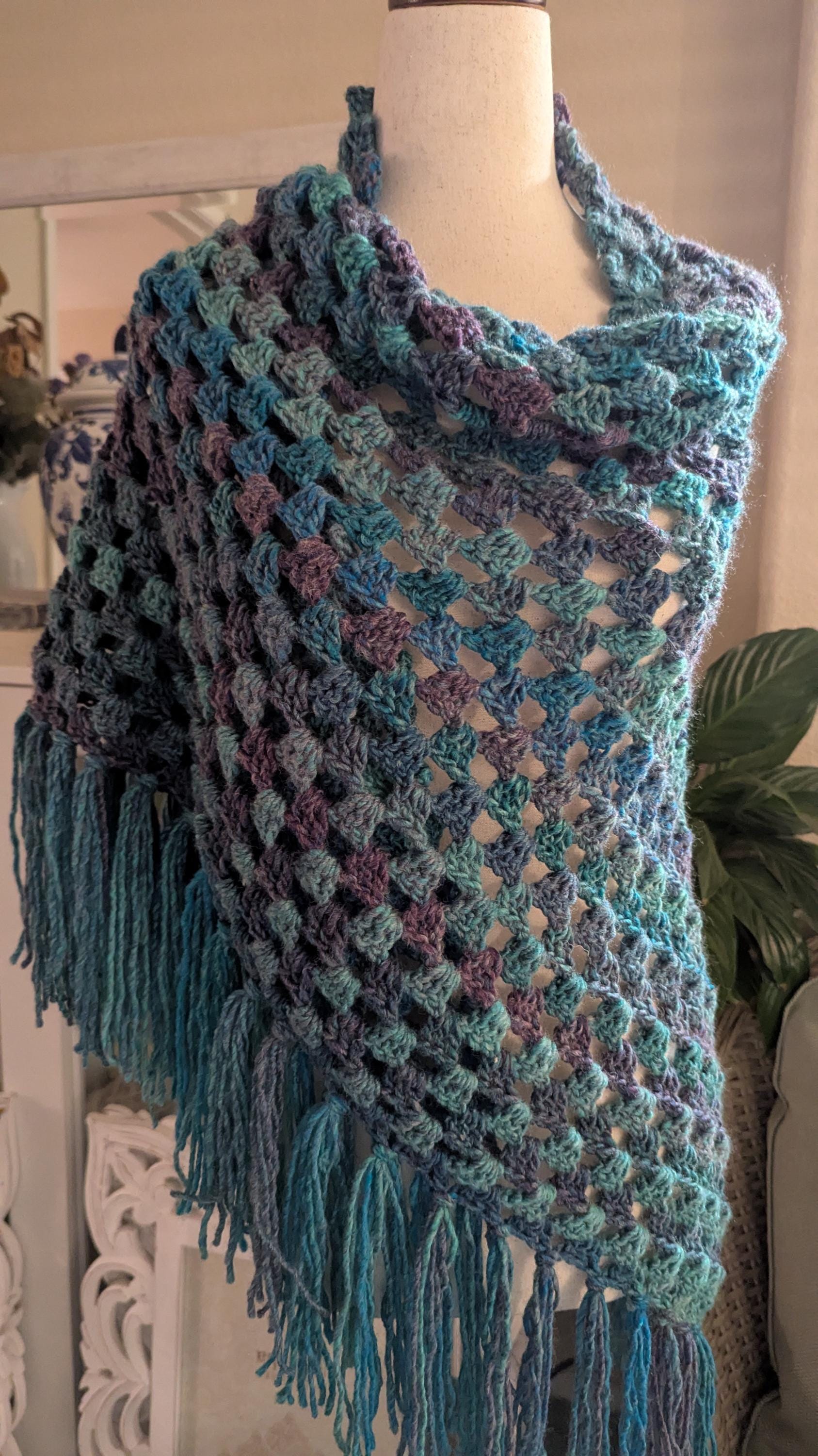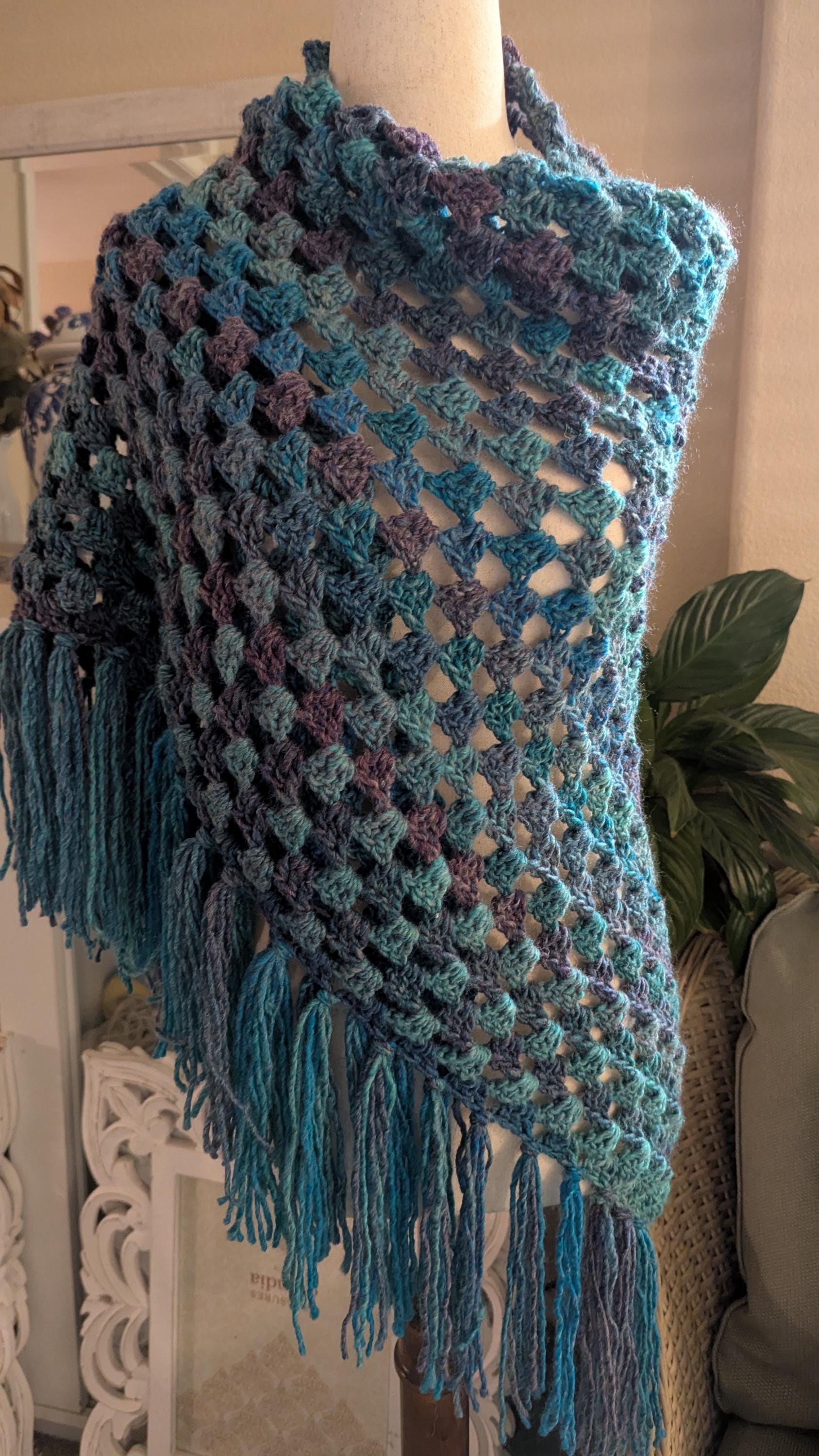 The Ocean Mist Crochet Shawl captures the soothing beauty of sea and sky with its gradient shades of blue, teal, and soft gray. Handcrafted with an airy, open-lace stitch pattern, this lightweight triangle shawl drapes gracefully over the shoulders, perfect for any season. Finished with a playful fringe, it adds a touch of bohemian charm and cozy warmth — an elegant accessory for both casual days and special evenings.