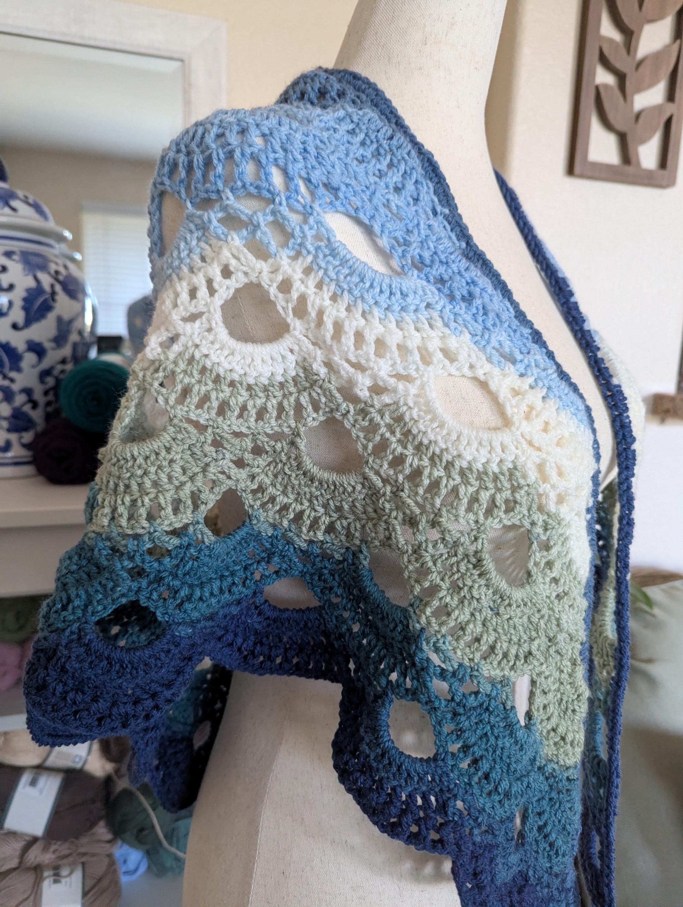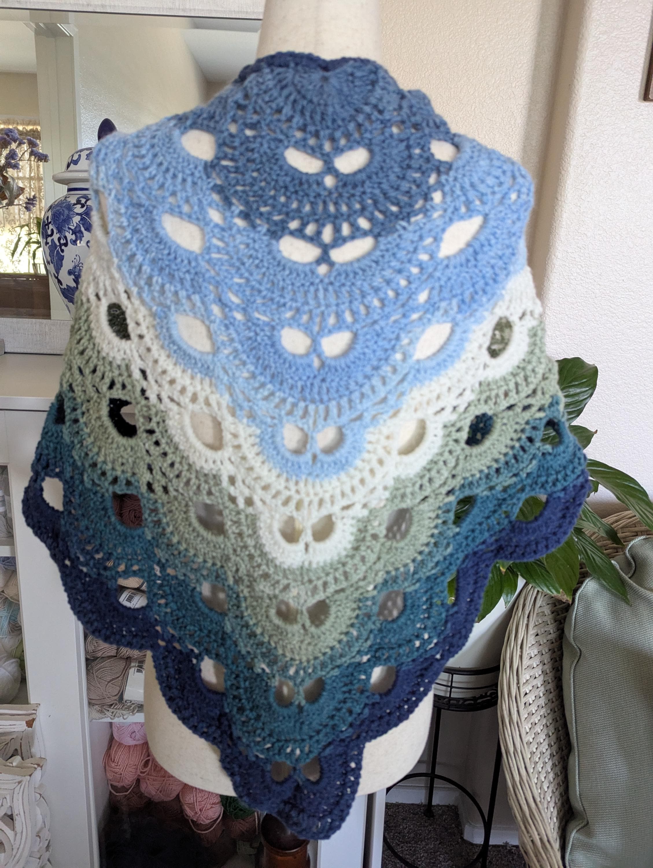 The flowing gradient of ocean blues, icy mint, and frosty cream creates a soothing ombré reminiscent of frozen shores and misty winter mornings. Lightweight yet cozy, its scalloped edges and lacy texture add both elegance and comfort. Whether draped over your shoulders or wrapped snugly around your neck, this shawl is a timeless piece that brings a touch of seasonal magic to your wardrobe.