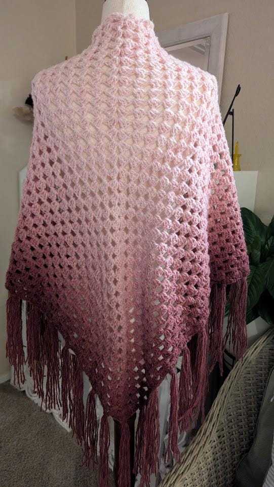 The Rosewood Fade Granny Shawl blends timeless charm with a modern gradient twist. Handcrafted in the classic granny stitch pattern, this cozy triangle shawl shifts gracefully from soft blush to deep rose tones, creating a soothing ombré effect. Finished with long, flowing fringe for added texture and movement, it’s the perfect lightweight wrap for chilly mornings, evening strolls, or adding a romantic touch to any outfit.