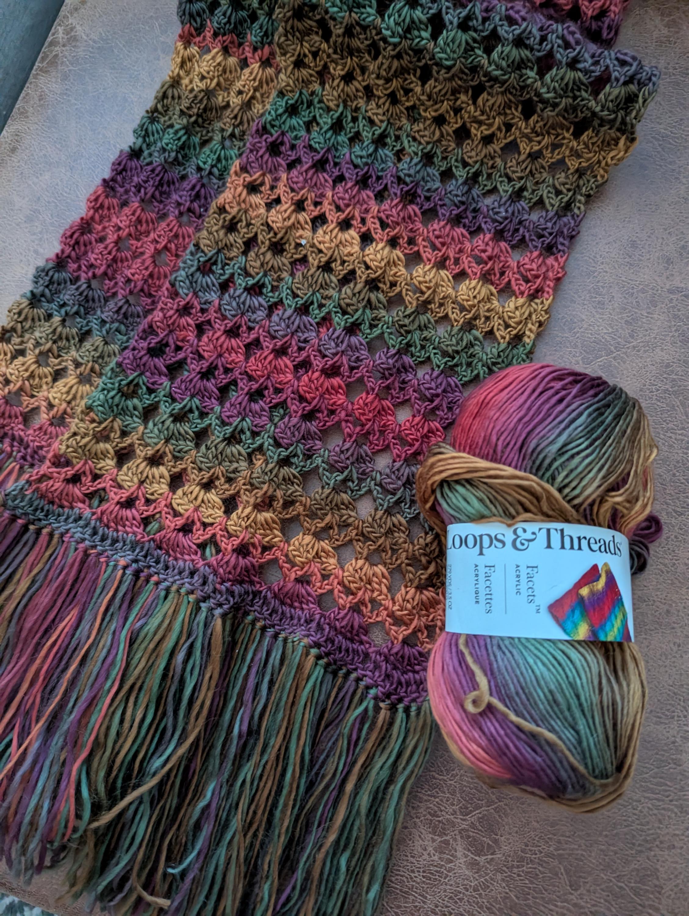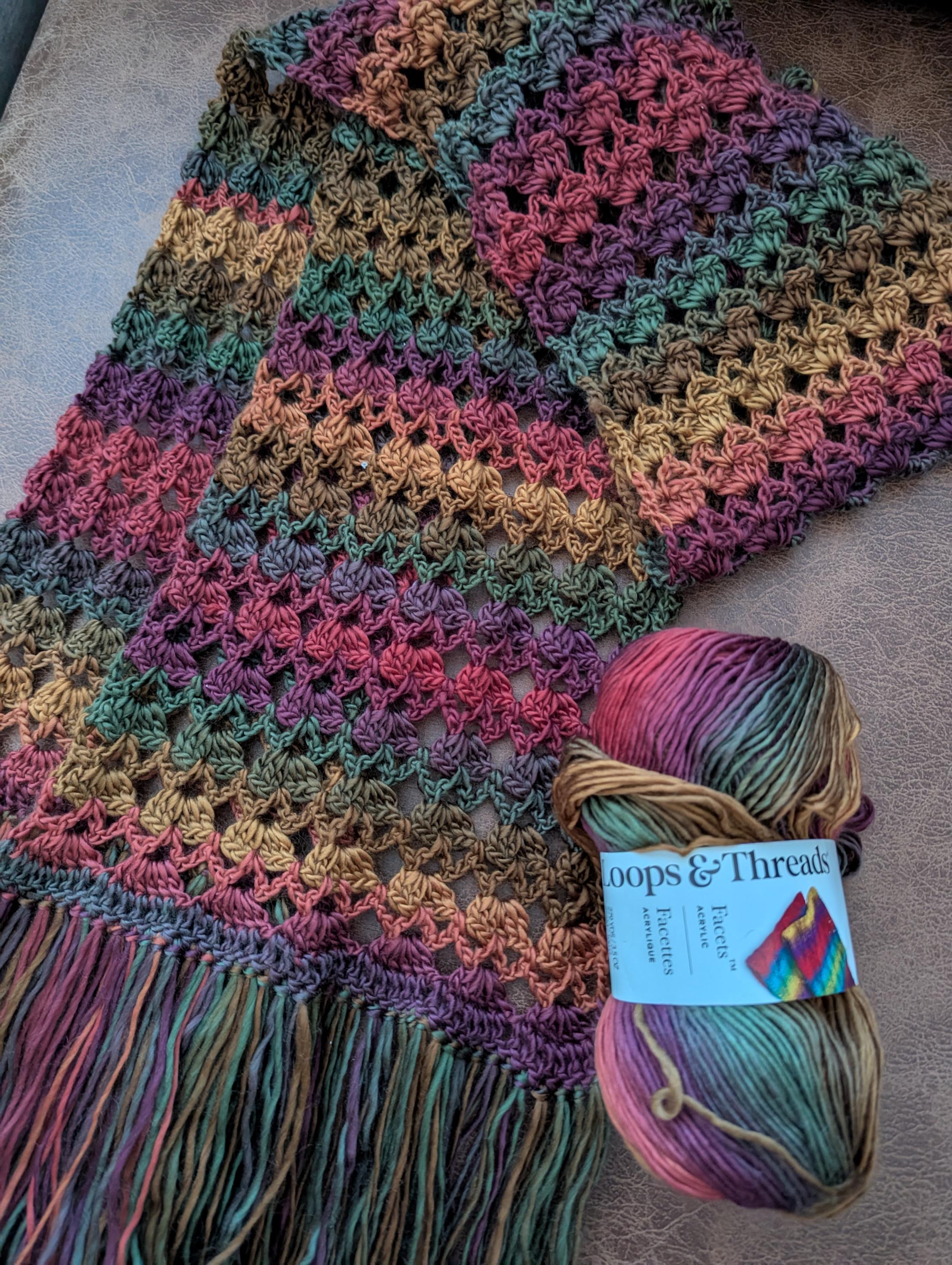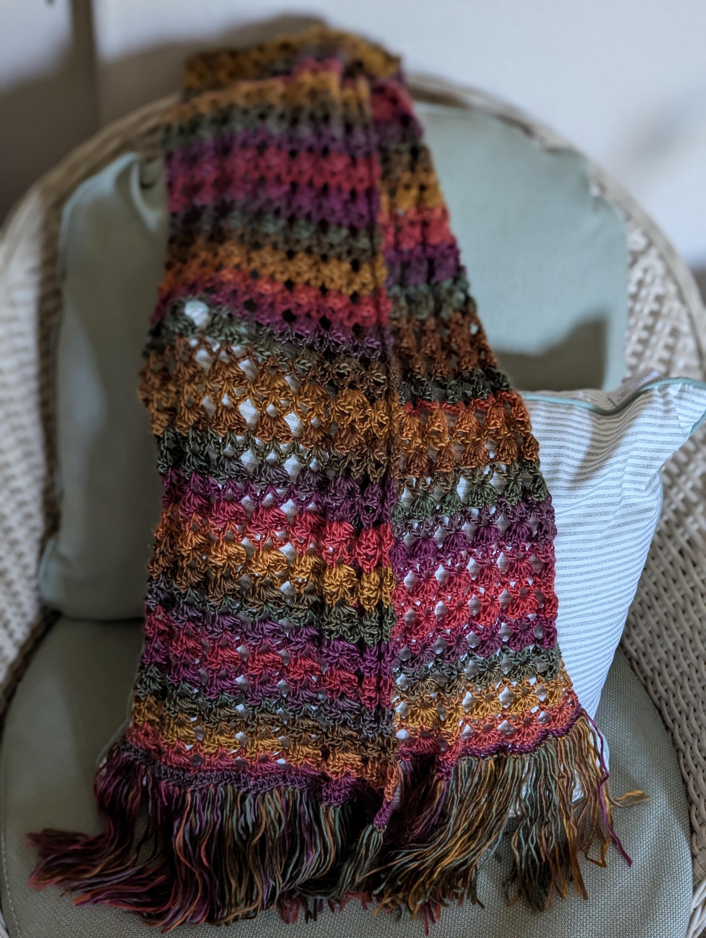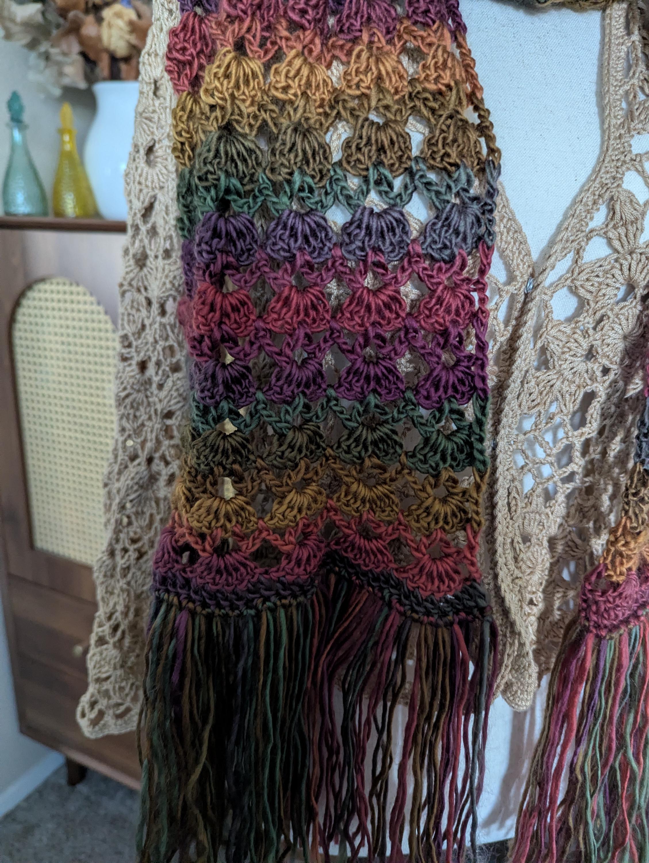 Iโm in love with how the colors melt from deep plum to warm gold and forest green. The soft waves, openwork stitches, and long flowing fringe give it that perfect woodland-romance vibe.