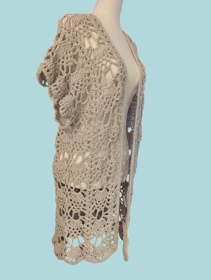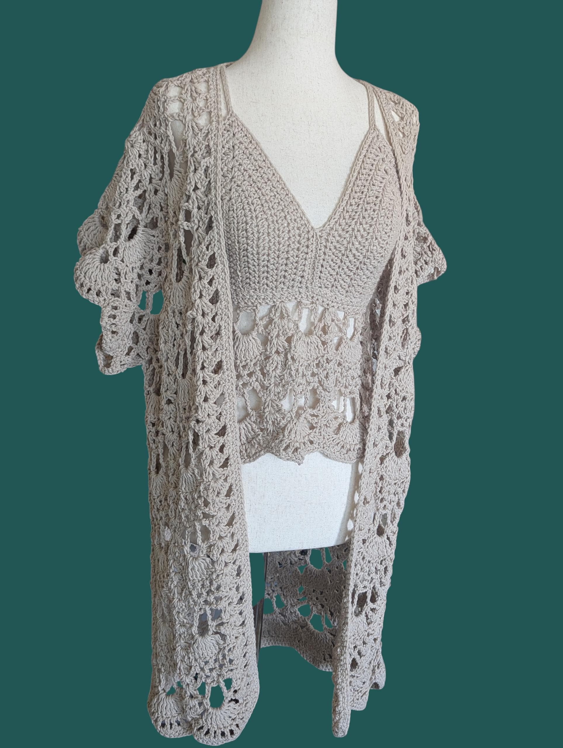 The Seabreeze Lace Crochet Kimono is a lightweight, airy layering piece handcrafted with 85 % cotton/ 15% polyester yarn for breathable comfort and natural softness. Featuring an elegant openwork lace pattern and relaxed drape, this duster adds effortless texture and movement to any outfit. Perfect for warm-weather styling, it can be worn over dresses, swimwear, or casual tops for a chic boho-inspired look. Its versatile design makes it ideal for beach days, festivals, or everyday wear.