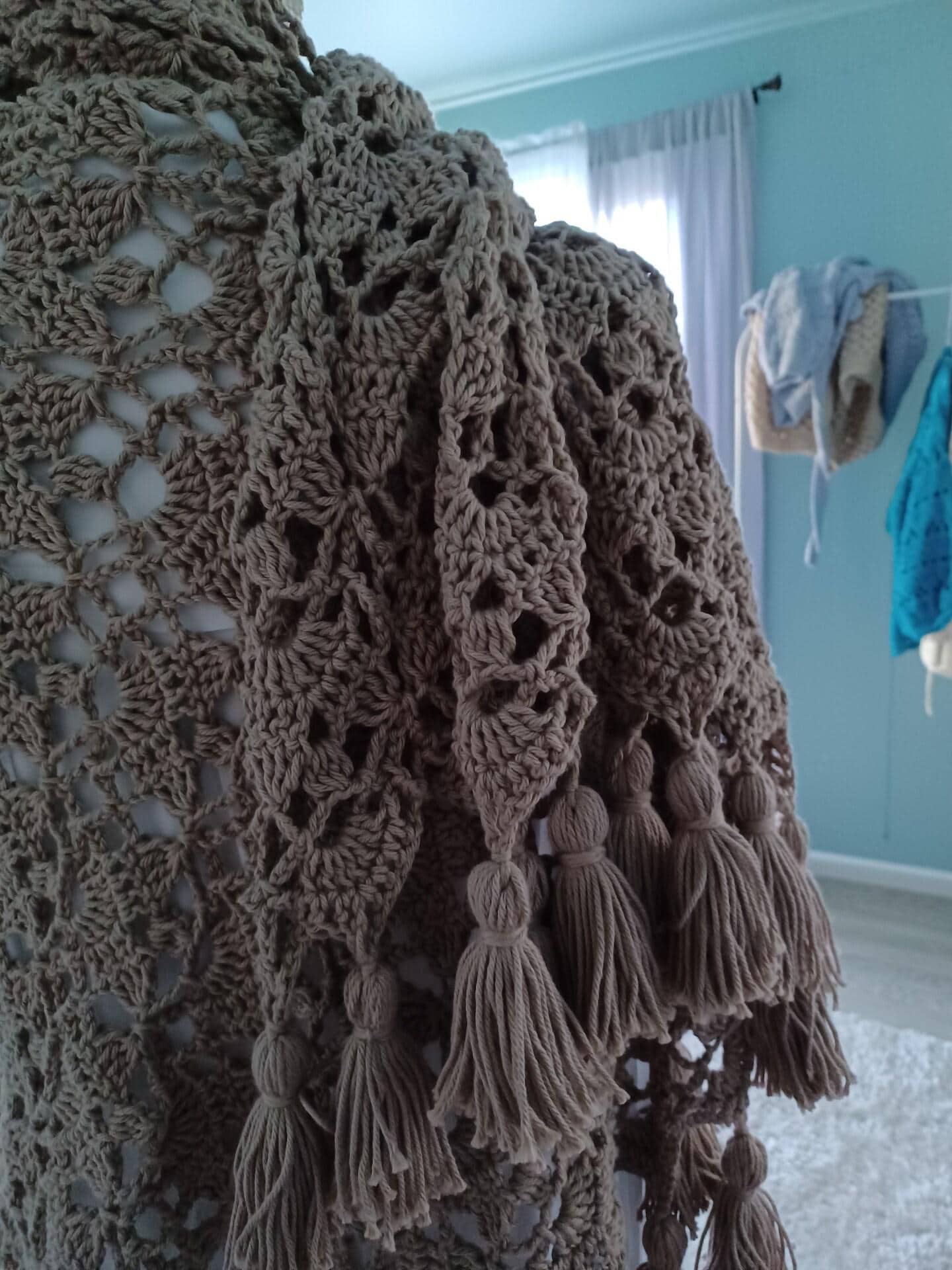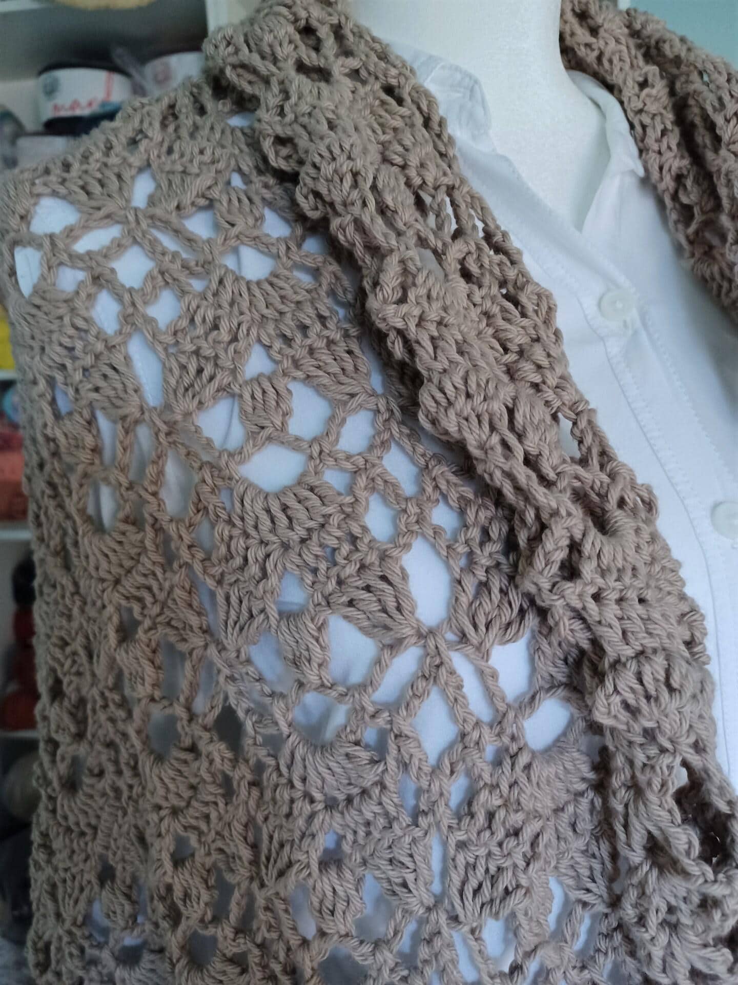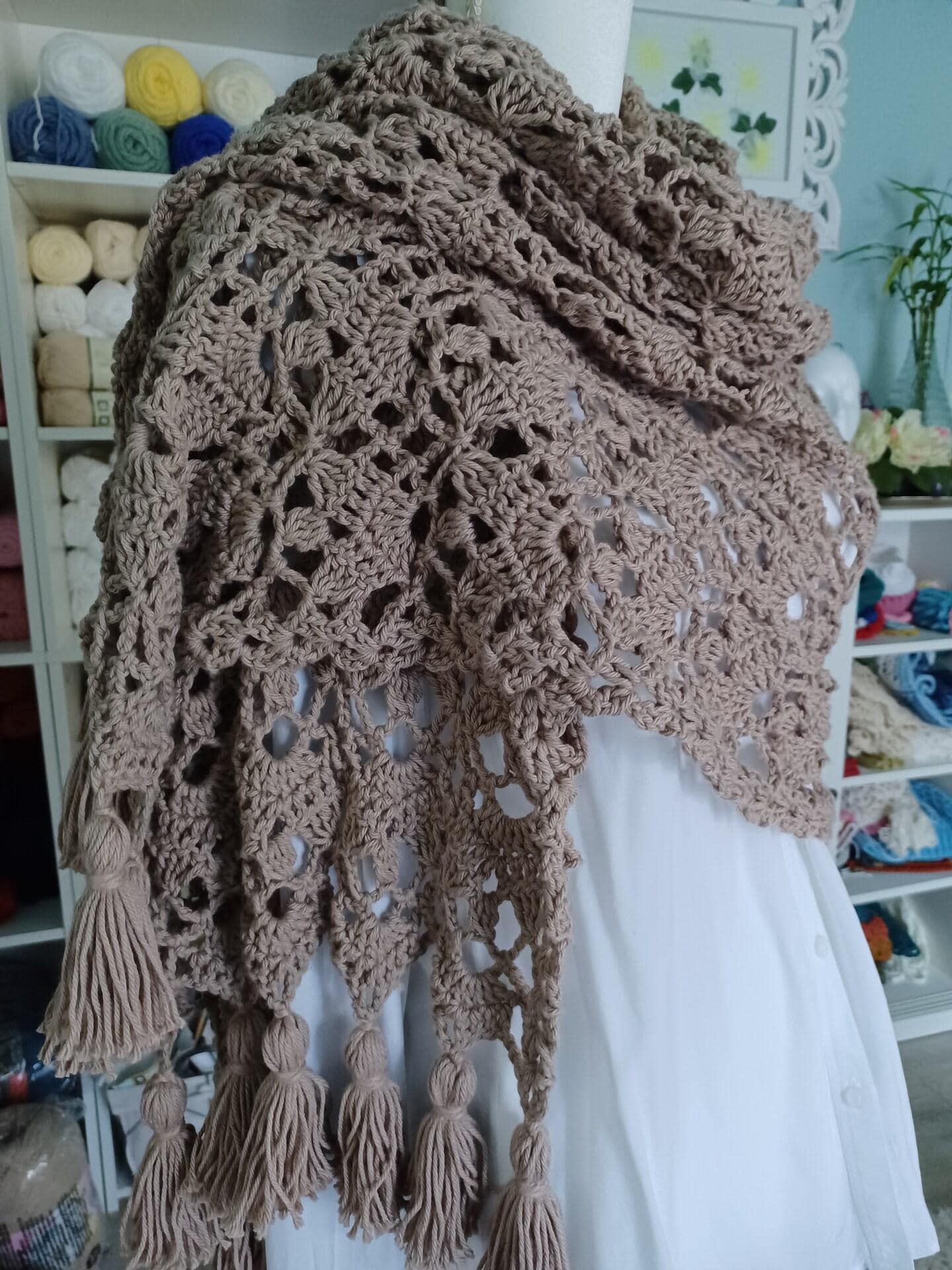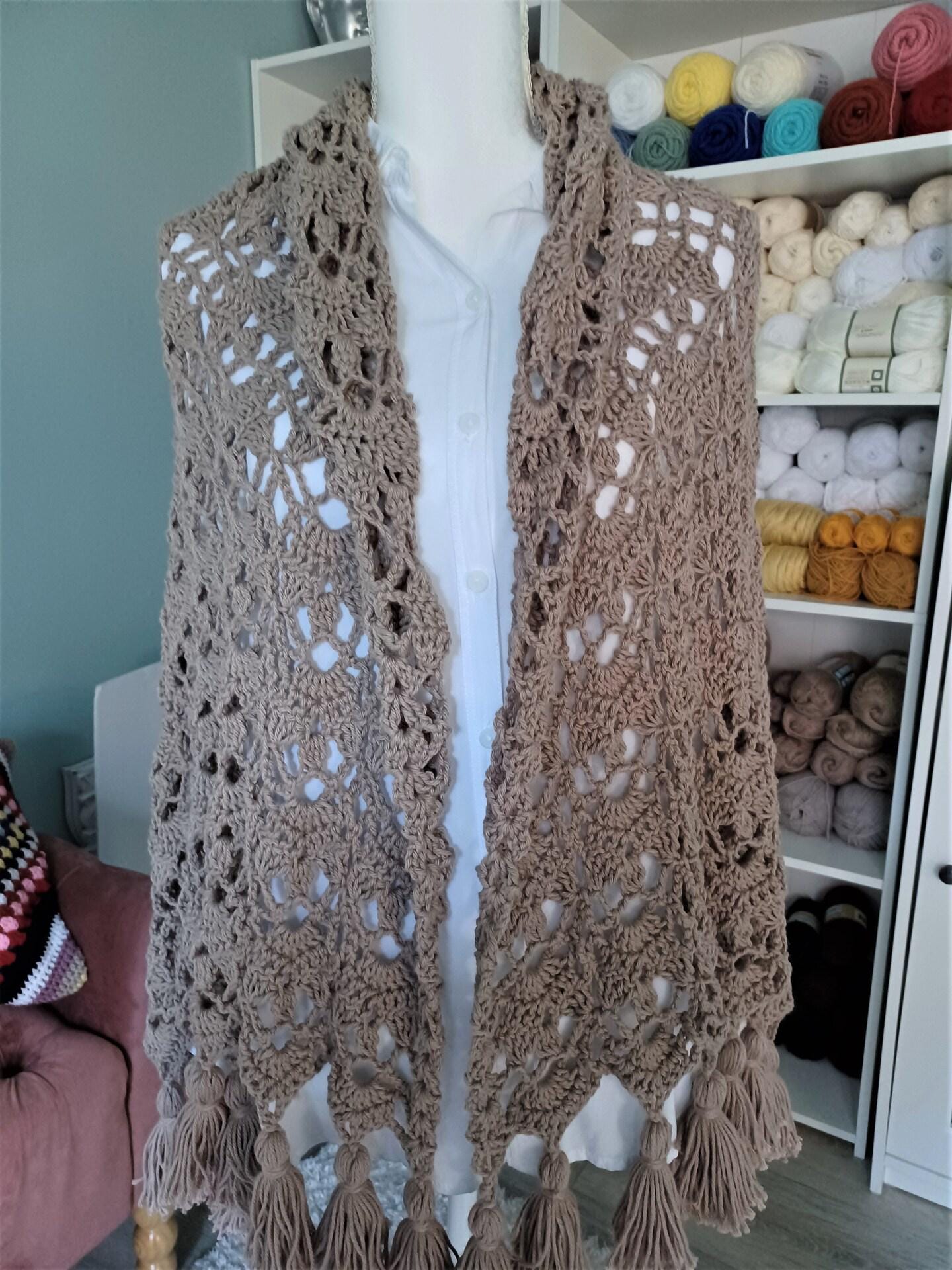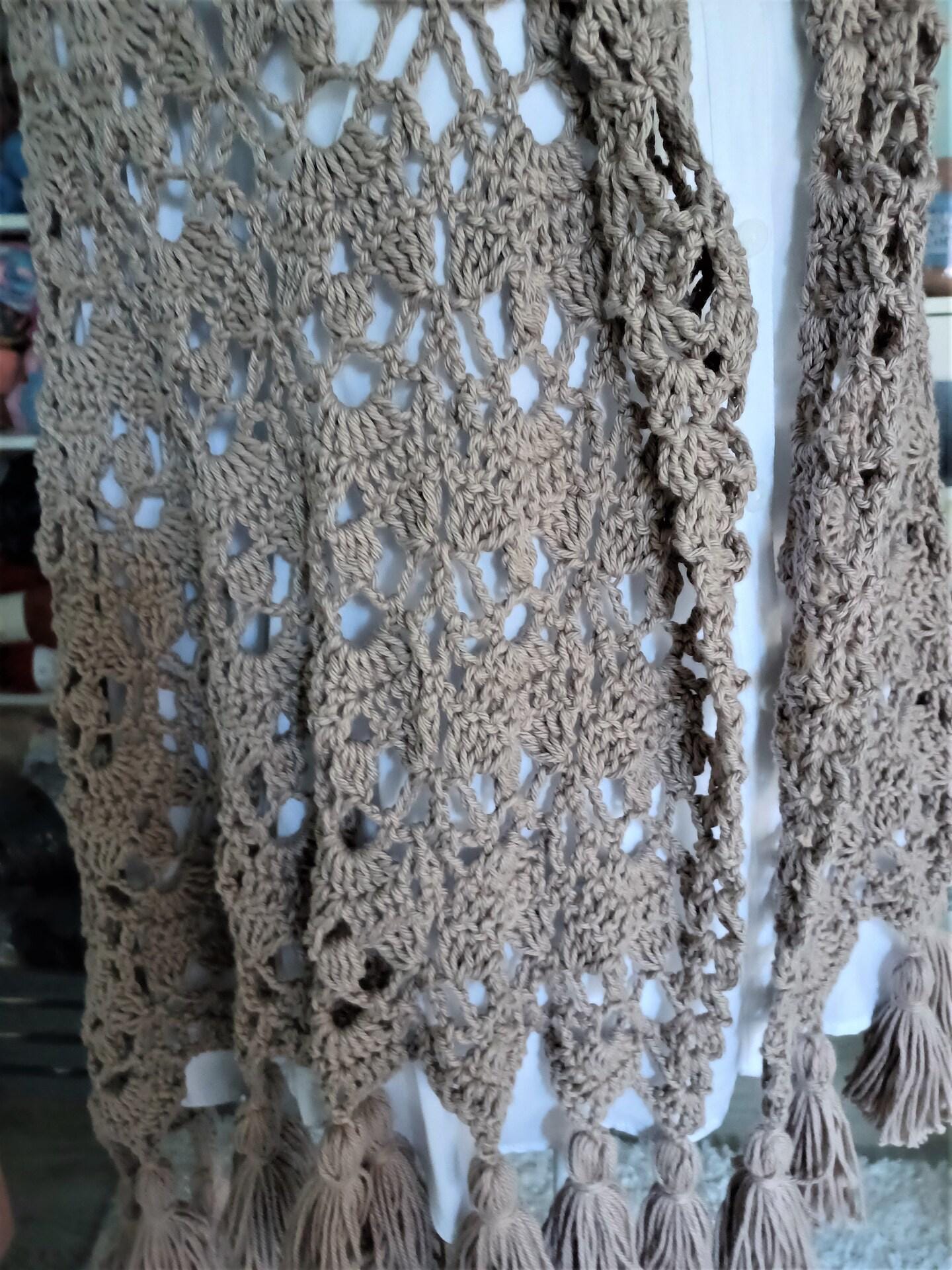 Expertly handcrafted with a timeless taupe floral lace design, this shawl is a versatile and stylish choice for any season and outfit. Made with precision and expertise, its delicate floral pattern adds a touch of elegance to any look. Additionally, its neutral color allows it to be easily paired with any outfit of your choosing. A must-have accessory for any fashion lover.