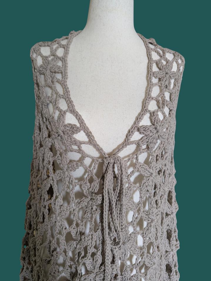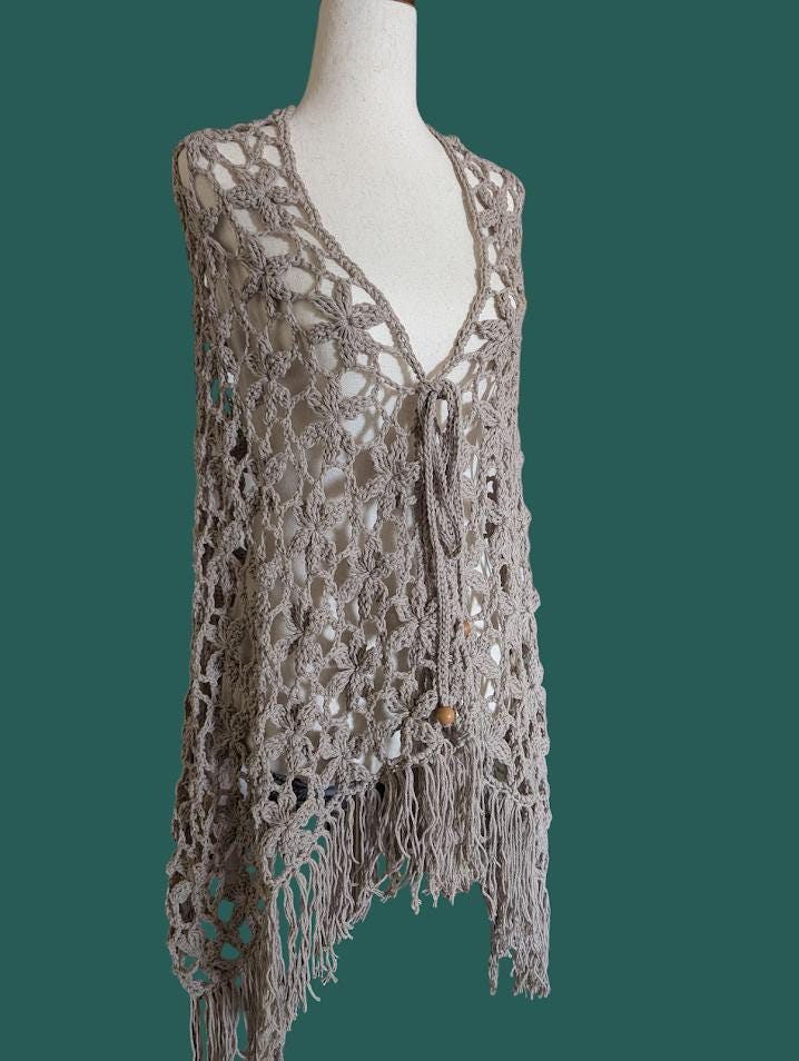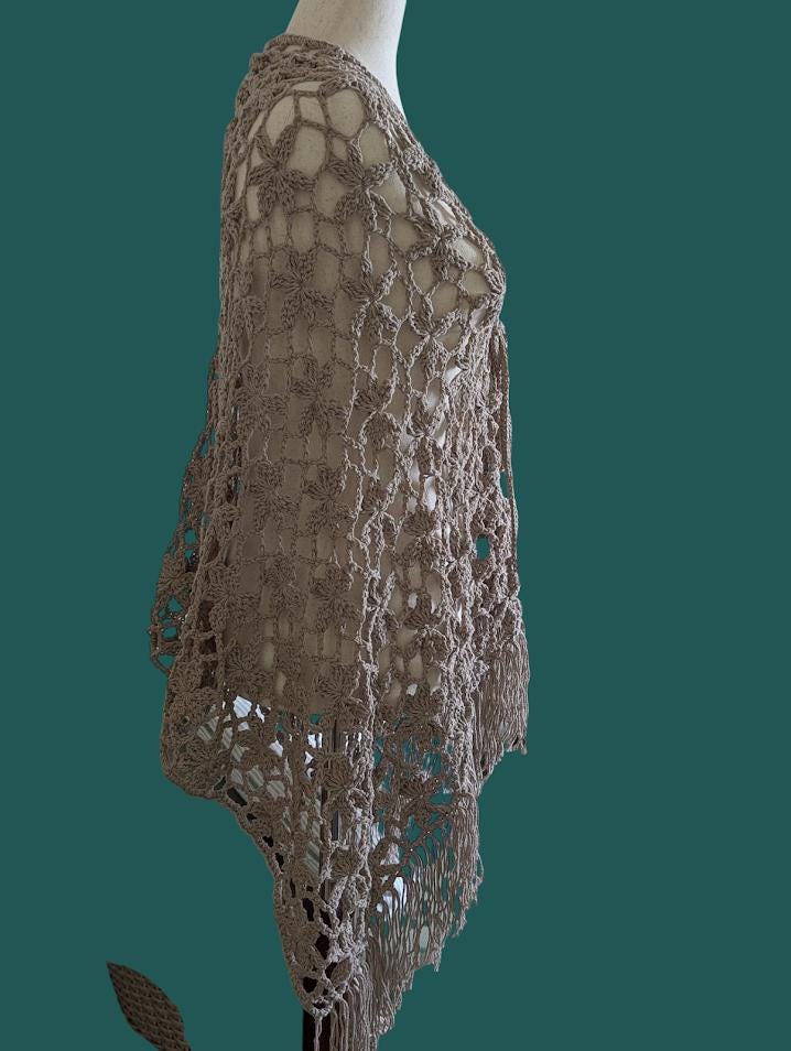 The Crochet Orchid Floral Lace Shawl is a stunning handmade piece crafted with 100% cotton yarn. Its design showcases intricate floral lace motifs, resembling delicate orchids, that create an elegant and airy texture. The shawl features a beautifully finished fringe along the bottom, adding a bohemian flair to the overall look. With its soft, breathable cotton material, it provides both comfort and style, making it a perfect accessory for layering over dresses, tops, or even casual outfits. The tie closure with wooden beads adds a natural, earthy touch, enhancing its handcrafted beauty. This shawl is a timeless accessory that elevates any outfit with a soft, feminine touch.