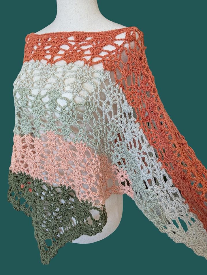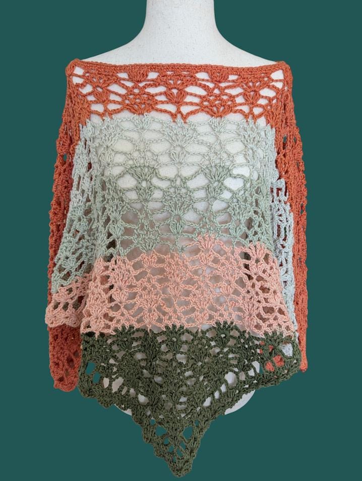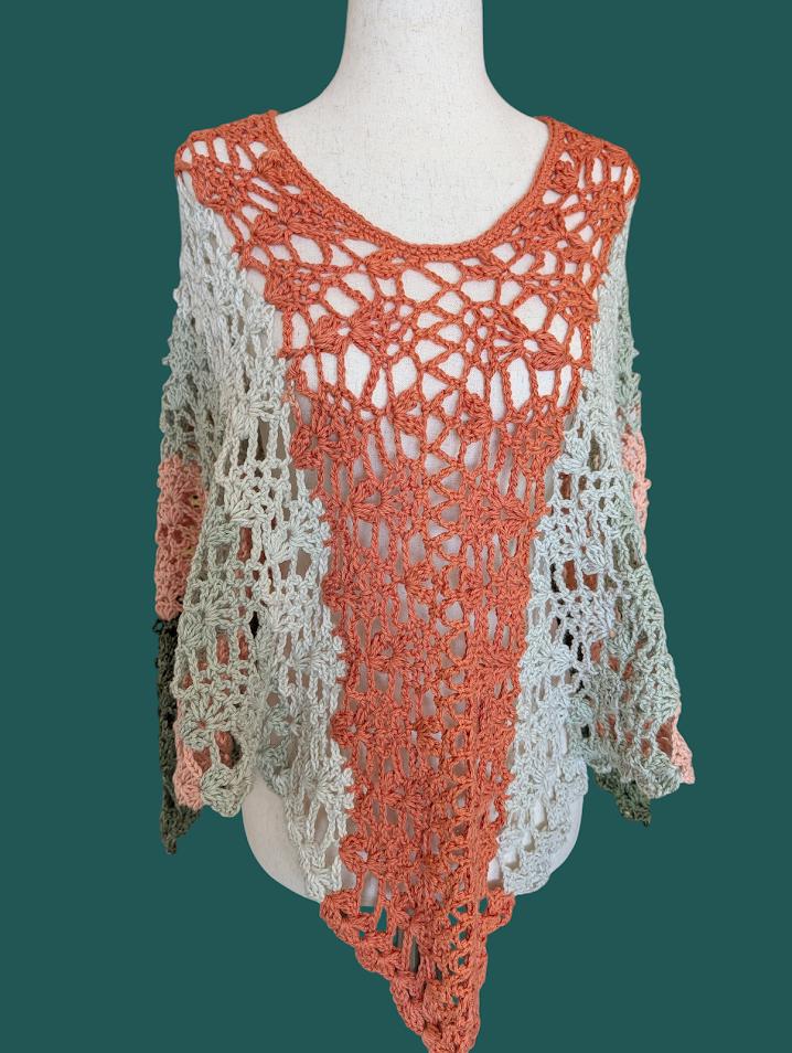 The crochet Poncho is made with 100% cotton, ensuring it is soft, breathable, and comfortable against the skin. This natural fiber provides a lightweight feel, making it ideal for layering during warmer weather while still offering warmth when needed. The cotton material also adds durability, allowing the shawl to maintain its shape and vibrancy over time.
