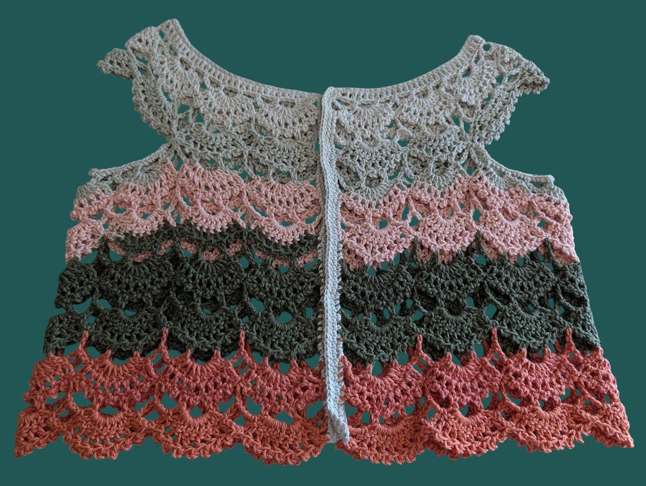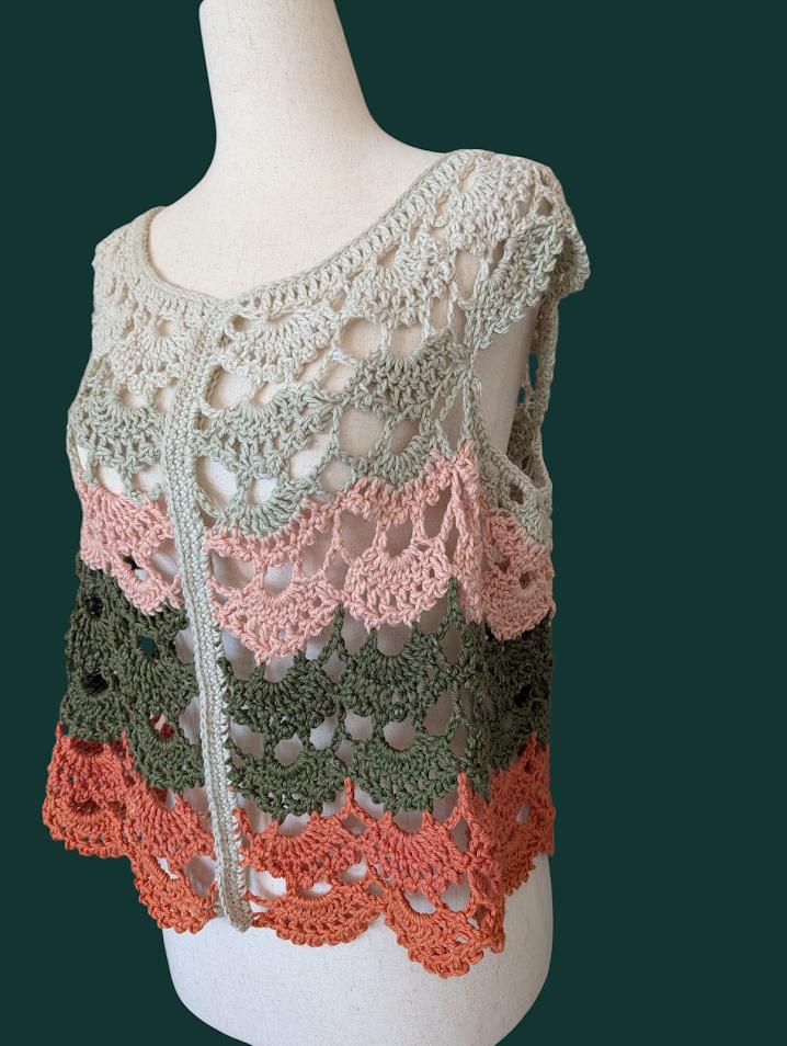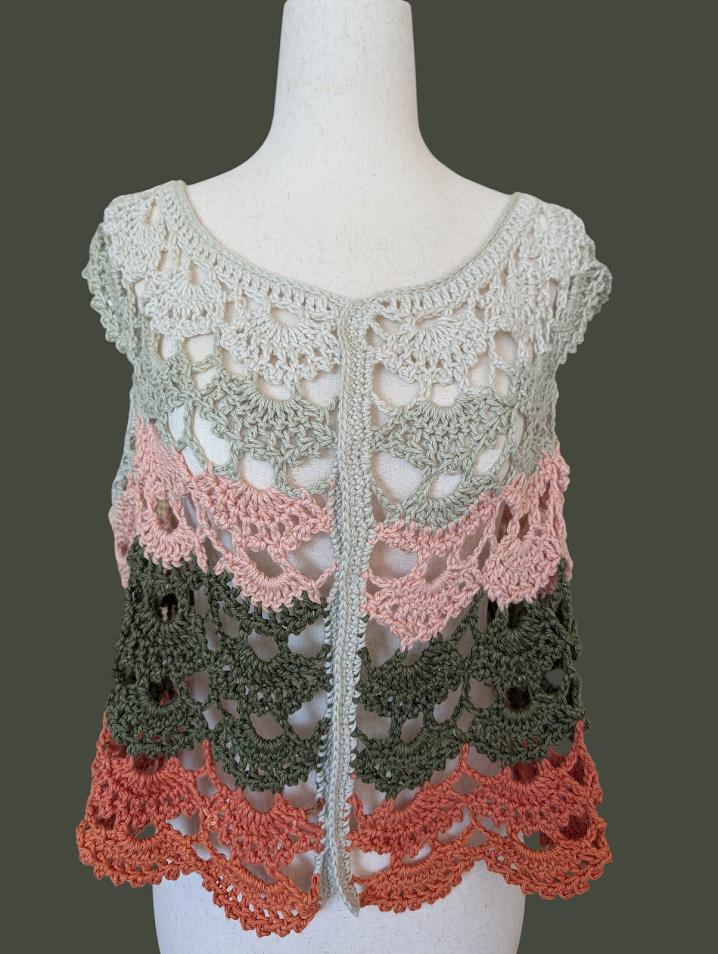 This beautiful crochet top, is made with 100% cotton, giving it a soft, breathable feel that is perfect for warm weather or layering. The intricate crochet design features a blend of earthy tones—muted greens, pinks, and oranges—that create a wave-like pattern, reminiscent of blooming flowers. The natural cotton fibers ensure comfort and durability, making it both a stylish and practical addition to your wardrobe. Ideal for casual outings or cozy days, this handmade piece exudes a relaxed, boho charm.