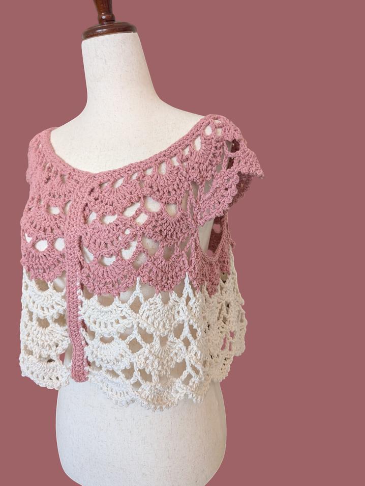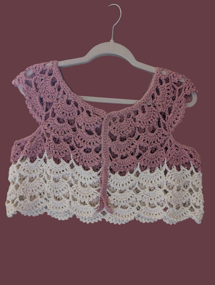 This adorable handmade crochet top could be named "Blossom Breeze". Crafted with a blend of 85% cotton and 15% polyester, it offers the perfect balance of softness and durability, making it both comfortable and easy to wear. The top features a delicate, feminine design with a scalloped crochet pattern in soft blush pink and ivory tones, creating a charming two-tone effect. Its relaxed, babydoll shape adds to the breezy, effortless vibe, making it an ideal choice for warm weather or layering over your favorite outfits. Whether for a casual outing or a day at the beach, this top brings a touch of whimsy and elegance to any look.